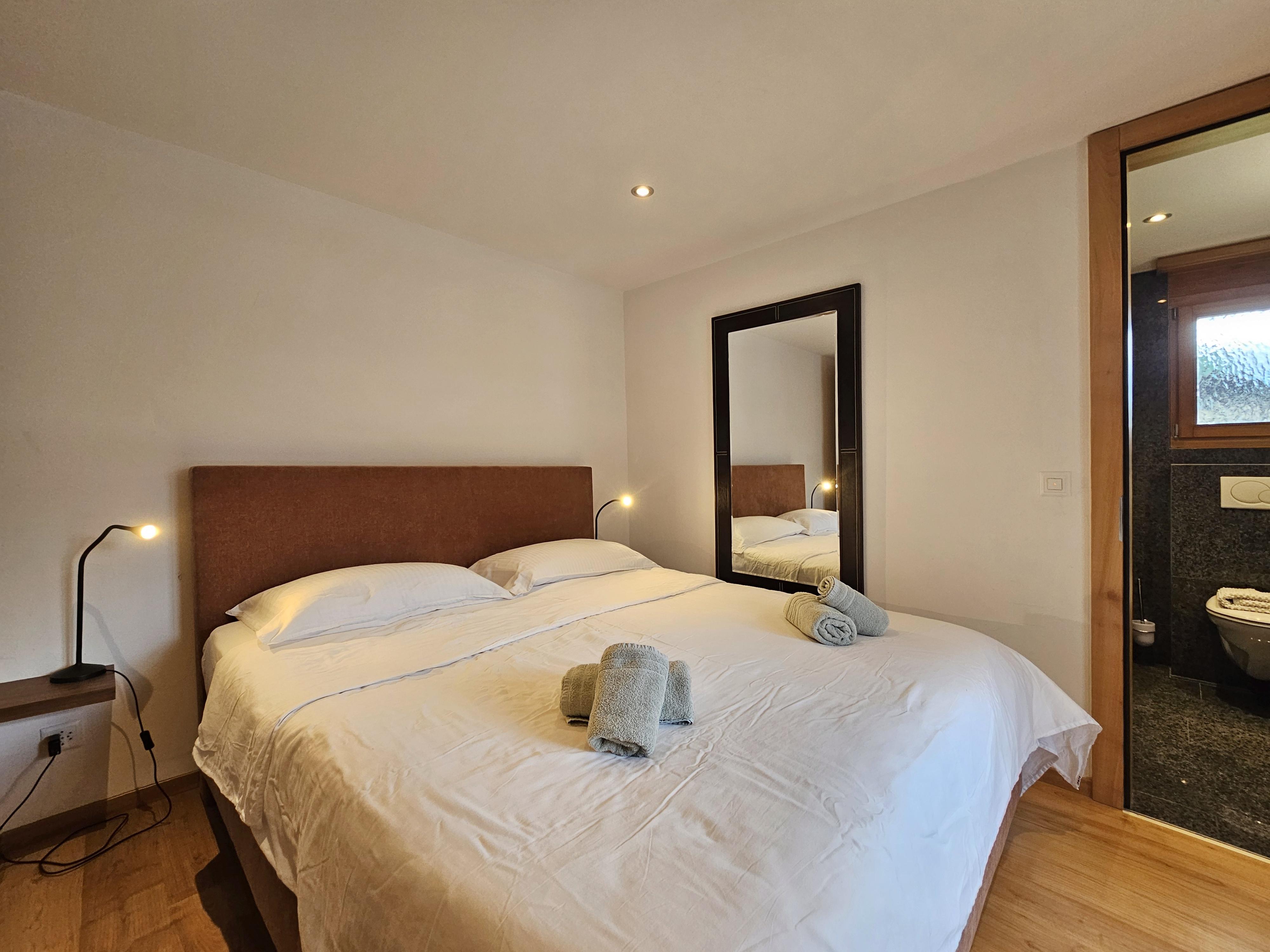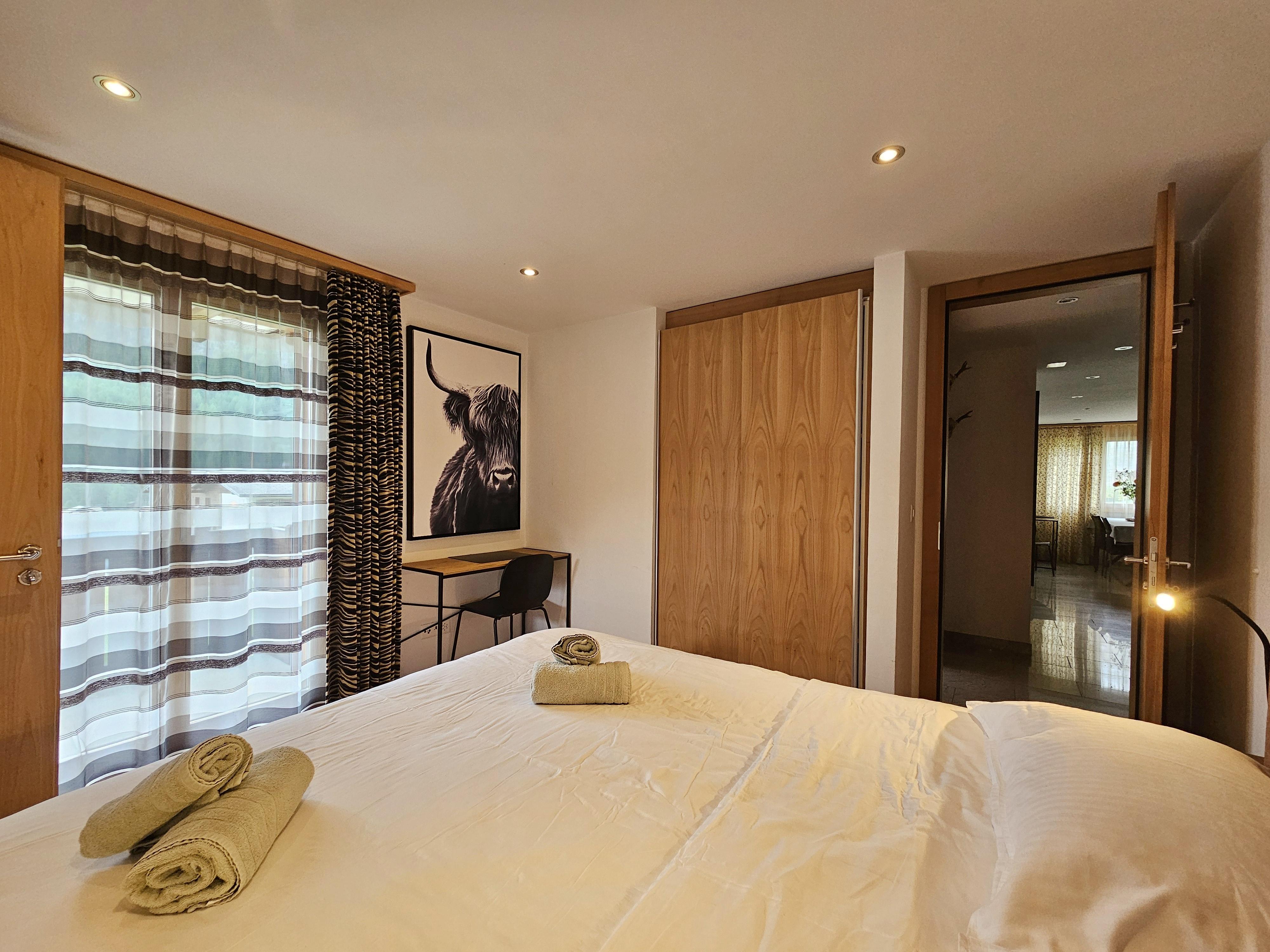 Geräumige Wohnung direkt an der Piste mit 3 Schlafzimmer. 1 Schlafzimmer hat ein Doppelbett, 2 Schlafzimmer haben 2 Einzelbetten. Jedes Schlafzimmer hat ein en-suite Badezimmer. Im Wohnbereich befindet sich die moderne, offene Küche. Die Wohnung verfügt ausserdem über einen gemütlichen Kamin. Wifi ist gratis vorhanden sowie eine Sonos Soundbar und TV. Das Haus Aramis befindet sich direkt an der Piste zu den Skiliften Stafelwald.