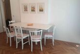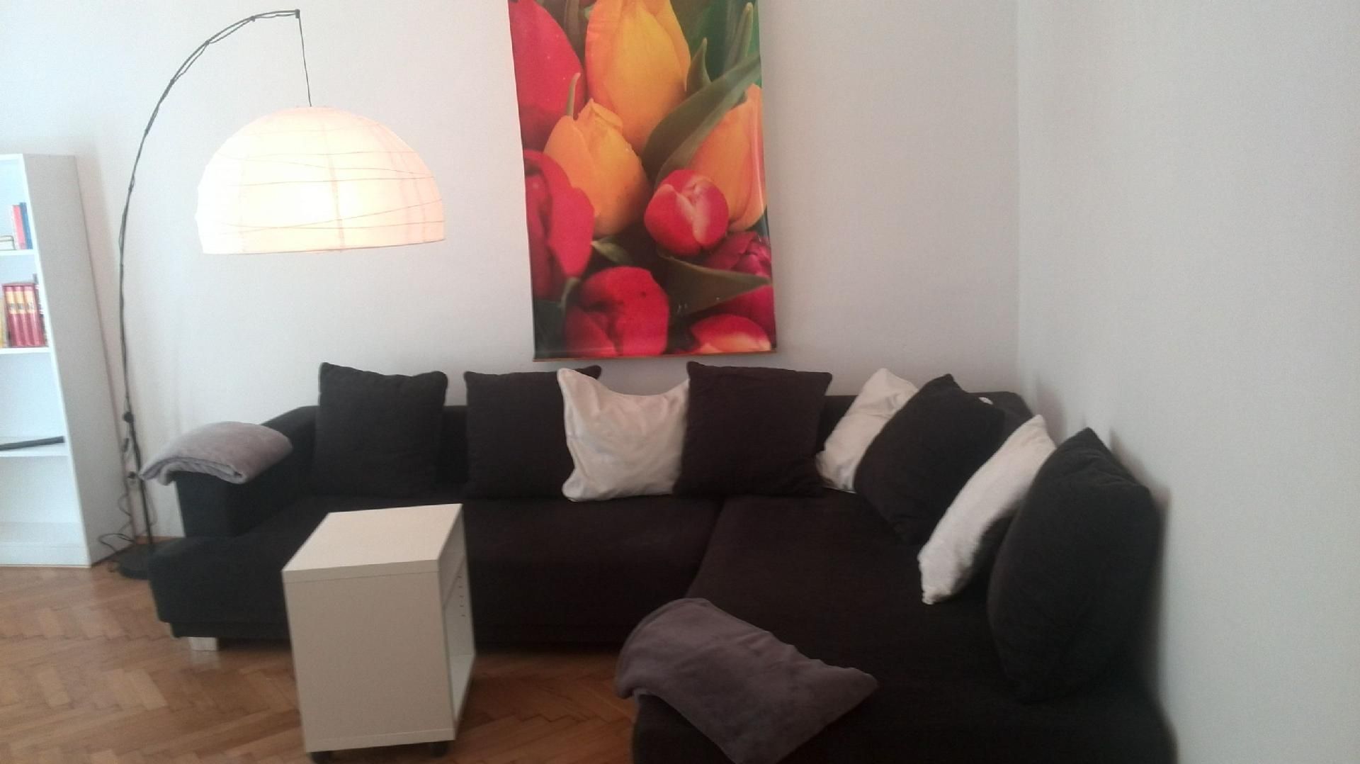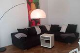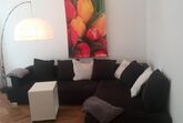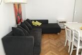 Das Wohnzimmer verfügt über einen Esstisch und eine Sitzecke, die auch für zwei Personen als Schlafcouch dienen kann. Die Fenster liegen zu einer großen, breiten Straße, daher ist es sehr hell, man hört aber auch den Verkehrslärm.