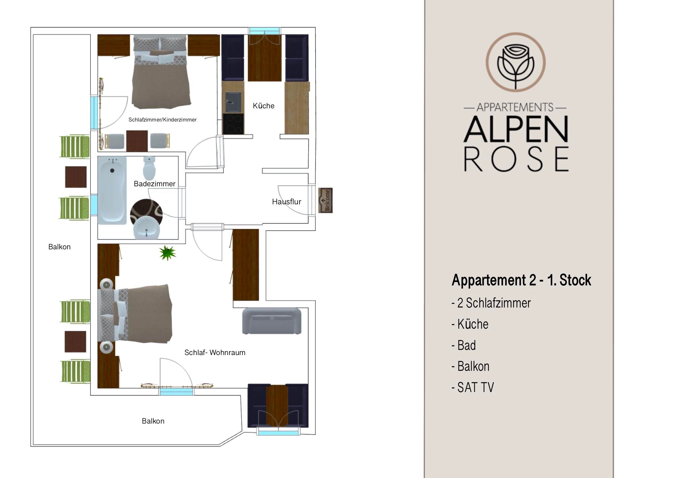 Unser Appartement 2 im ersten Stock (ca. 40 m²) für 2-4 Personen verfügt über: 2 Schlafzimmer mit Sat-TV, 1 Wohnküche mit vollausgestatteter Kochnische (Cerankochfeld, Geschirrspülmaschine, Wasserkocher, Mikrowelle, Kaffeemaschine uvm.) Safe und gemütlicher Sitzecke, 1 Badezimmer mit Badewanne inklusive Duschmöglichkeit, WC und möbliertem Balkon.