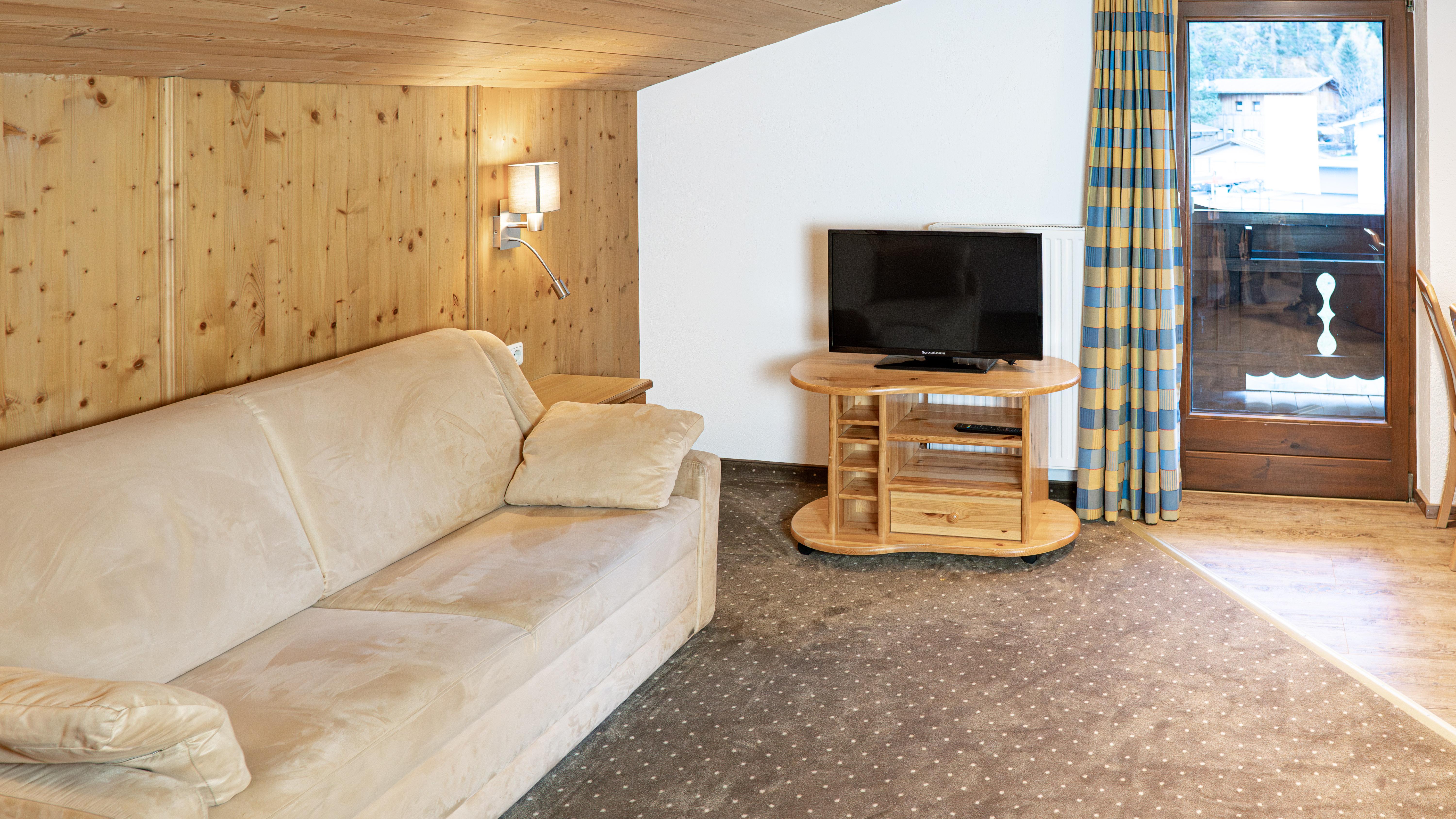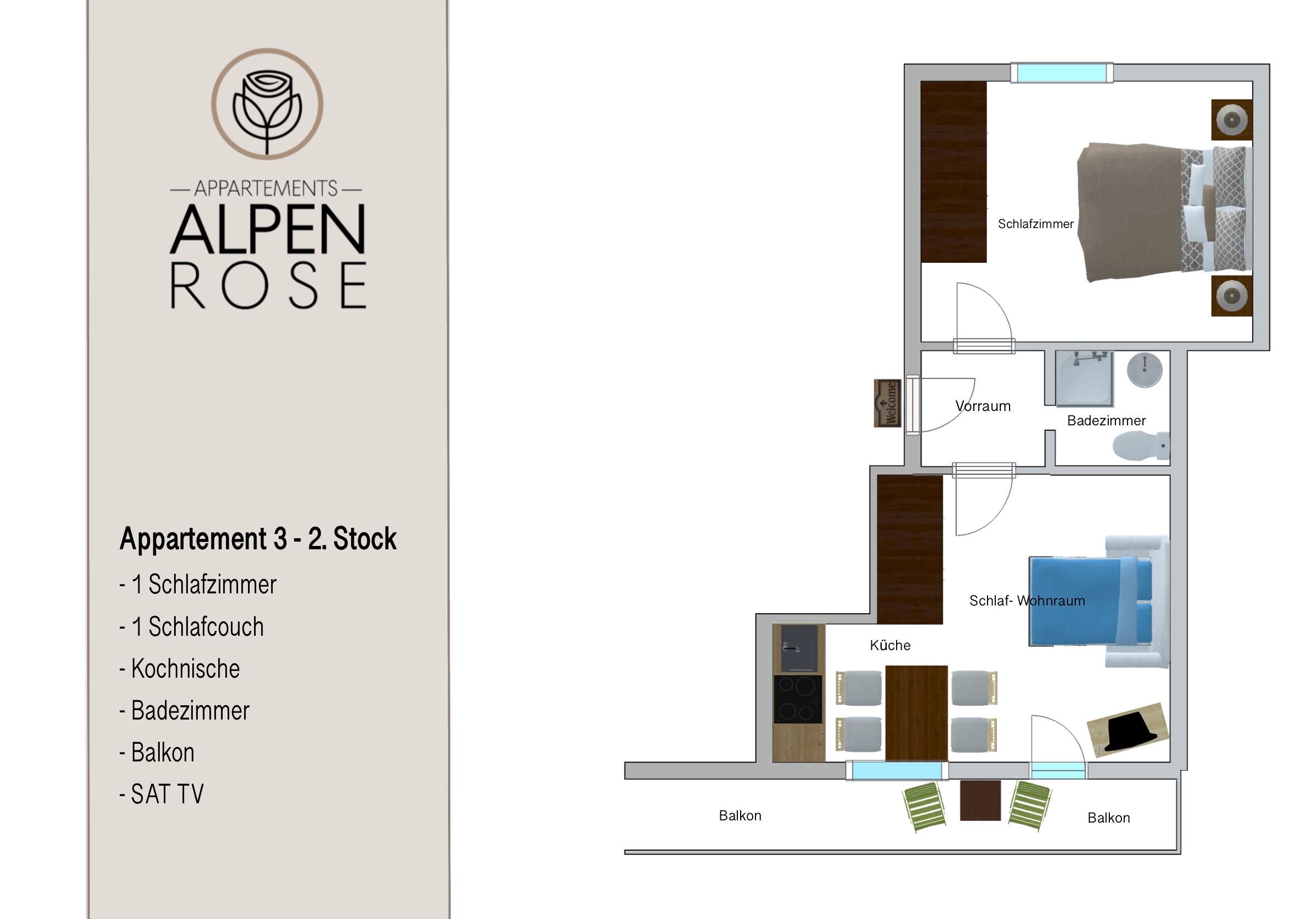 Das Appartement 3 im 2. Stock (ca. 35 m²) für 2-3 Personen und verfügt über 1 Schlafzimmer, 1 Wohnschlafraum mit ausziehbarer Couch und Kochnische mit Spülmaschine, Cerankochfeld, Kaffeemaschine, Wasserkocher u.v.m., Badezimmer mit Dusche/WC, Sat-TV, Safe und möbliertem Balkon.