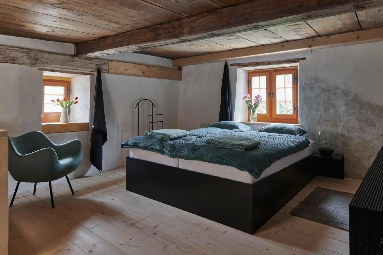 Extras: Generell gut lüften, in der Chambre Basse weist die Raumhöhe beim Deckenbalken lediglich 1.60m auf. Der Zugang zur Chambre Basse ist hinter dem Ofen und eng und steil, mehrere, kleine Gepäckstücke werden empfohlen (statt ein Grosses). In der Chambre haute gibt es eine Schwelle mittig im Raum, zudem ist dort der Boden sehr uneben.