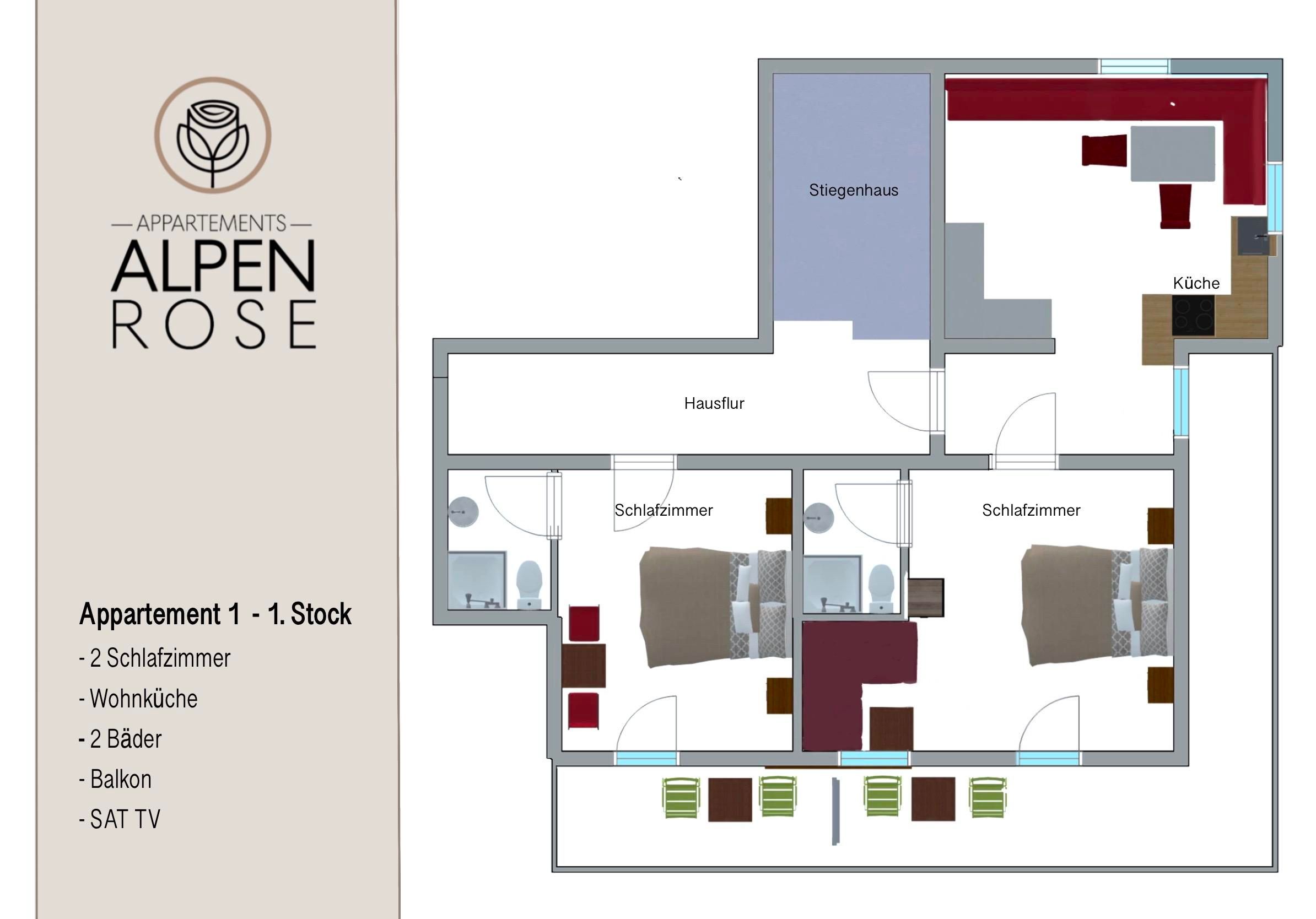 Das gemütliche Appartement 1 mit ca. 55 m² befindet sich im ersten Stock und besteht aus: einer grosszügigen Wohnküche mit Essecke, Safe, Sat-TV, Geschirrspüler, Cerankochfeld, Kaffeemaschine, Wasserkocher, Mikrowelle, einem Doppelzimmer mit DU/WC und Sat-TV. Ab 3 Personen: 1 zusätzliches Doppelzimmer mit DU/WC, Sat-TV und Balkon direkt nebenan.