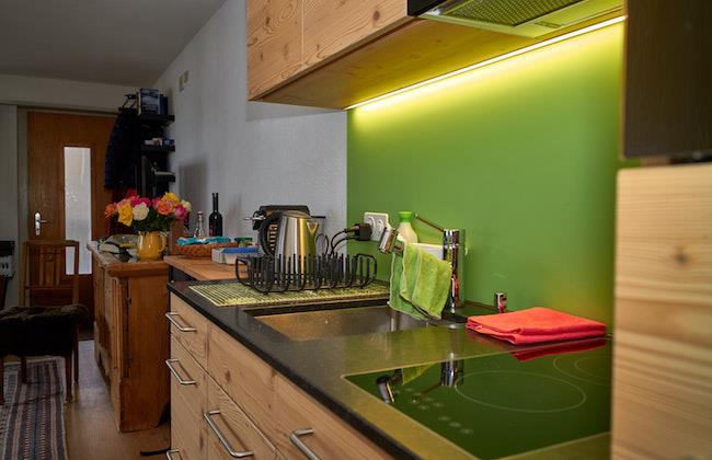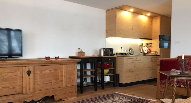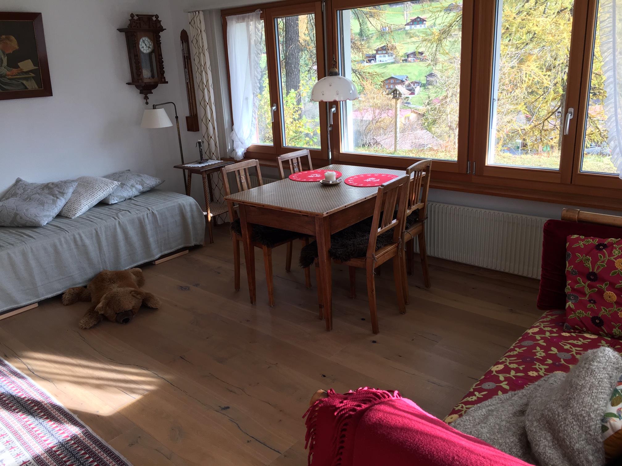 Möblieret 2-Zimmerwohnung (Nichtraucherwohnung) im Chalet „Bärgfink“ mit Wohn-/Essraum, Doppelschlafzimmer, 1 Bett (plus Reservebett ausziehbar) im Wohnzimmer. Voll ausgerüstete Küche mit 3-Herdplatten, Backofen, Kühlschrank, Nespresso-Kaffeemaschine etc. Badezimmer mit Lavabo, WC und Dusche. Fernseher mit Radio, WLAN, Aussensitzplatz teilweise gedeckt und Garten. Separater Abstellraum (Technikraum) und Mitbenutzung Waschmaschine/Tumbler im Keller