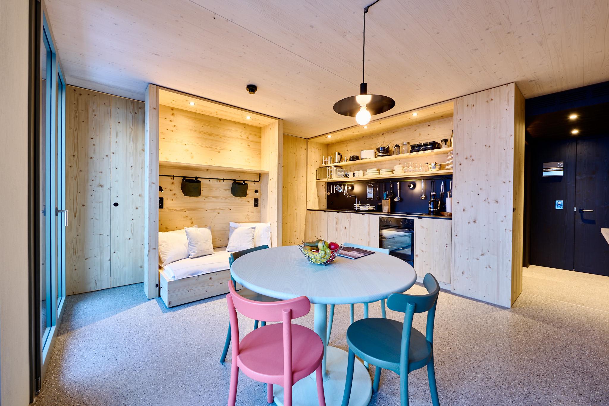 Freue dich auf ein «Mountain Loft Apartment» für bis zu 6 Personen mit voll ausgestatteter Küche inklusive Abwaschmaschine, Mikrowelle, Backofen, Kaffeemaschine, Fondue- und Chinoise-Caquelon sowie Raclette-Ofen. Auf dich wartet ein abtrennbares Schlafzimmer mit komfortablem Doppelbett sowie einem Etagenbett. Der gemütliche Wohnbereich mit Esstisch umfasst ein Smartroom-TV mit Streaming-Möglichkeit für alle Mobilgeräte und eine Chill-Ecke, welche mit wenigen Handgriffen zu einem weiteren hochwertigen Doppelbett umfunktioniert werden kann. Zusätzlich profitierst Du von einer Dusche mit separatem WC, einem kleinen Balkon und kostenlosem highspeed W-LAN für mehrere Endgeräte.