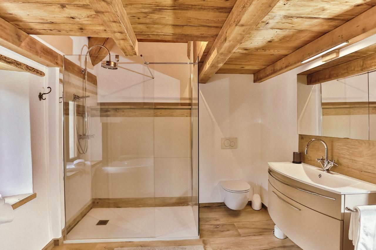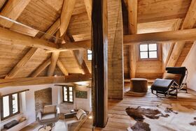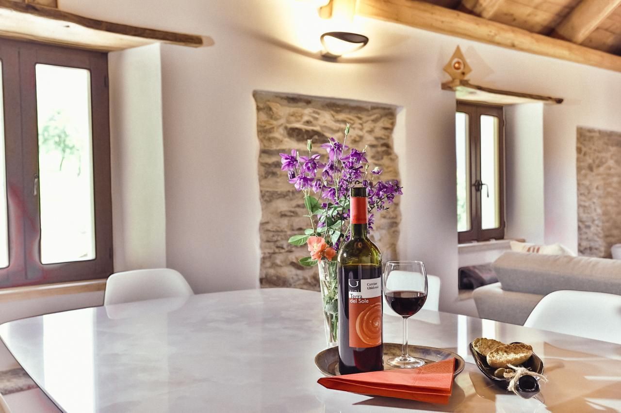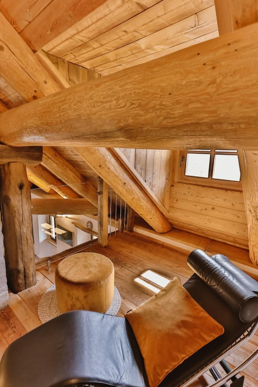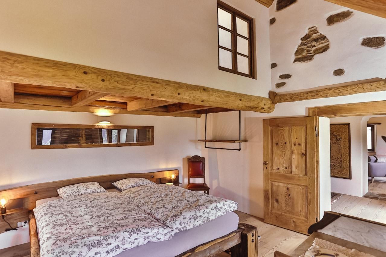 Das Dachgeschoss empfängt seine Gäste in großzügigen, lichtdurchfluteten Räumen und zeichnet sich durch die gekonnte Verbindung von antiken Elementen (massive Steinmauern, Sichtbalken, restaurierte Türen und Details) mit modernem Komfort (offene Küche, Kaminofen, Badewanne mit Hydromassage und Erlebnisdusche) aus. Auch die Einrichtung ist eine Mischung aus Tradition und Moderne: raffiniert und funktionell zugleich, damit die Gäste die besondere Energie, die das Haus freisetzt, voll und ganz genießen können.