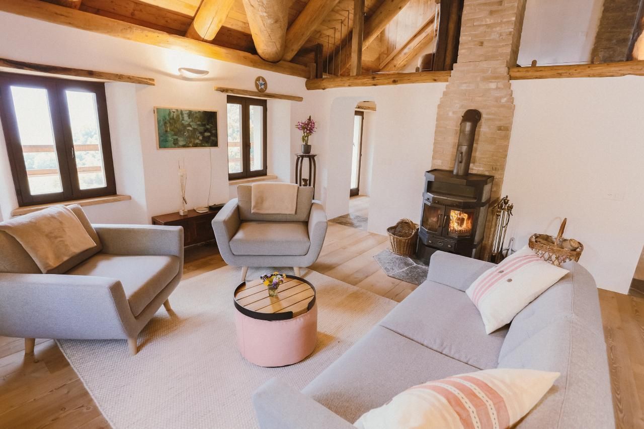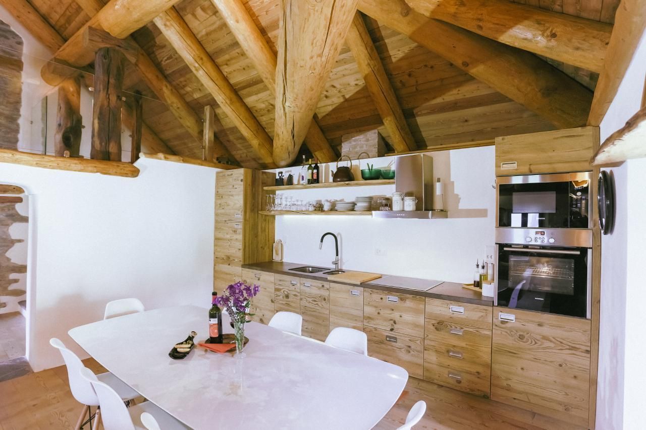 Der Grundriss ist auf zwei Ebenen strukturiert, mit einem großen, offenen Loft in der Mitte, das durch eine antike Granittreppe verbunden ist. Auf der ersten Ebene befinden sich die Massivholzküche, das geräumige Wohnzimmer, das Hauptschlafzimmer und das Badezimmer mit einem separaten zusätzlichen WC. Die zweite Ebene beherbergt einen großen Dachboden, der als Lesezimmer genutzt wird, und ein besonderes Dachzimmer mit einem runden Bett, einem dritten Zusatzbett und einem Blick auf den Sternenhimmel dank zweier besonderer Deckenfenster. Die Wohnung verfügt außerdem über einen Außenbalkon (eine typische Terrasse aus der Zeit), der exklusiv genutzt werden kann und einen herrlichen Blick auf das Panorama und die umliegenden Berge bietet. Die alten Gewölbekeller des Gebäudes sind ebenfalls zugänglich und bieten die Möglichkeit, einige lokale Köstlichkeiten (Käse, Wein usw.) zu servieren. Von hier aus kann man den gemeinsamen Garten des Hauses erreichen und genießen.