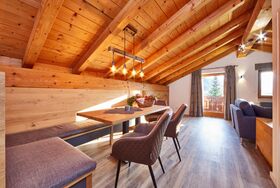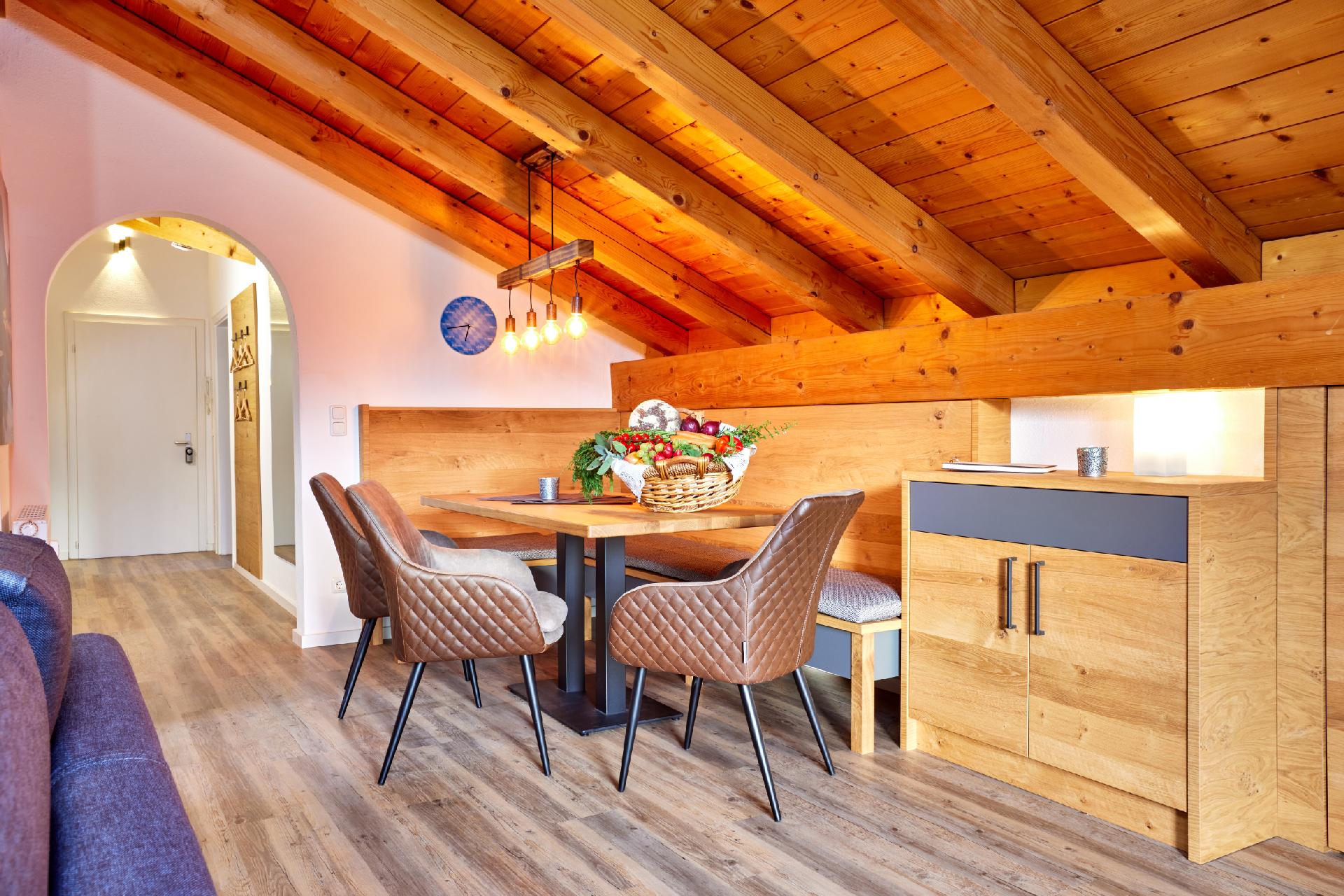 Die gemütliche Eckbank mit großem Esstisch und die Auszugsschränke in den Dachschrägen runden das harmonische Ambiente ab.