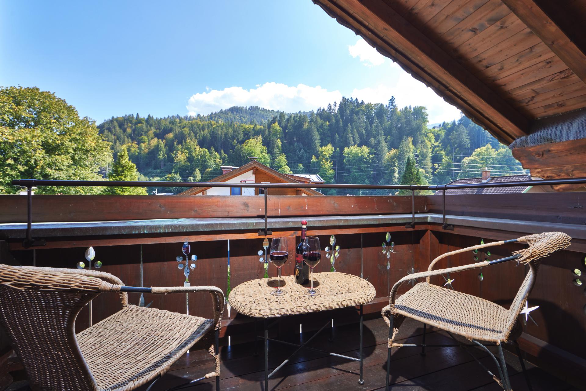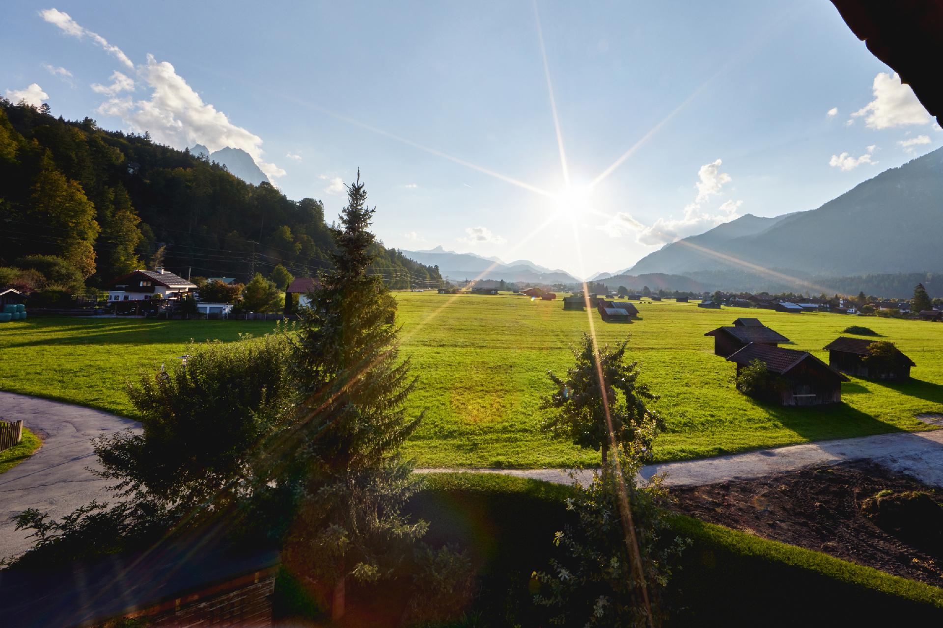 Der vom Wohn-Essbereich zugängliche, vollständig überdachte Westbalkon bietet einen weitläufigen und unverbauten Blick auf die Wiesen am südlichen Ortsrand sowie die Werdenfelser und Tiroler Bergwelt.