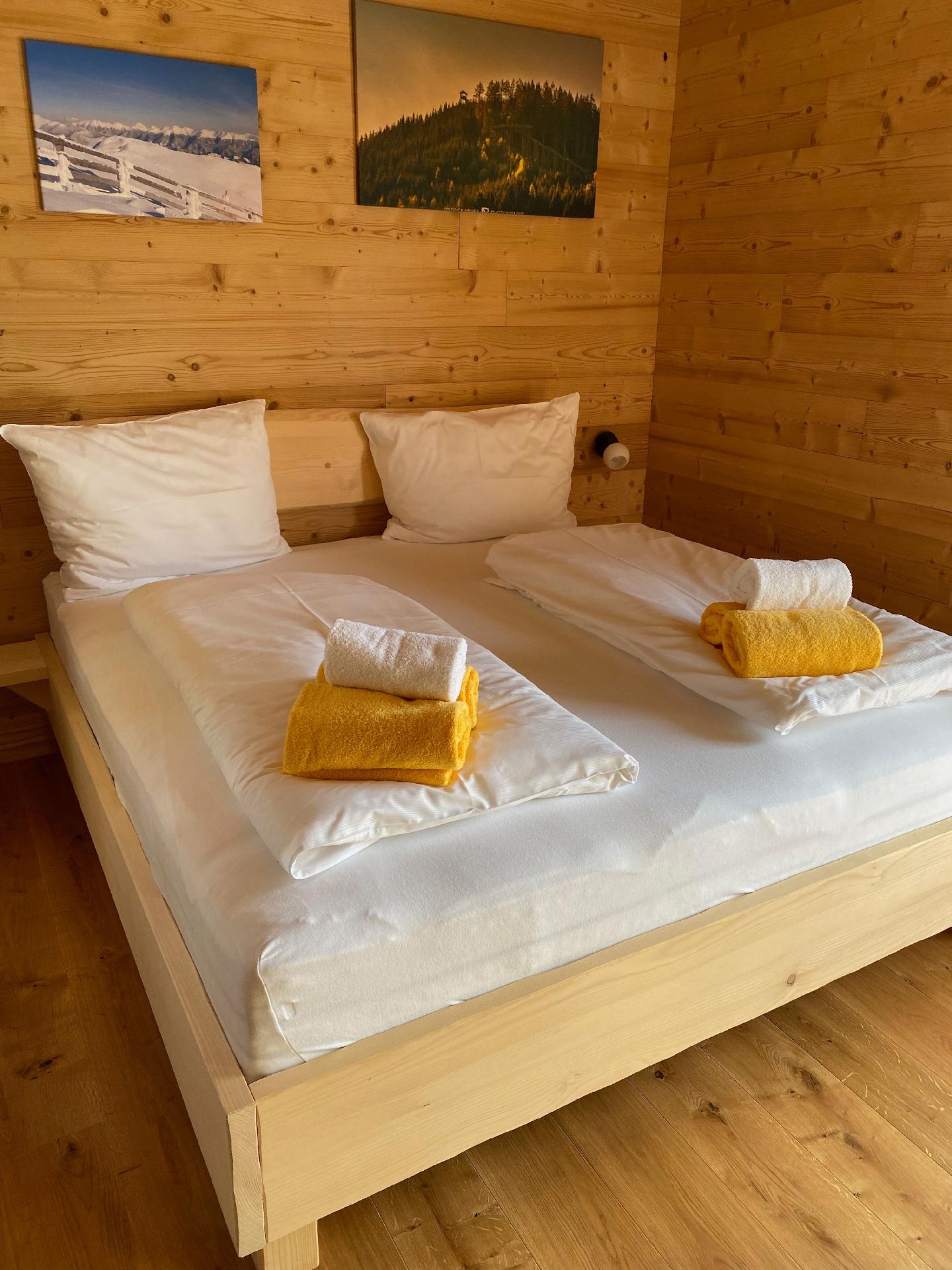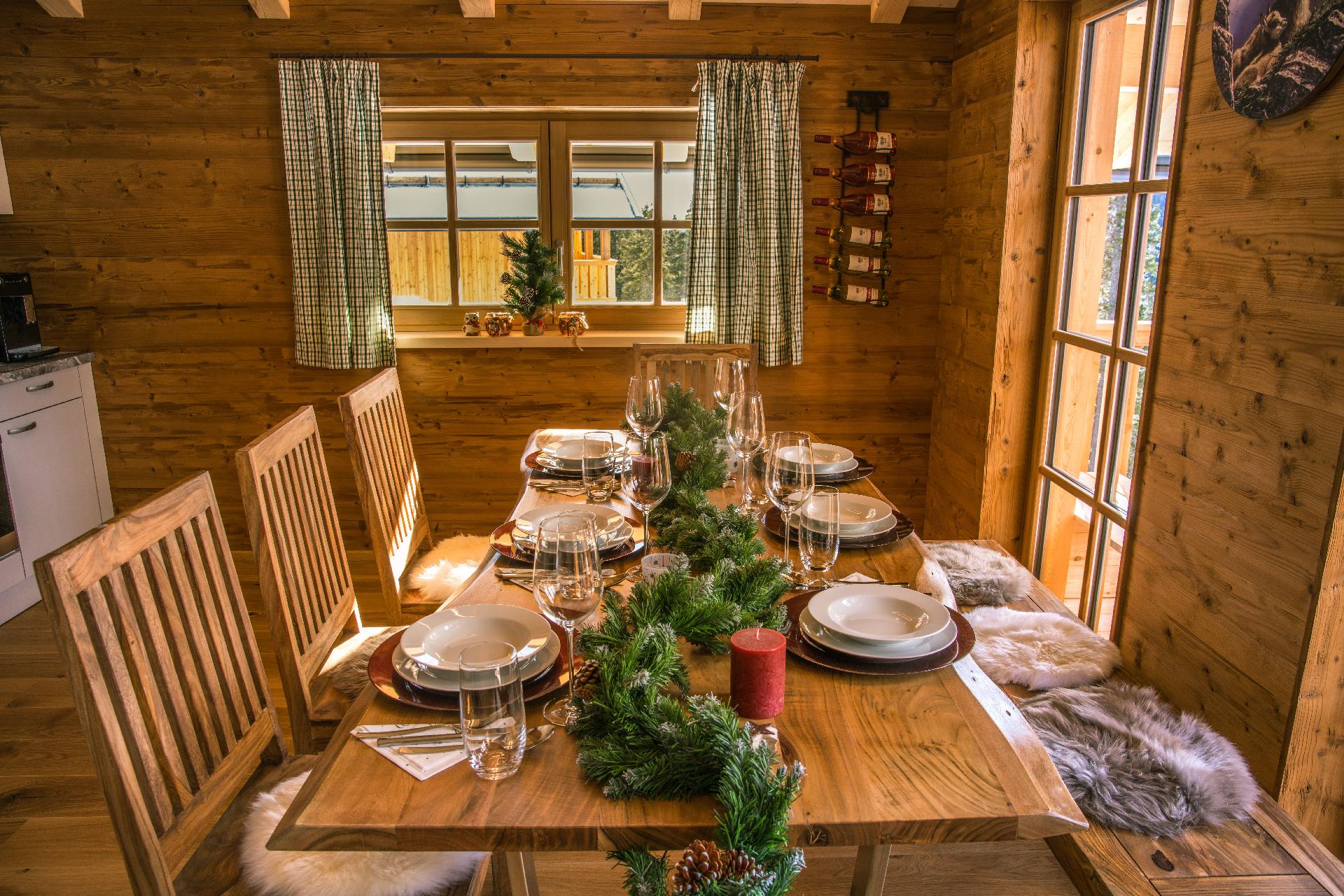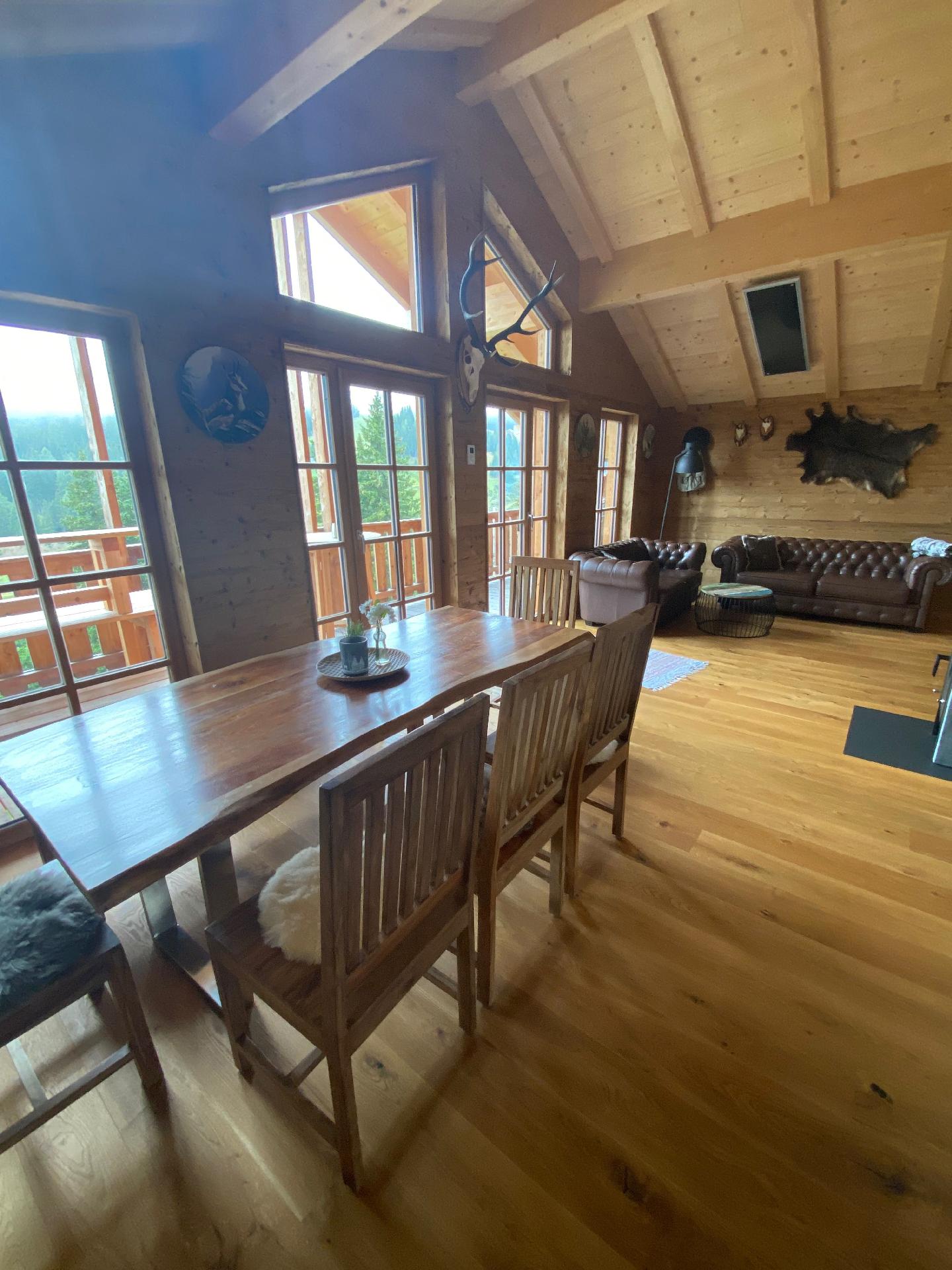 Unsere Jagdhütte verfügt über einen großzügigen Wohn-Essbereich mit Panoramafenster auf die umliegende Bergwelt, eine komplett eingerichtete Küche, einen Kaminofen für kuschelige Wärme, vier Doppelschlafzimmer mit Sat-TV und eigenem kleinen Bad, sowie teilweise kleiner Terrasse, eine Sauna sowie einen Ski- und ttwäsche und Handtücher sind vorhanden. Bademäntel können gegen eine Gebühr gebucht werden.