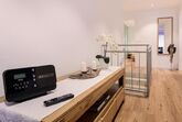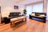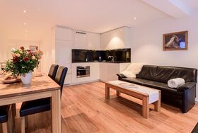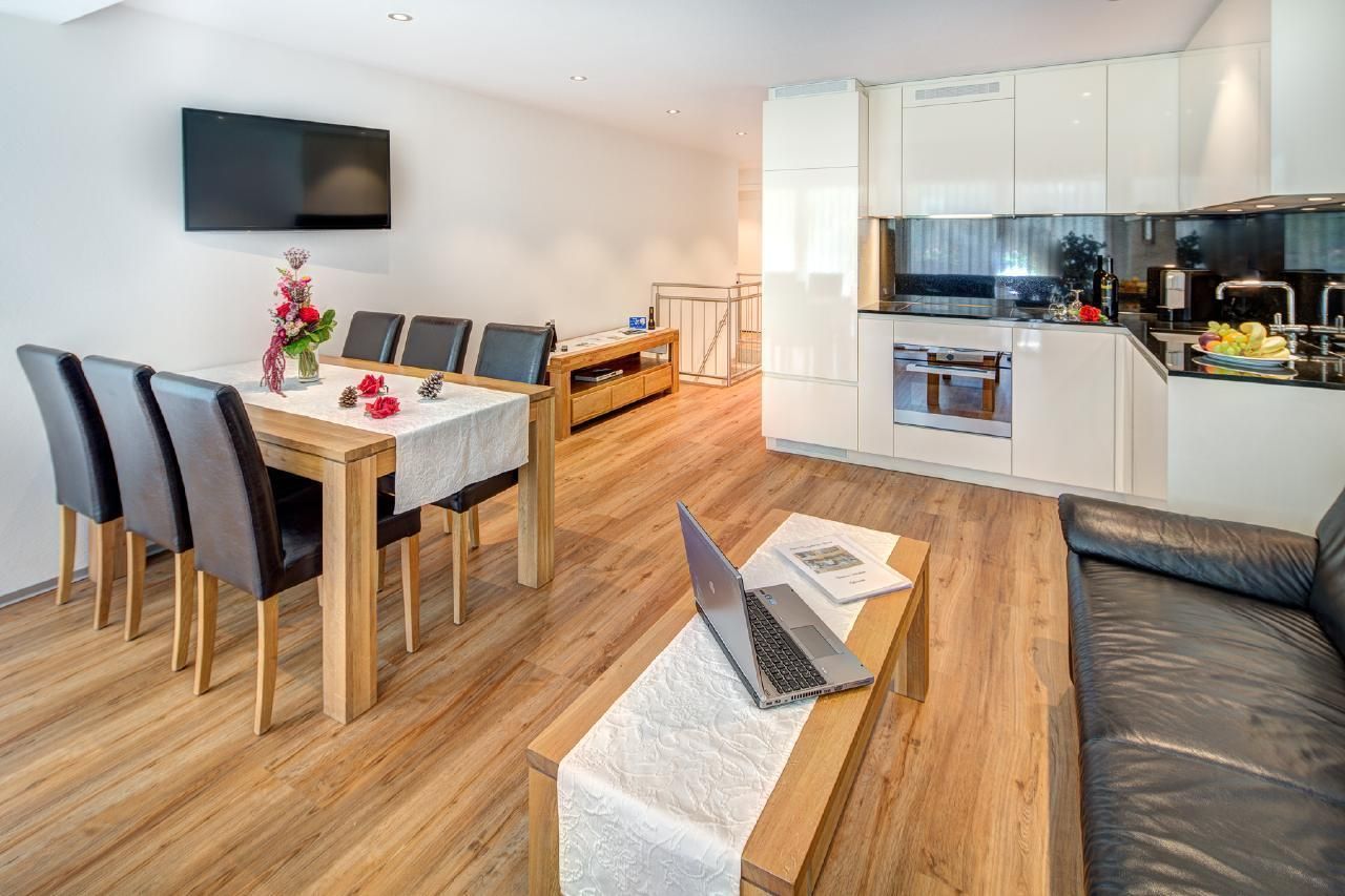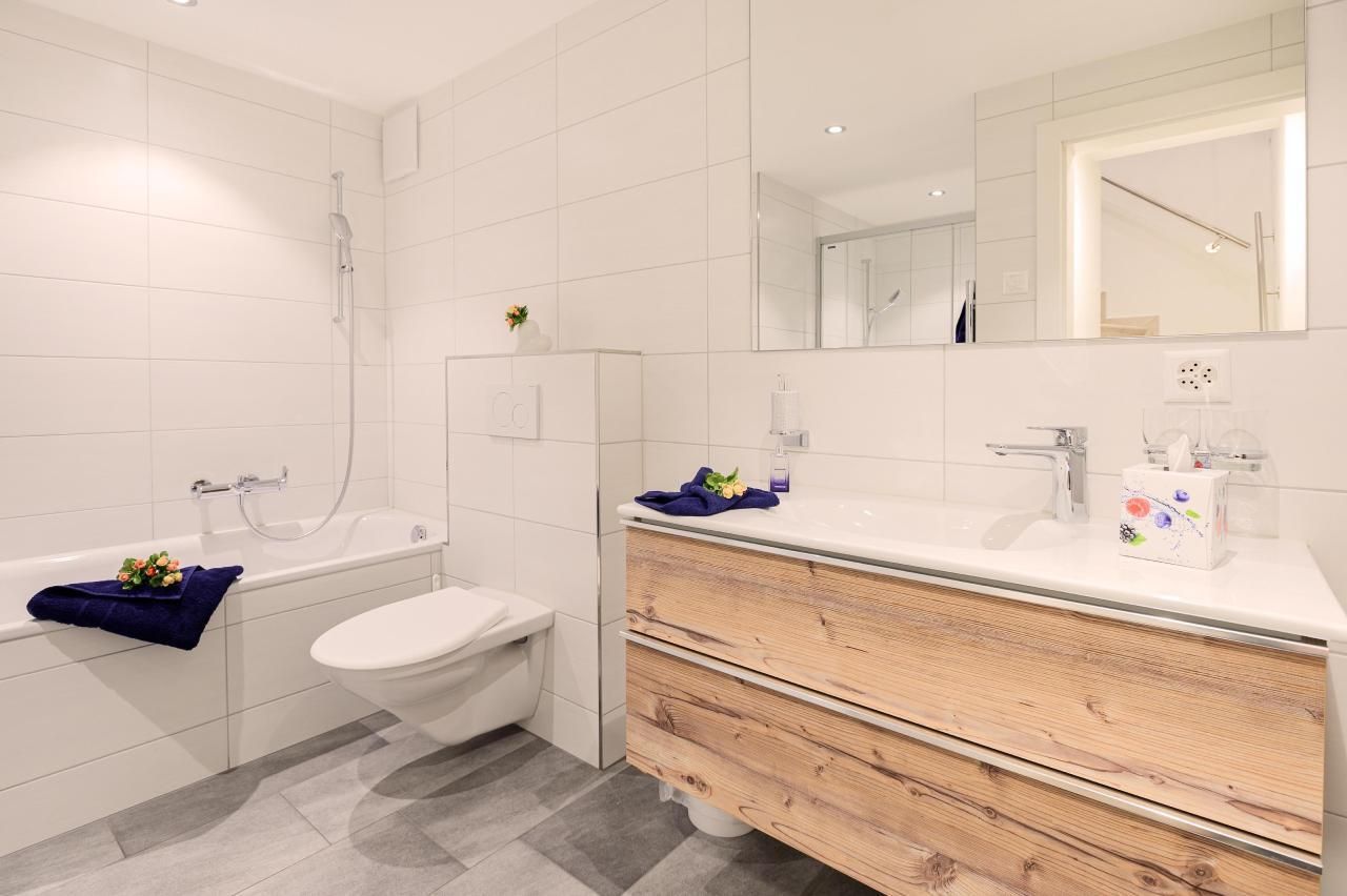 Innen wird die Ferienwohnung durch eine gelungene Aufteilung und eine wohl durchdachte Ausstattung charakterisiert. Die drei gemütlichen Schlafzimmer sind jeweils mit einem Flachbildschirm ausgestattet und garantieren erholsame Nächte. Zwei der Schlafzimmer verfügen zudem über ein eigenes Badezimmer mit Dusche/WC und Haartrockner, während das dritte Schlafzimmer im Untergeschoss zusätzlich eine Badewanne mit Duschvorrichtung bietet. Die offene Küche ist vollständig ausgestattet inklusive Kapselkaffeemaschine, Geschirrspüler und Mikrowelle, ideal für das Zubereiten von Mahlzeiten in geselliger Runde.