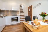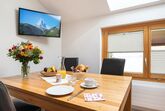 Im Inneren des Ferienhauses finden Sie eine sorgfältig durchdachte Innenausstattung vor, die sowohl praktisch als auch einladend ist. Die Wohnung verfügt über zwei Schlafzimmer, wobei eines im Dachgeschoss liegt und durch eine Treppe erreichbar ist, sowie ein Badezimmer mit Badewanne und Duschvorrichtung. Die offene Küche ist voll ausgerüstet mit allem, was zum Zubereiten von Mahlzeiten benötigt wird, einschließlich Backofen/Mikrowelle, Geschirrspüler, Kapselkaffeemaschine und Wasserkocher. Zusätzlich stehen Ihnen ein Esstisch, WLAN und mehrere Flachbildschirme zur Verfügung, um Ihren Aufenthalt so angenehm wie möglich zu gestalten.