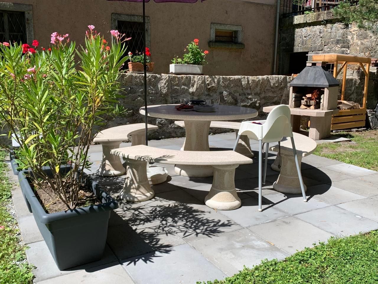 Der äußere Bereich der Ferienwohnung zeichnet sich durch einen Gartenanteil zur gemeinschaftlichen Nutzung aus, einschließlich einer Grillstelle, an der man gemütlich zusammenkommen kann. Die Parkplätze gegenüber dem Haus (gekennzeichnet durch weiße Markierungen) bieten eine bequeme Parkmöglichkeit. Es gibt ebenso eine Abstellmöglichkeit für Fahrräder und nach Anfrage dürfen Haustiere gegen eine Gebühr mitgebracht werden.
