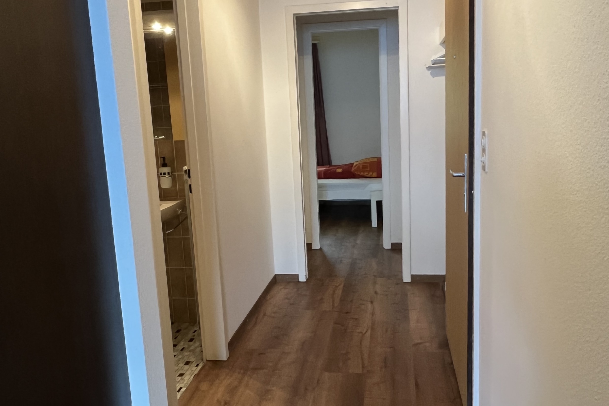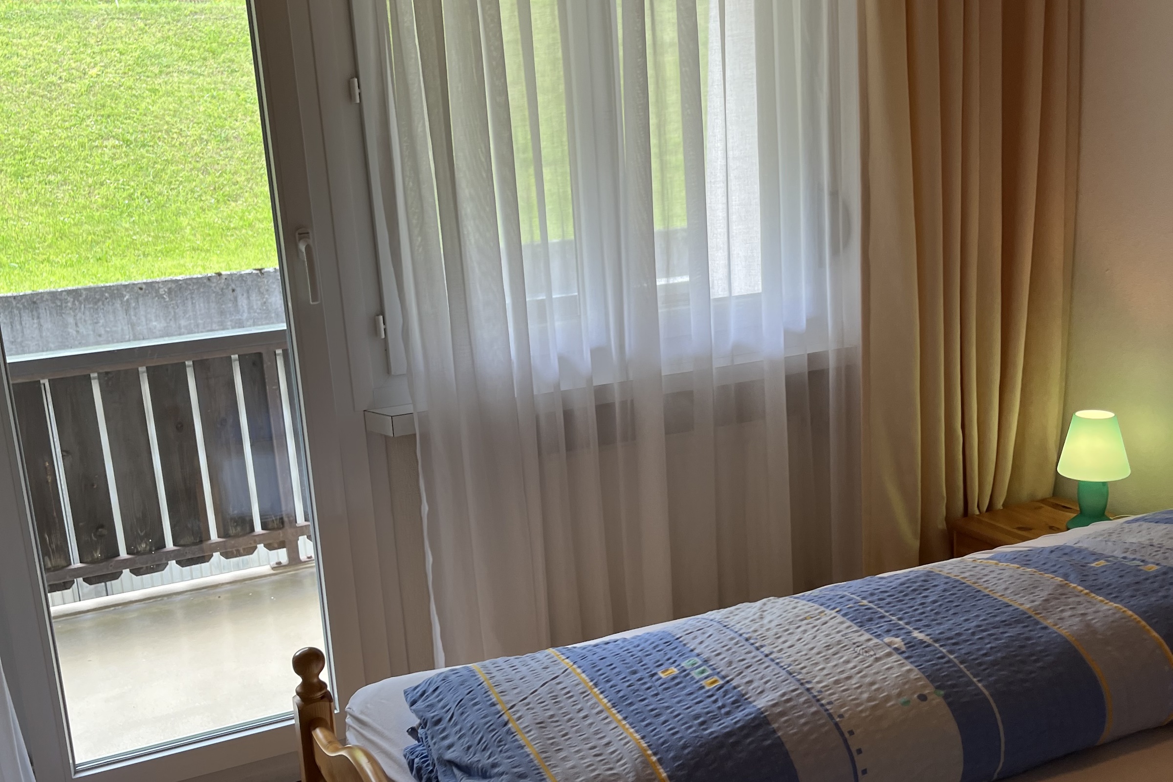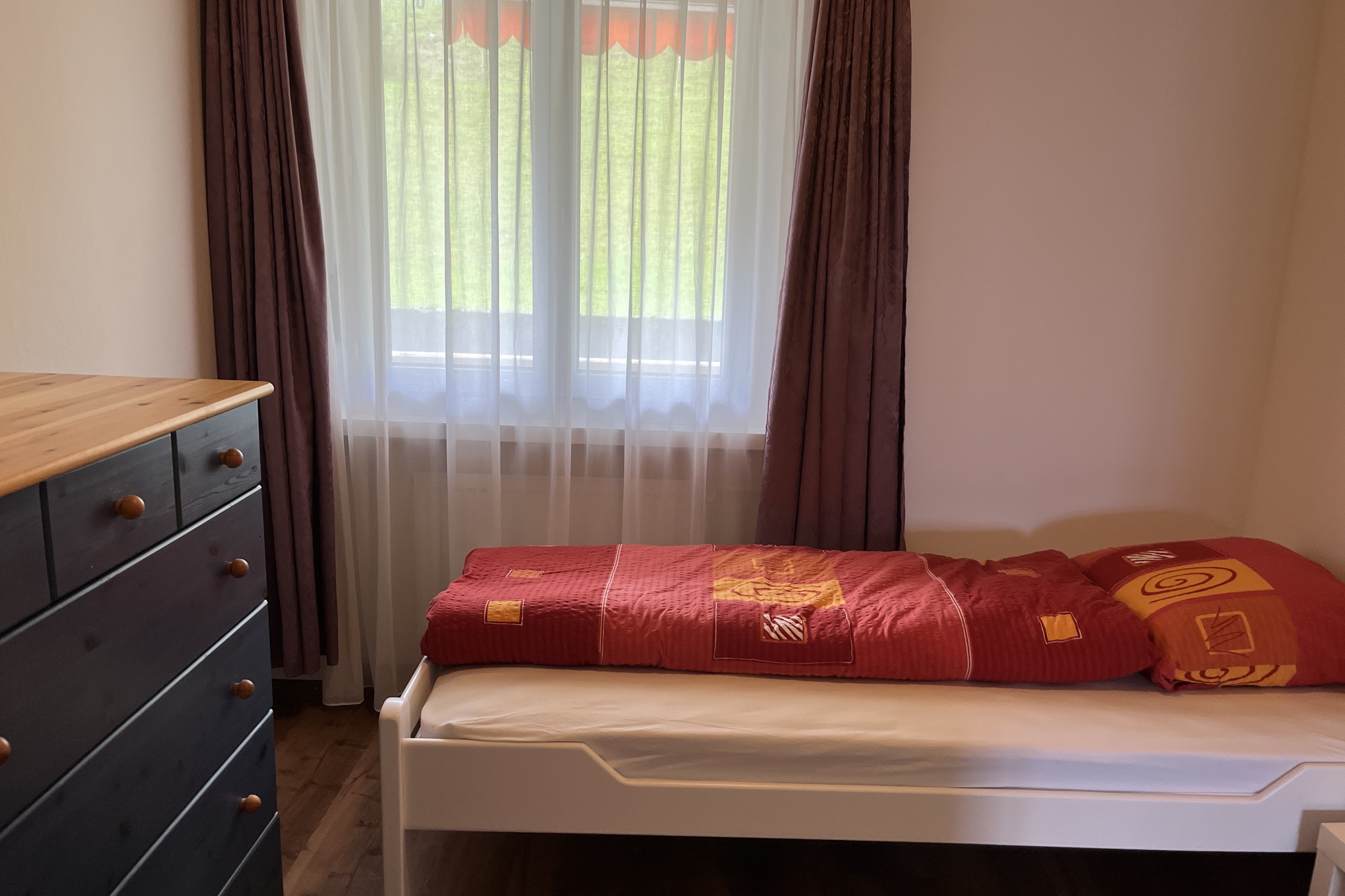 Die Ferienwohnung verfügt über Zwei Schlafzimmer mit je 2 Betten (Babybett vorhanden) ein Badezimmer mit Badewanne, WC und Lavabo ein Wohn-/Esszimmer eine offene und moderne Küche Inneneinrichtung und Technik Die moderne Ferienwohnung im ersten Stock wurde im Jahr 2022 neu renoviert und ist mit einem schönen dunklen Laminatboden ausgestattet. WLAN steht kostenfrei zur Verfügung, Flatscreen-TV mit Kabelanschluss und Radio.