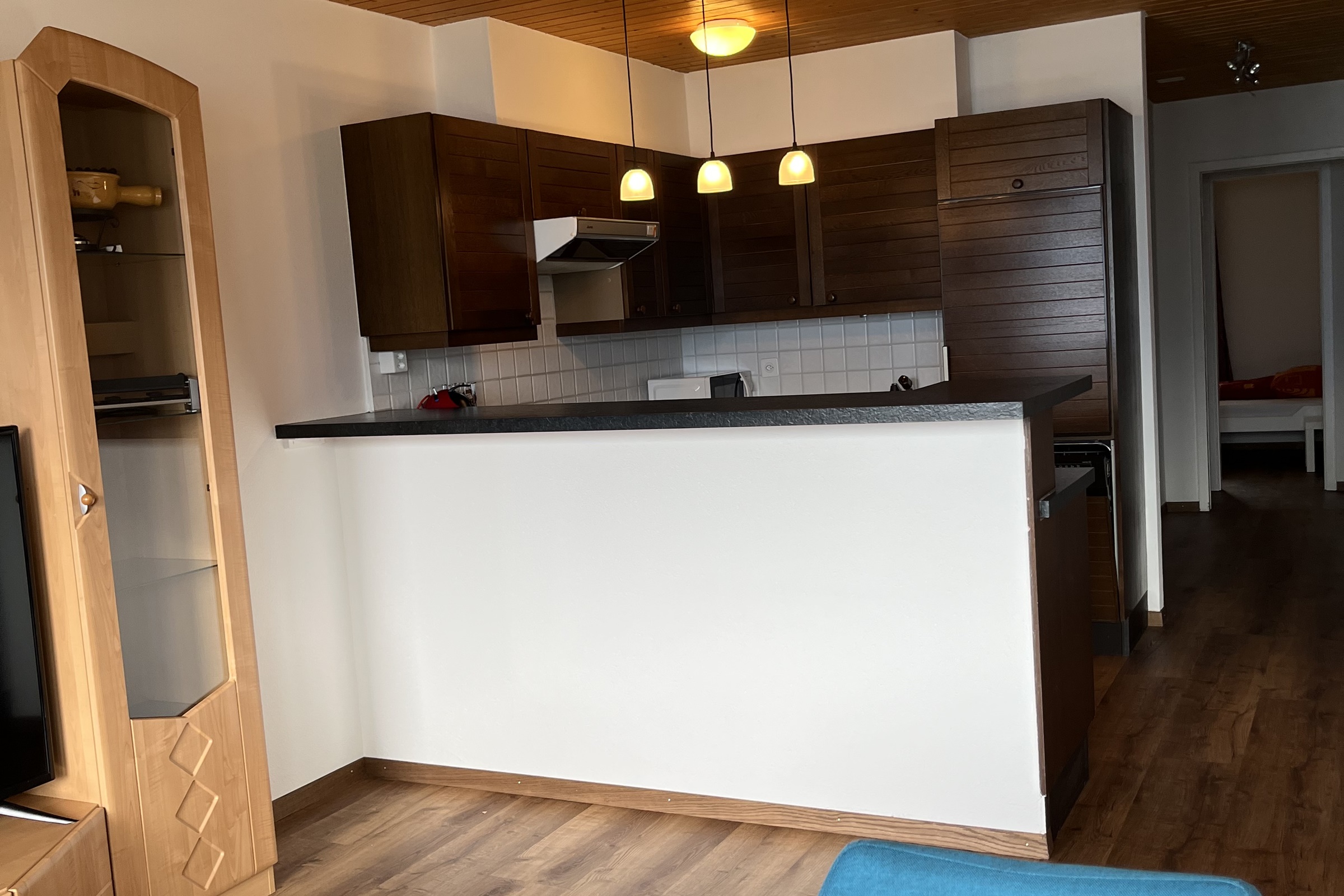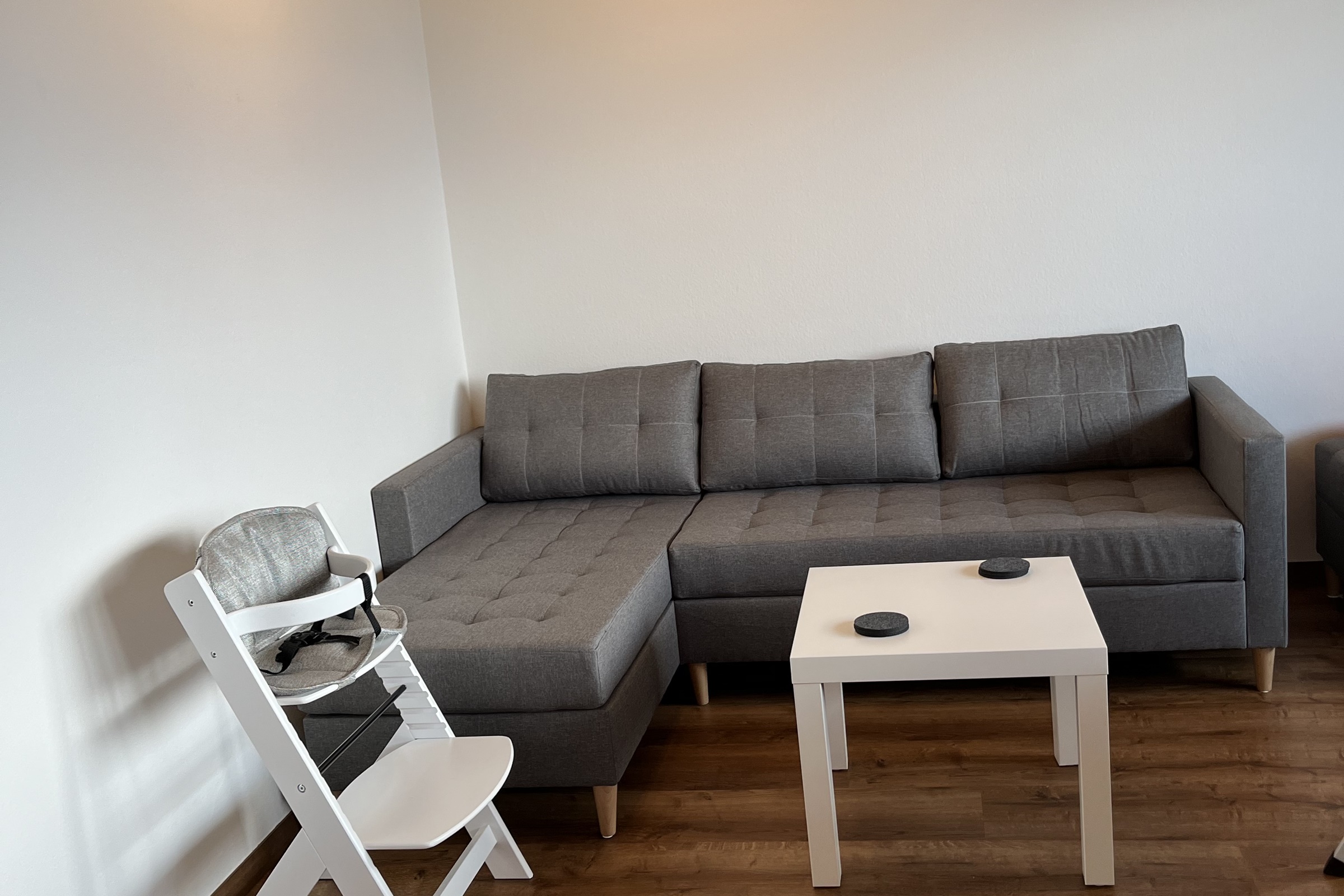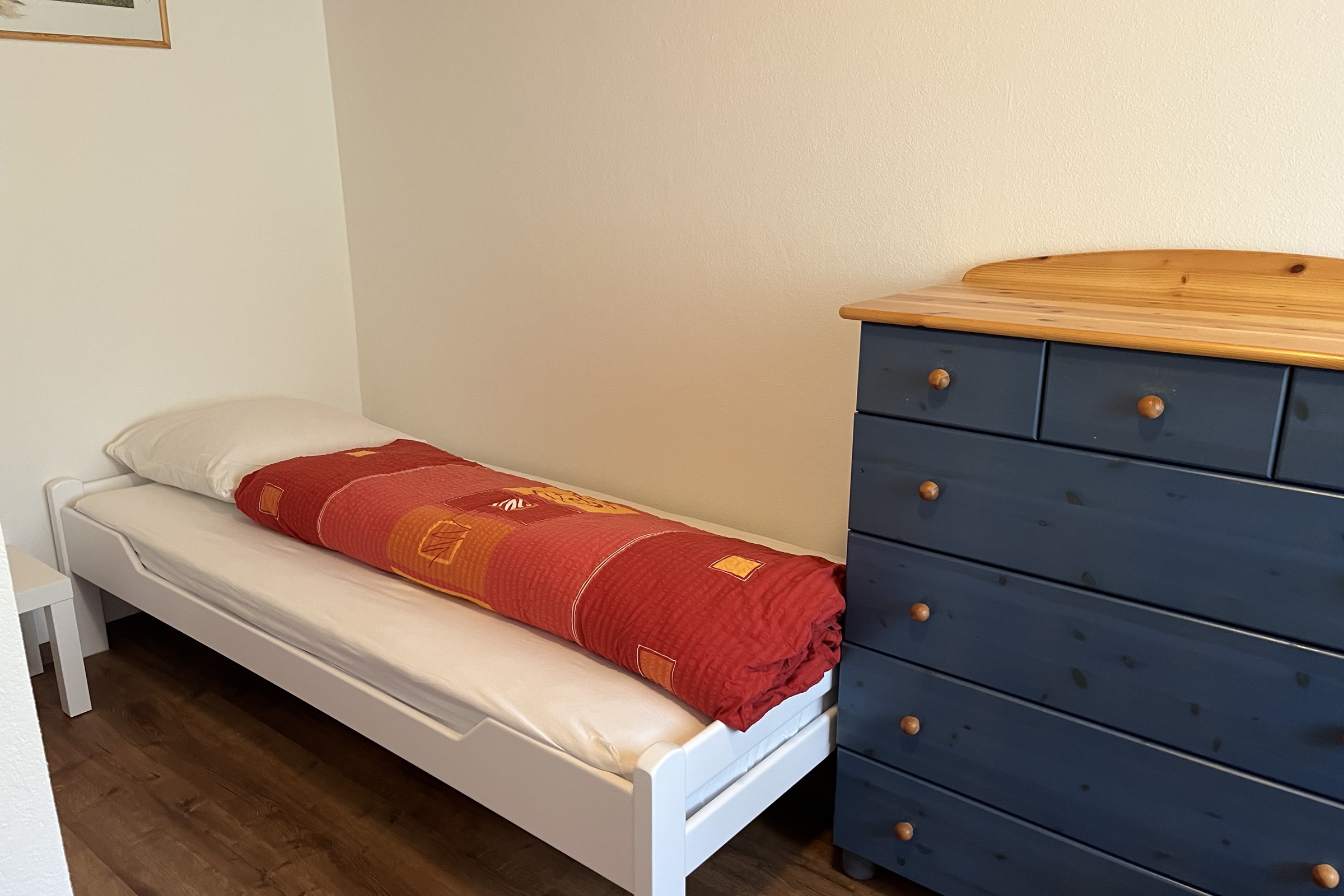 Die Ferienwohnung verfügt über Zwei Schlafzimmer mit je 2 Betten (Babybett vorhanden) ein Badezimmer mit Badewanne, WC und Lavabo ein Wohn-/Esszimmer eine offene und moderne Küche Inneneinrichtung und Technik Die moderne Ferienwohnung im ersten Stock wurde im Jahr 2022 neu renoviert und ist mit einem schönen dunklen Laminatboden ausgestattet. WLAN steht kostenfrei zur Verfügung, Flatscreen-TV mit Kabelanschluss und Radio.