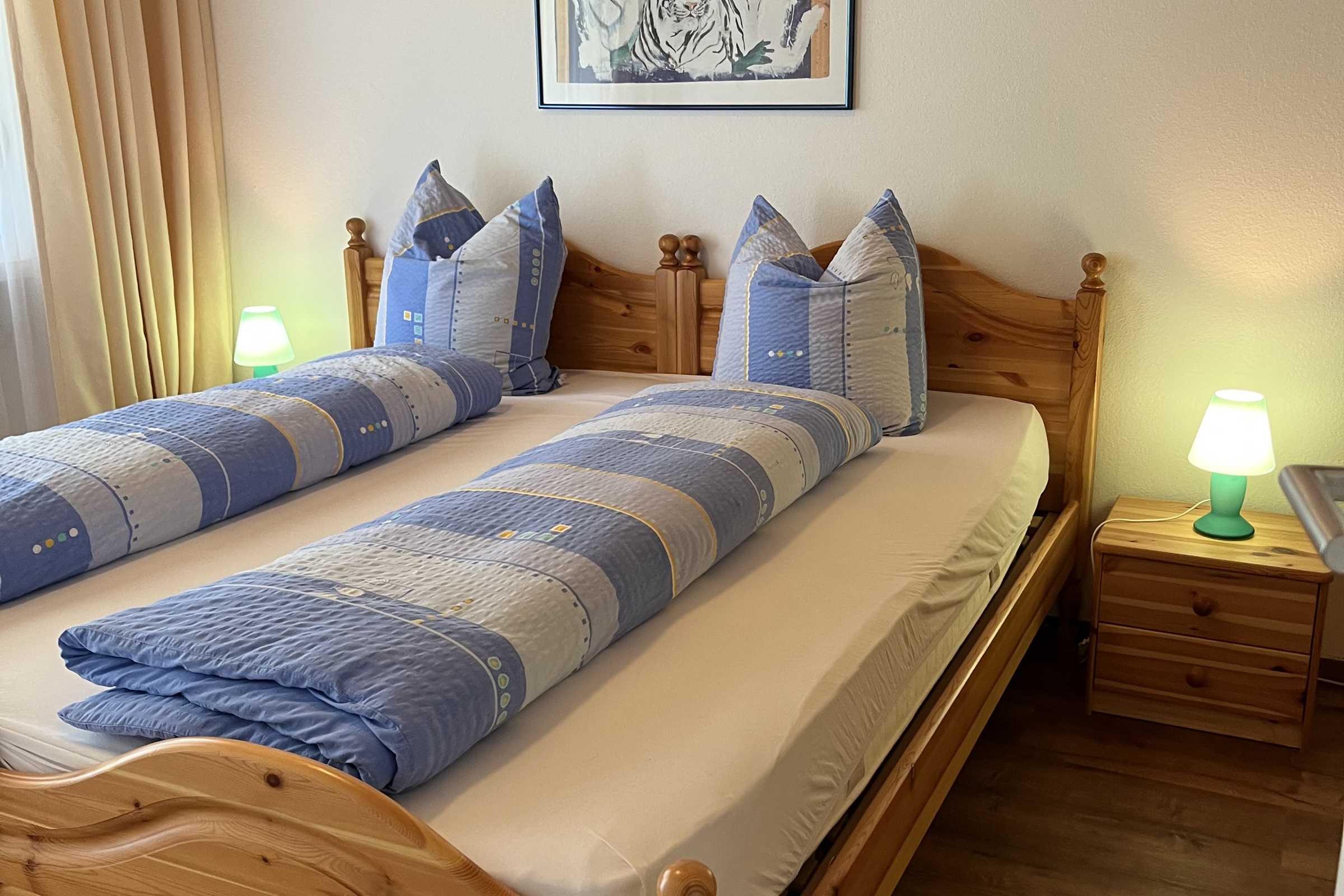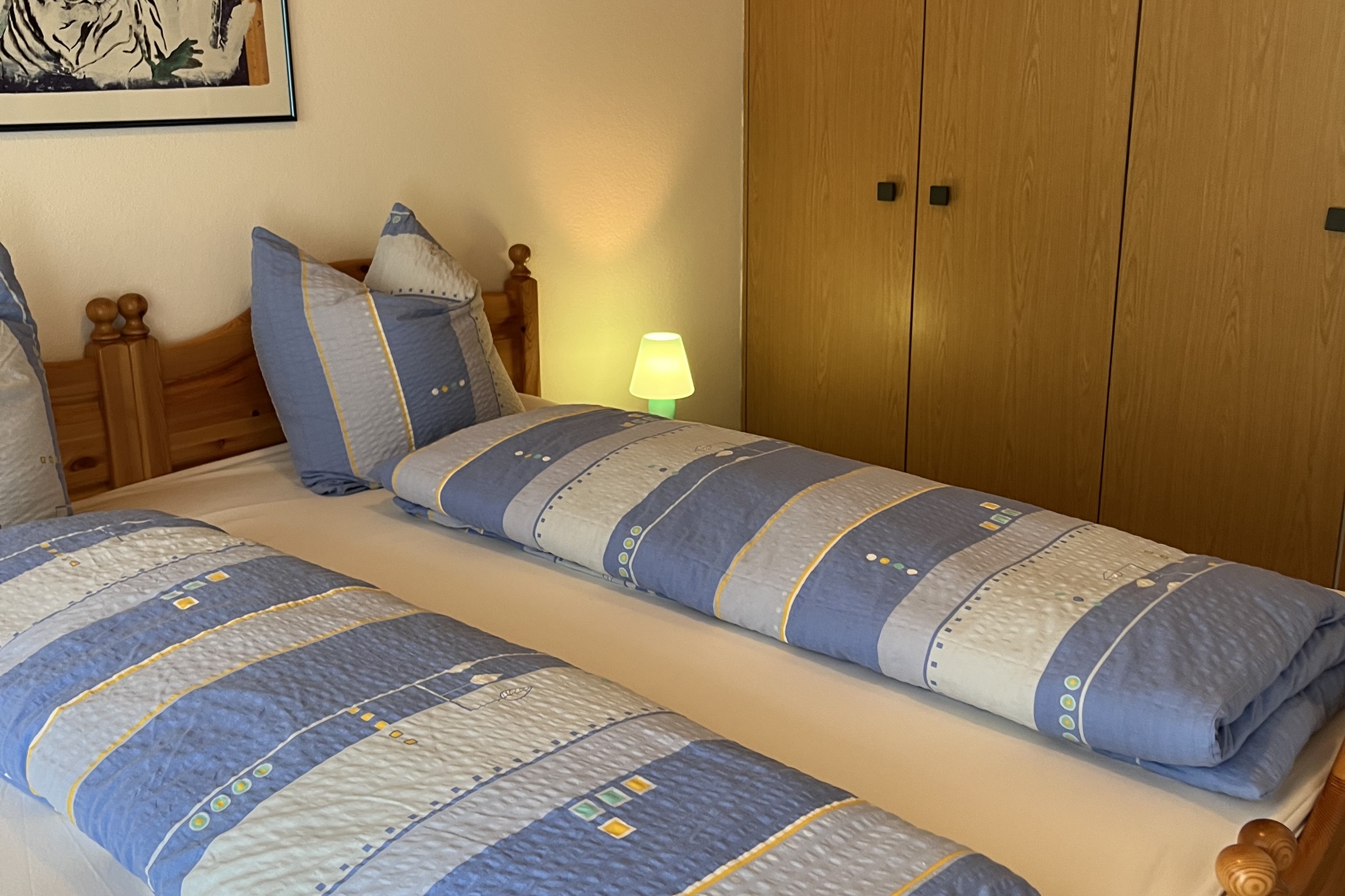 2 Schlafzimmer: ein geräumiges Schlafzimmer mit grossem Doppelbett (180x200) und ein Schlafzimmer mit zwei Einzelbetten (90x200). Badezimmer
