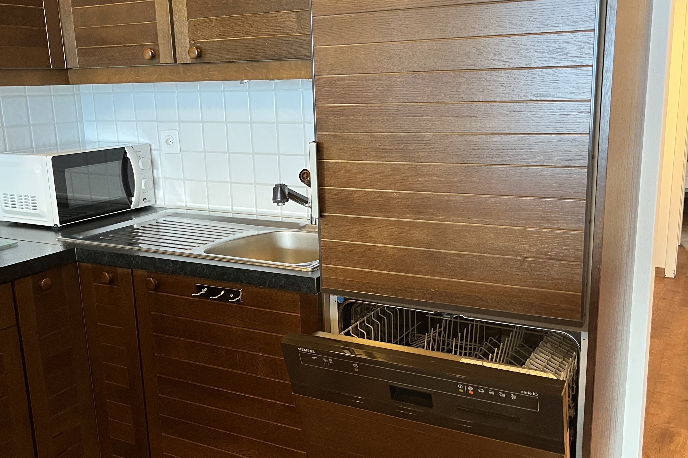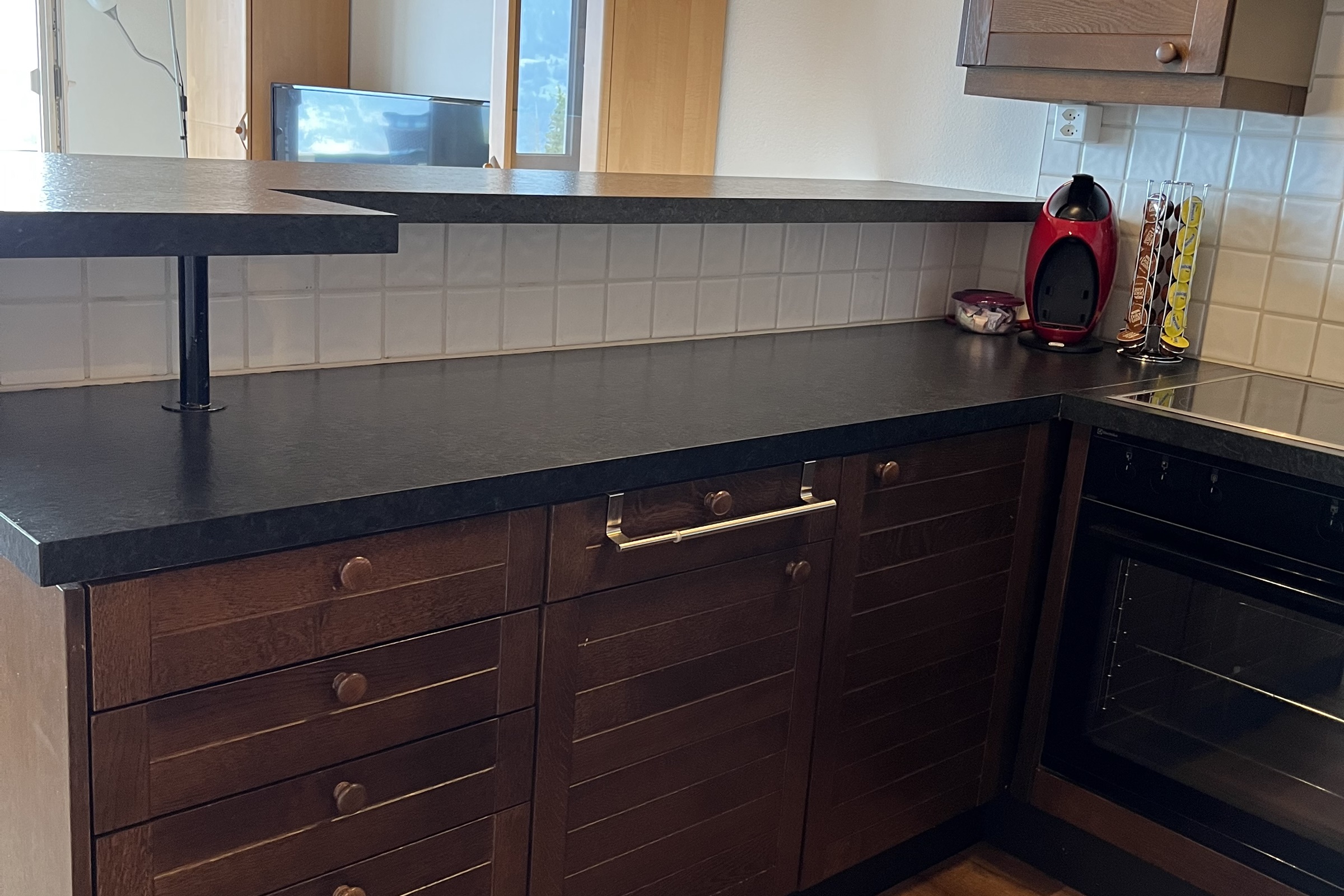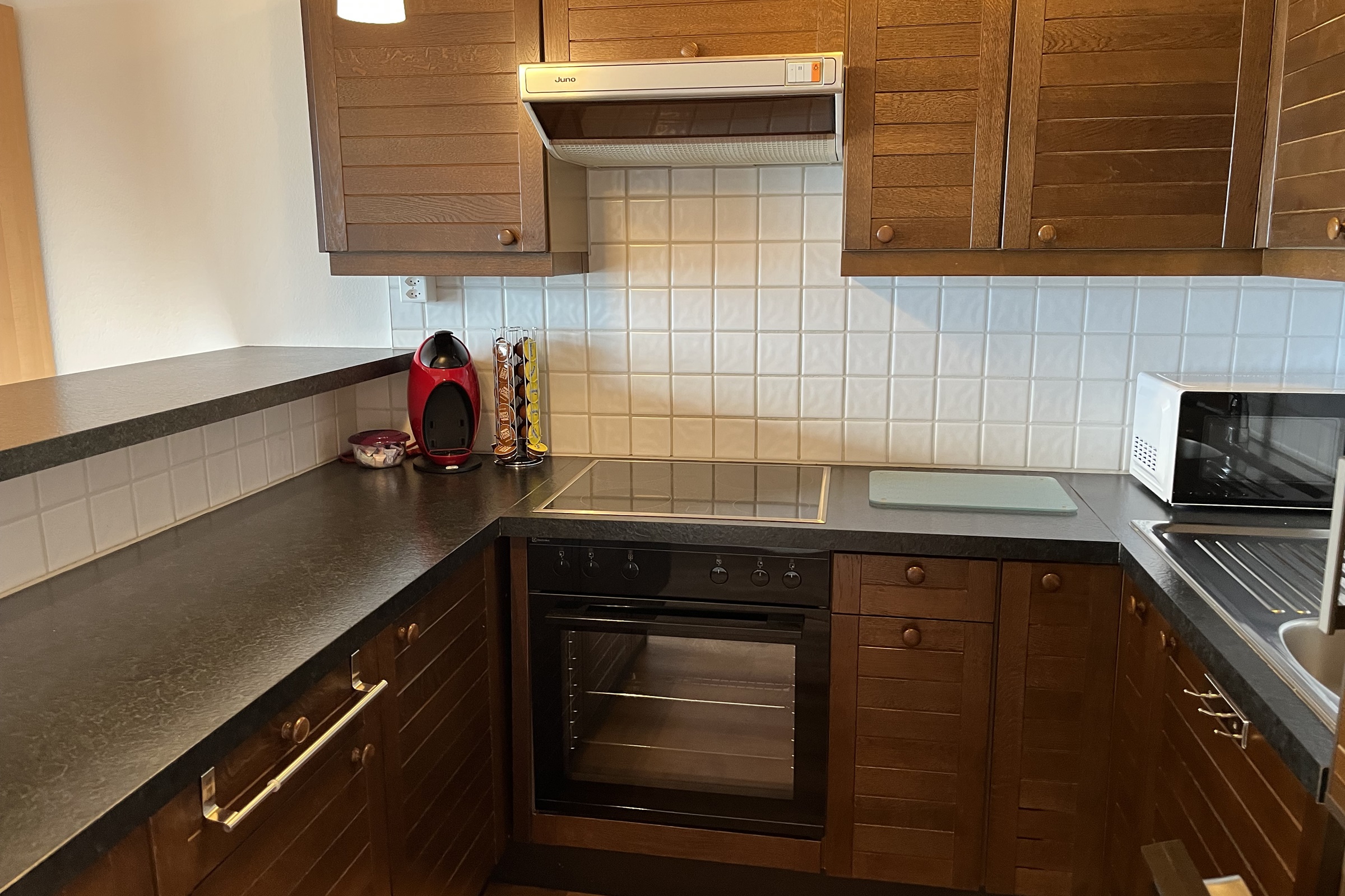 Die Küche ist komplett ausgestattet und verfügt über einen Glaskeramikherd, Geschirrspüler, Backofen, Kaffee-Kapselmaschine (Kapseln selbst mitbringen), Kühlschrank, Wasserkocher, Mikrowelle und Toaster. Inneneinrichtung