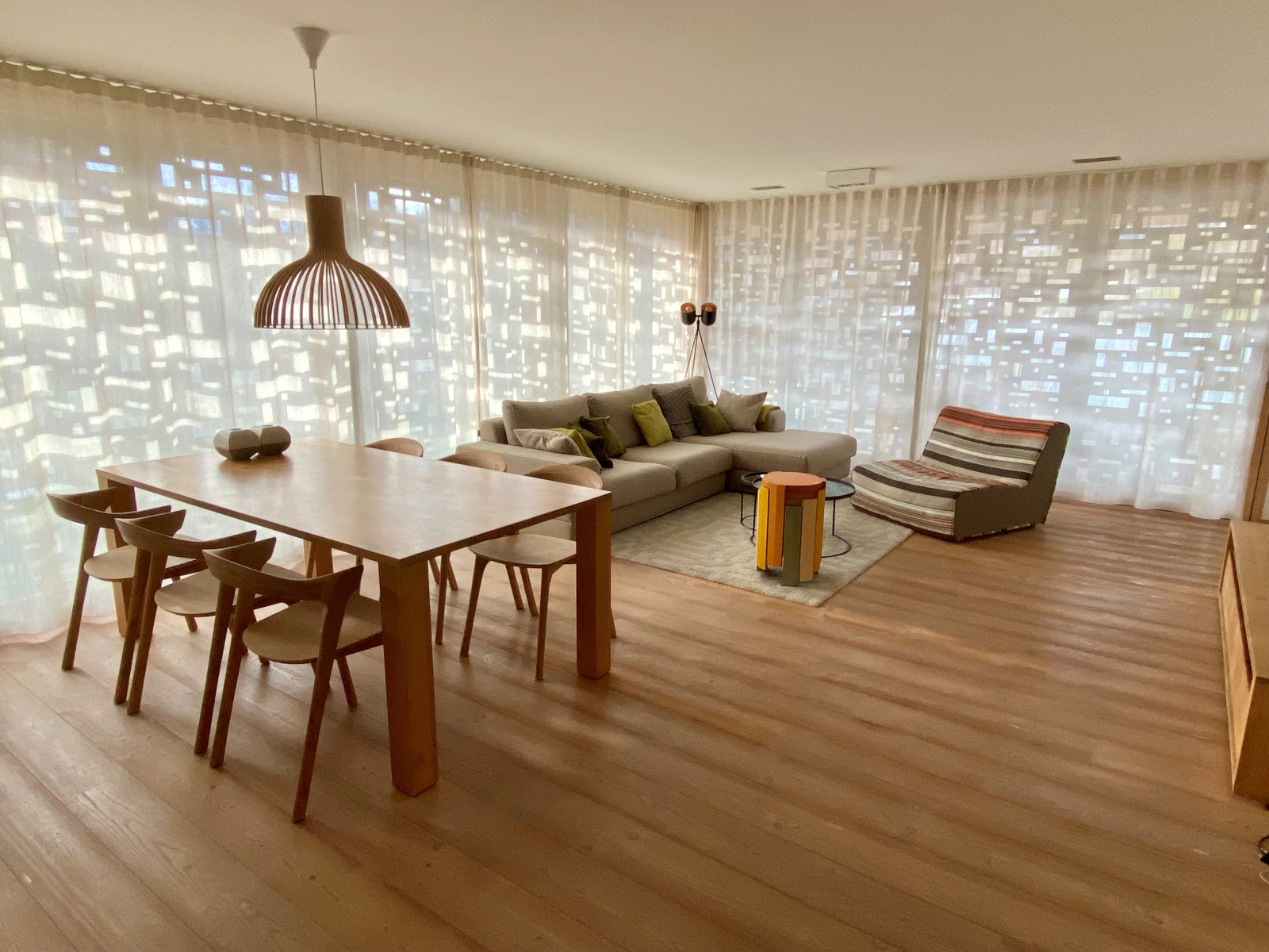 Gemütliches Wohnzimmer mit bequemem Sofa und originellen Holzhockern. Verschiedene Spiele für Jung und Alt, Bose Lautsprecher und WLAN. Eine grosse Sonnenterrasse von 16m2 mit einer wunderschönen Aussicht auf die Bergwelt. Kein TV. Küche: