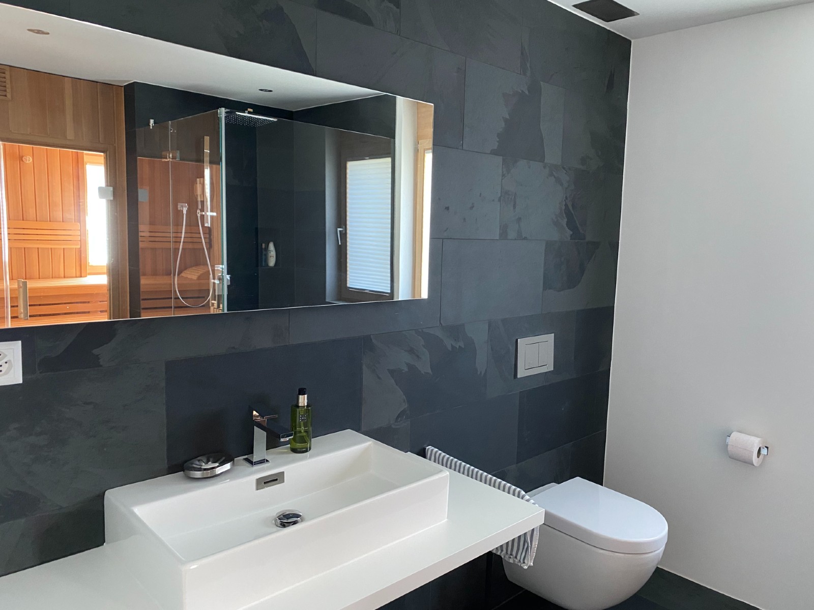 Zwei Badezimmer, je mit einem Schlafzimmermern verbunden. Die Badezimmer verfügen über ein Waschbecken, eine Toilette, eine Regendusche. Frotteewäsche vorhanden und im Preis inbegriffen (1 Set pro Person). Sontiges: