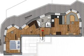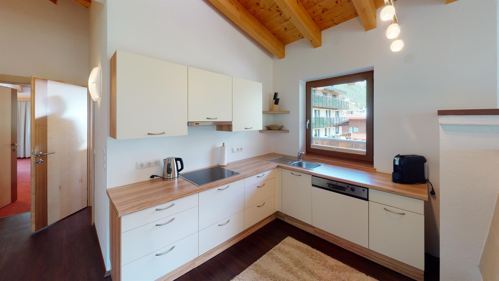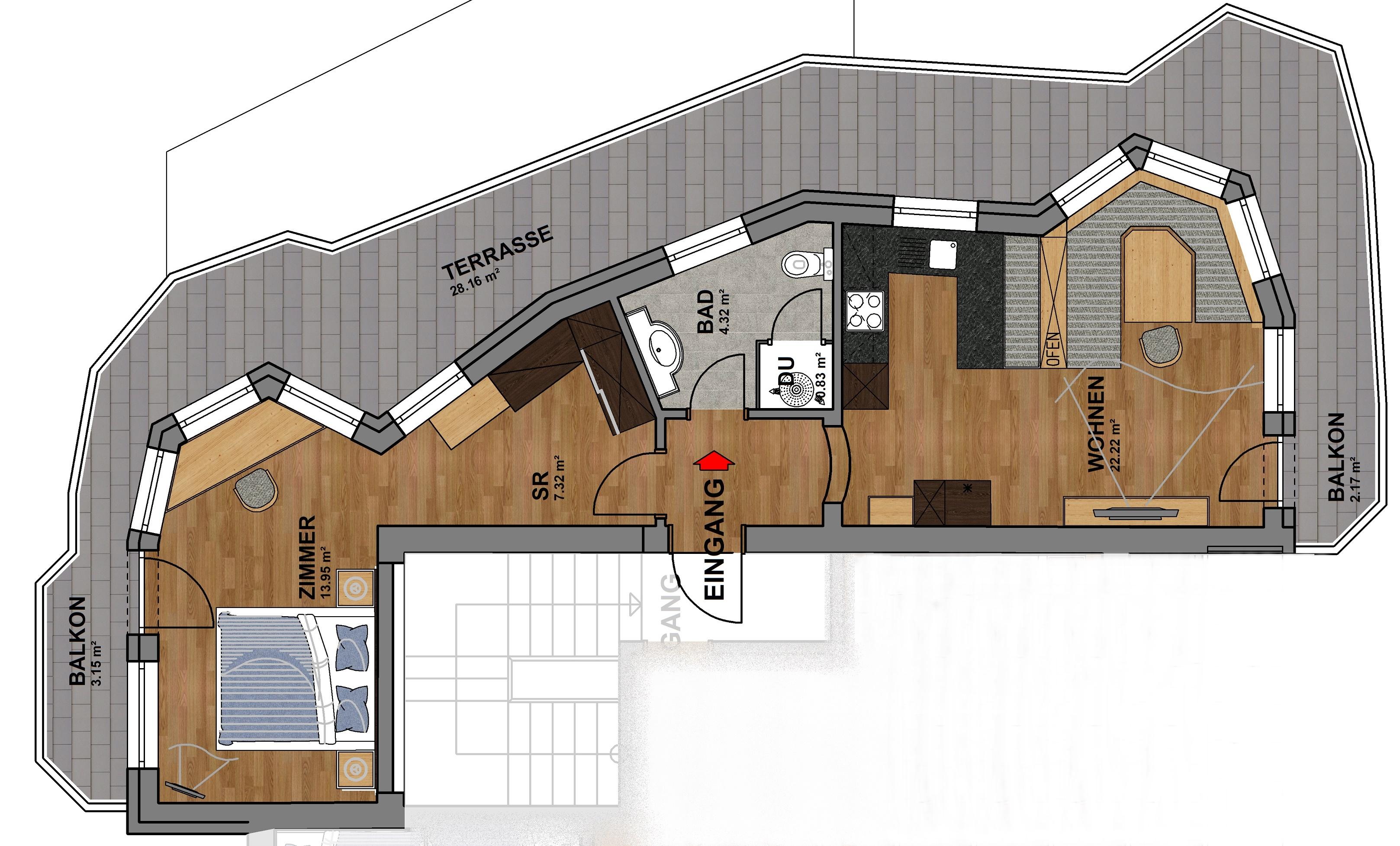 Appertement Top 5 (ca. 47 m²): 1 Schlafzimmer mit Doppelbett und einem Badezimmer mit Dusche/WC; 1 voll ausgestattete Küche mit Backrohr, Mikrowelle, Geschirrspül- und Kaffeemaschine uvm.; großes Wohnzimmer mit gemütlicher Essecke und Sofa, Kabel TV, W-Lan. Das Highlight des Appartements ist der Balkon und die große Terrasse.