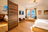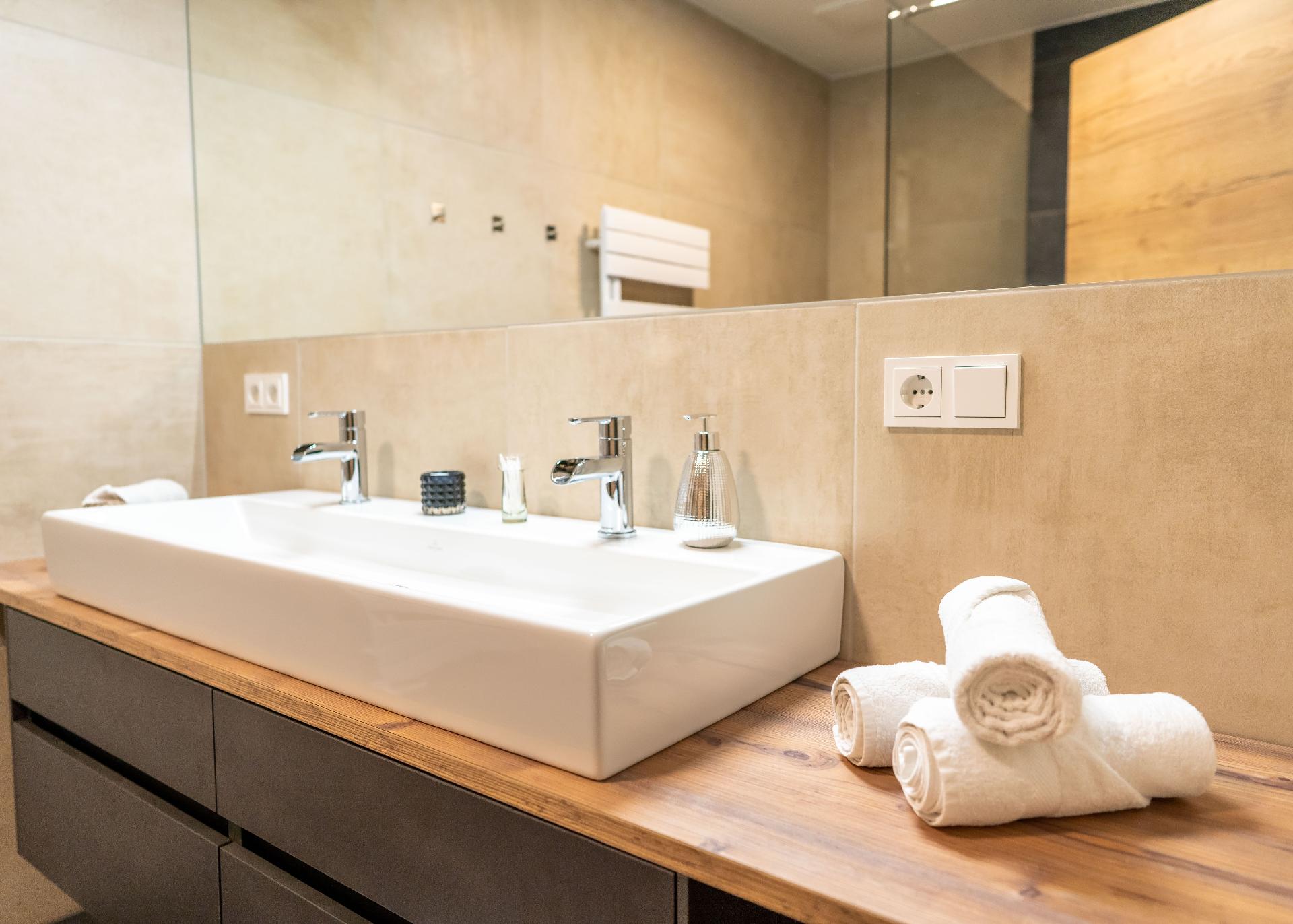 Unser Appartement „Luv“ bietet auf 105 m2 Platz für insgesamt 6 Personen in 3 Schlafzimmern. Ein großzügiges Bad mit Bodenheizung und zwei separate WC-Räume sowie ein großer, modern ausgestatteter Koch-, Wohn- und Essbereich mit Balkon und Bergblick runden die gemütliche Ferienwohnung ab.