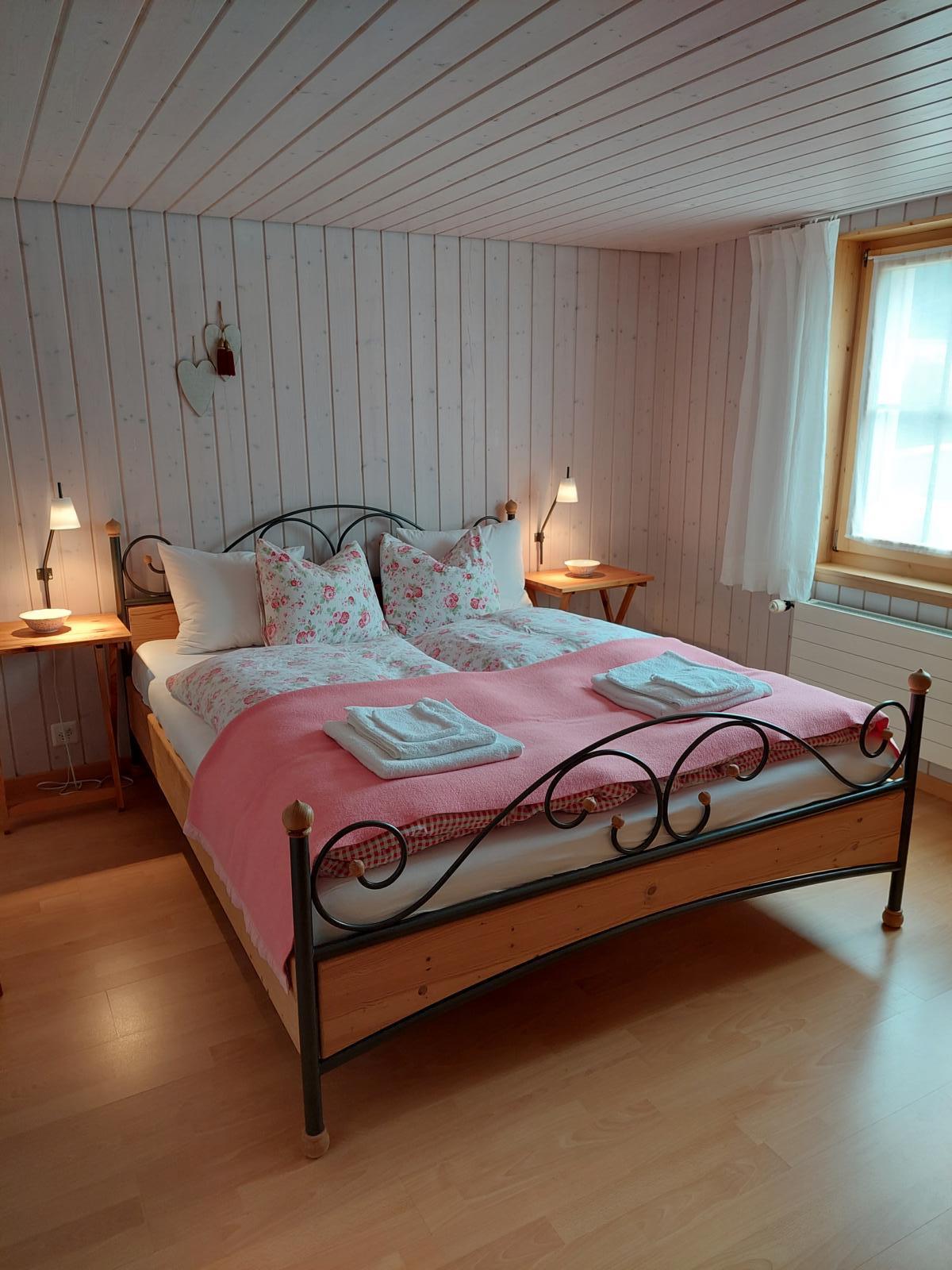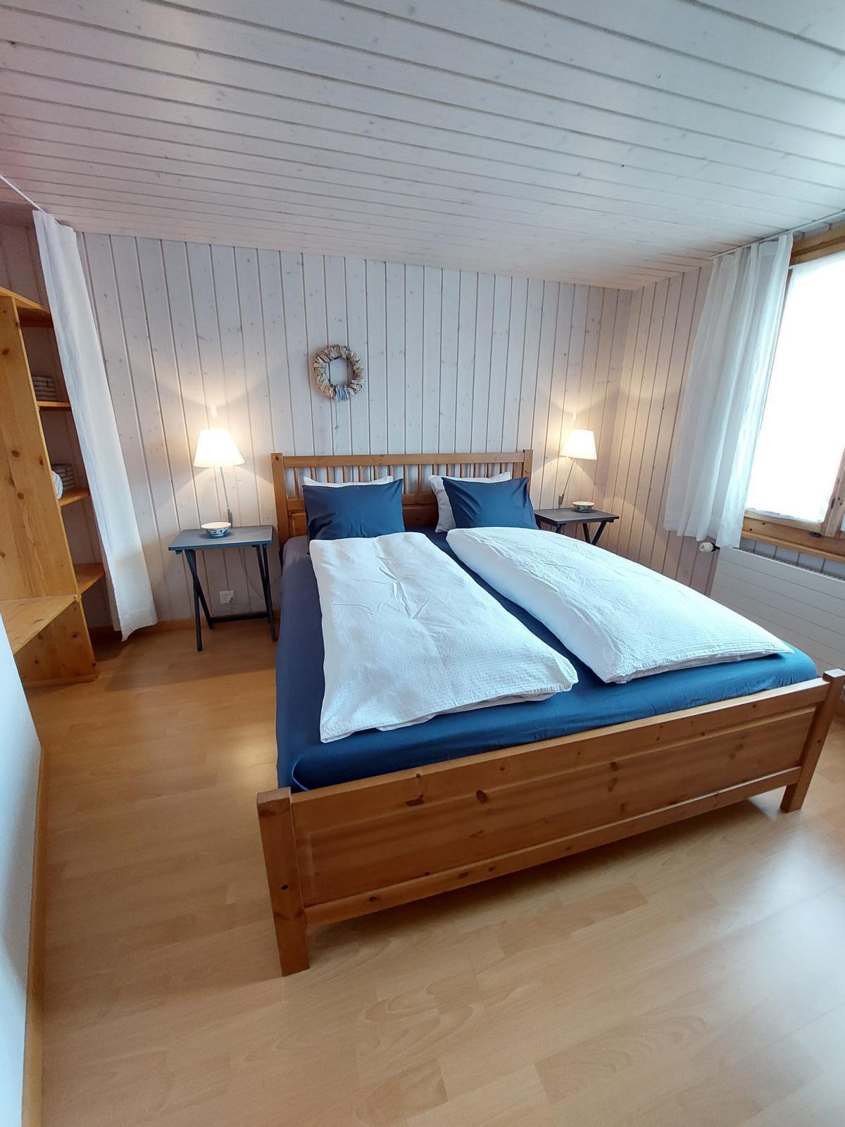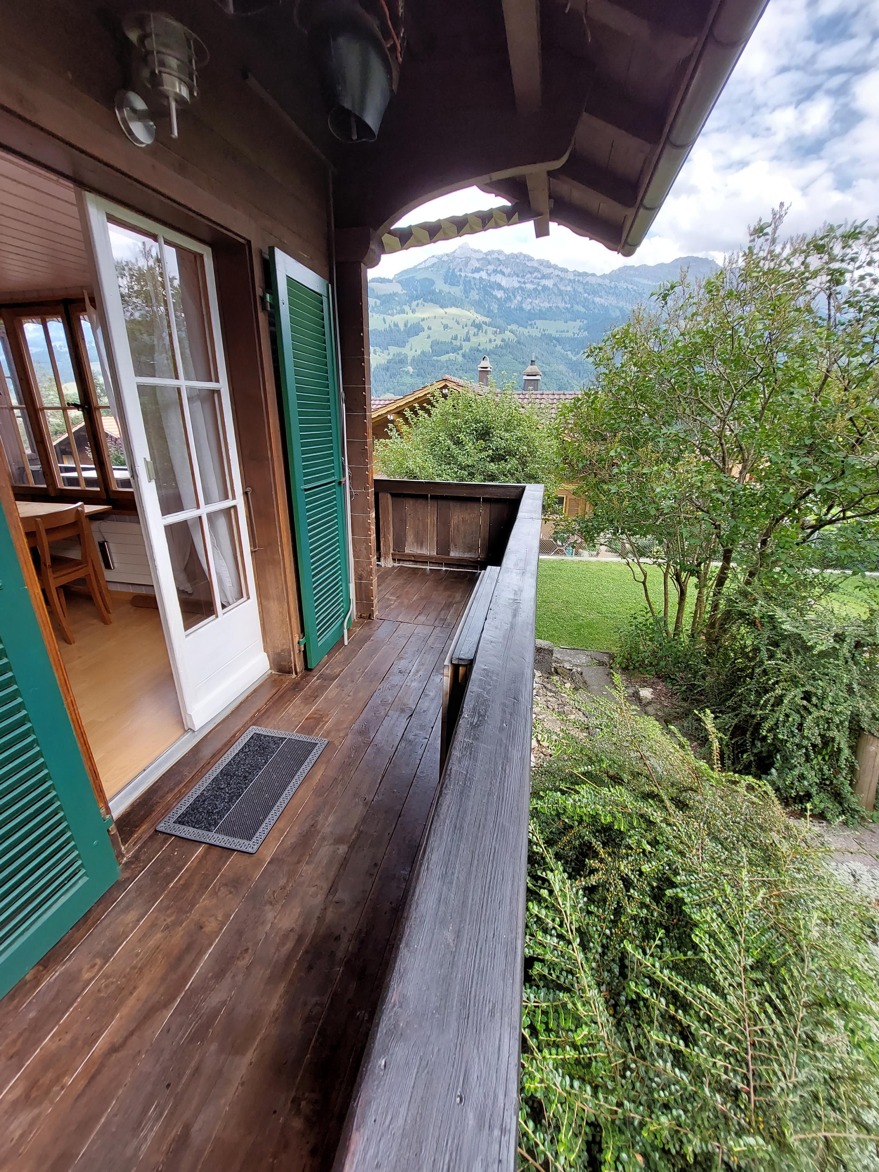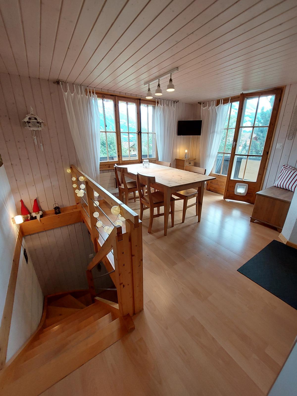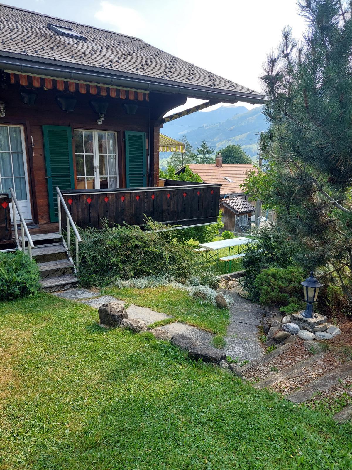 Schöne 3-Zimmer-Maisonette Wohnung (65m2) im Parterre und 1. Stock in einem Chalet mit 2 Wohnungen. Das Chalet liegt an erhöhter und ruhiger Lage unweit vom Dorfzentrum entfernt. Der Balkon mit schöner Bergsicht und der idyllische Garten laden zum verweilen ein. Eingangsbereich mit Garderobe und Schuhablage. 1 Schlafzimmer mit Doppelbett (160x200cm) im Partette, 1 Schlafzimmer mit Doppelbett (160x200m) im ersten Stock. Wohnzimmer mit Sitzecke, Kabel-TV/Radio. Gratis WiFi. 1 Badezimmer mit Dusche/WC. Gut ausgestattete Wohnküche mit separatem TV, Glaskeramikkochfeld, Backofen, Kühlschrank inkl. Gefrierfach, Filter-Kaffeemaschine, Racelette- und Fondueset, Wasserkocher, Toaster. Die Wohnung verfügt über eine Zentralheizung. Zusätzlich gibt es im Wohnzimmer einen Kaminofen. Die Parkplätze befinden sich direkt beim Haus. Haustiere sind nicht erlaubt. Nichtraucher Wohnung. Wie oftmals in älteren Chalets üblich, ist die Raumhöhe niedriger als gewohnt (ca. 2.00 Meter). Bettwäsche, Frotteewäsche sowie Küchentücher sind vorhanden.