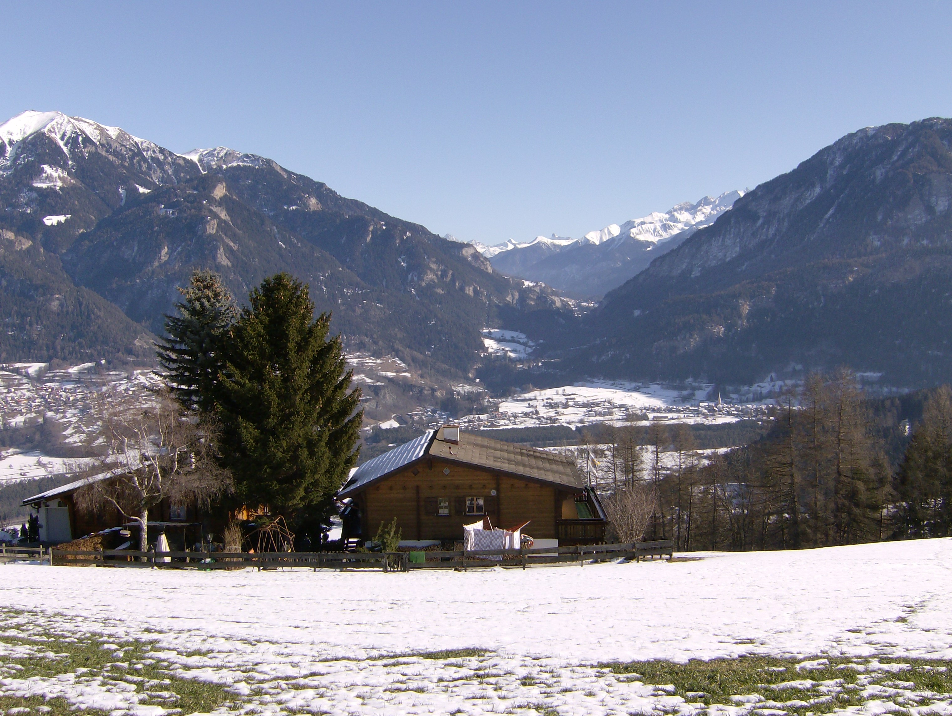 Sonnige und sehr ruhige Lage am oberen Teil von Tartar auf 1000m Höhe mit Panorama-Aussicht in die fantastische Bergwelt. Blick von grosser Terrasse ins Tal und zum Piz Beverin. Zufahrtstrasse bis zum Chalet gut erreichbar.