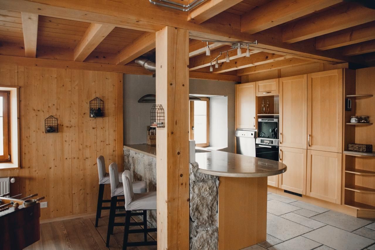 Die voll ausgestattete Küche umfasst Geschirrspüler, Induktionskochfeld, Dampfgarer und einen alten Brotbackofen, der sich perfekt für Pizzen eignet. Das Wohnzimmer mit seinem Holzofen lädt zu gemütlichen Stunden ein. Die Wohnung verfügt über zwei komplette Badezimmer und drei gemütliche Schlafzimmer, von denen zwei mit großen Boxspringbetten und eines mit Einzelbetten ausgestattet sind. Ein Babybett kann auf Anfrage hinzugefügt werden.
