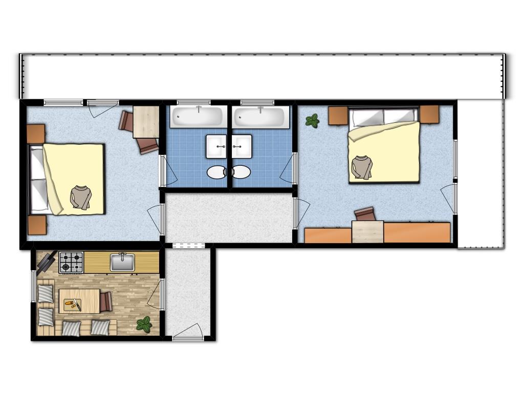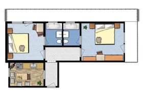Appartement Grießkogel im 1. Stock mit einer vollausgestatteten Wohnküche (Cerankochfeld, Geschirrspüler, Kaffeemaschine, Kühlschrank uvm.) mit Essbereich, 2 Doppelzimmer; 1 Badezimmer mit Badewanne/WC, 1 Badezimmer mit Dusche/WC; Kabel-TV, Telefon und Balkon. Größe: ca. 50 m².