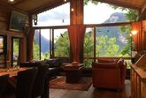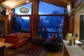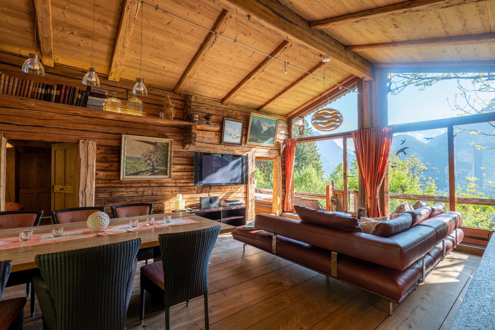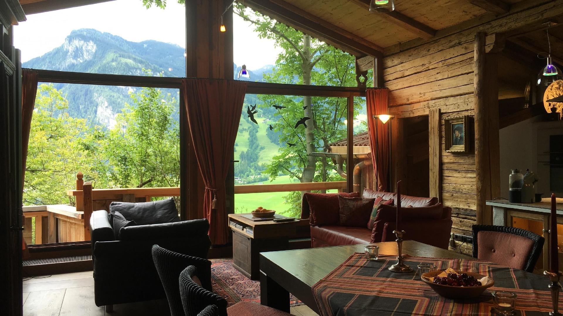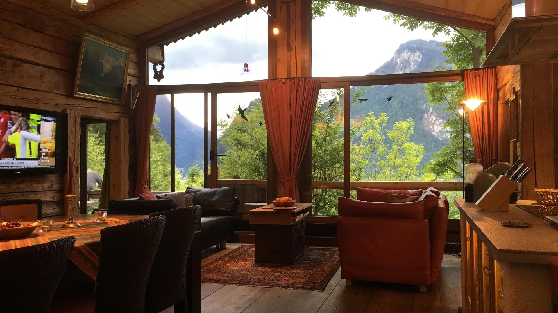 Die großzügige Fensterfront ermöglicht einen tollen Blick ins Tal sowie eine sympathische Beleuchtung. Um einmal Frische zu tanken kann diese Fensterfront auch geöffnet werden - draußen befindet sich eine Terrasse mit Glasfront, Tisch und Sitzplätzen.