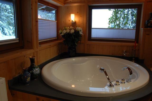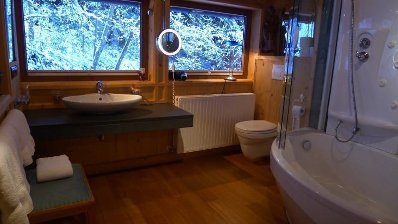 Das zweite überzeugt durch eine Massagedusche und eine großzügige runde Badewanne. Drei Fenster ermöglichen von der Badewanne aus einen wunderbaren Blick in die Natur und ins Tal.