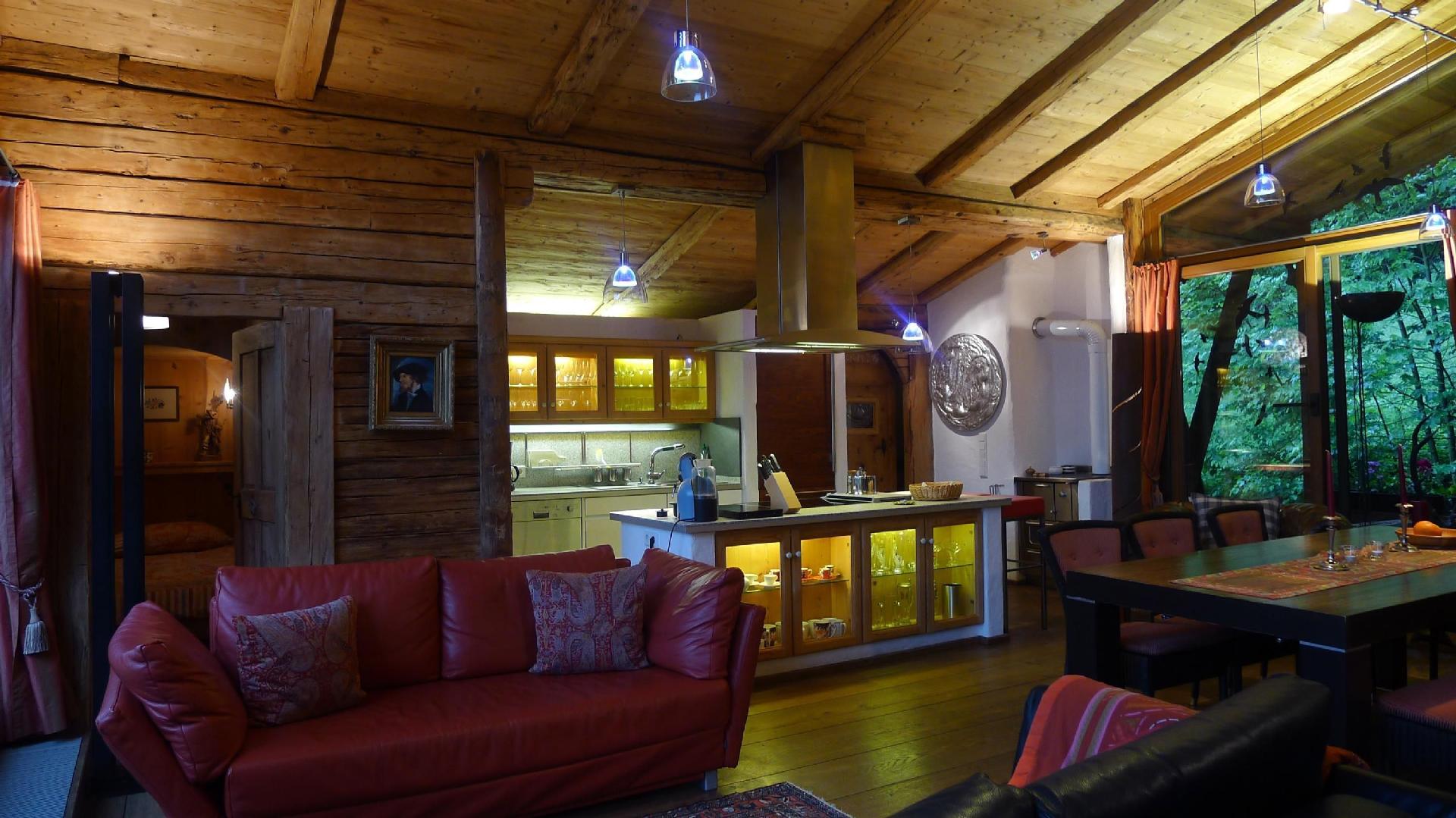 Richtig gemütlich machen kann man es sich auf der roten Ledercouch, während ein großer HD-Plasma-TV mit Sat-Anschluss (inklusive Sky) und eine Beolit 12 von Bang & Olufsen zur Unterhaltung beitragen. Für die gesellige Runde steht ein großer Esstisch zur Verfügung. Der besondere Flair wird durch die große, nach Süden und Norden gerichtete Fensterfront und der umfangreichen, großteils indirekten Beleuchtung (Wohnzimmerbeleuchtung Swarovski) sowie den soliden, teilweise handgefertigten Eigenbaumöbeln aus unbehandelten Naturholz verliehen.