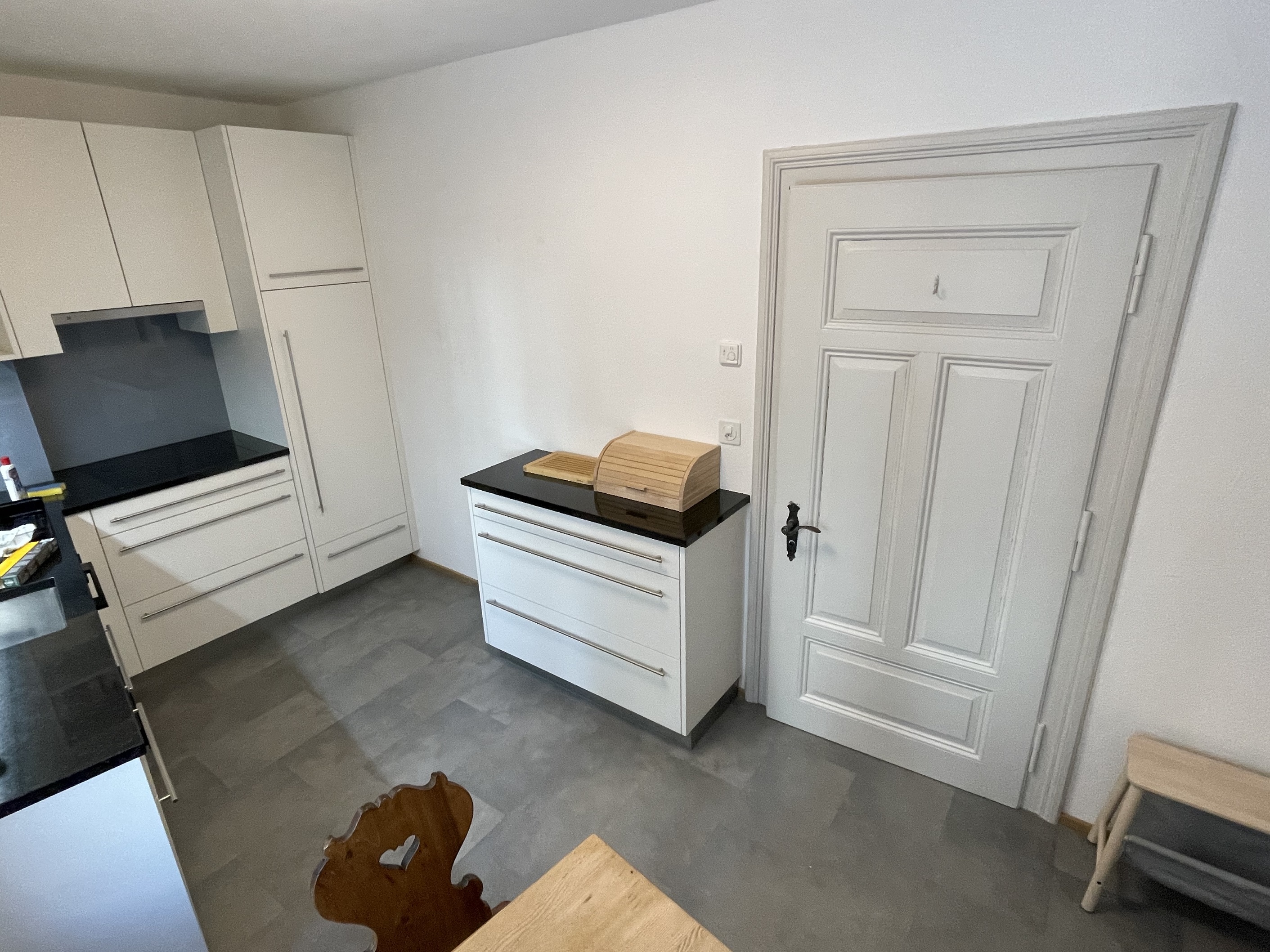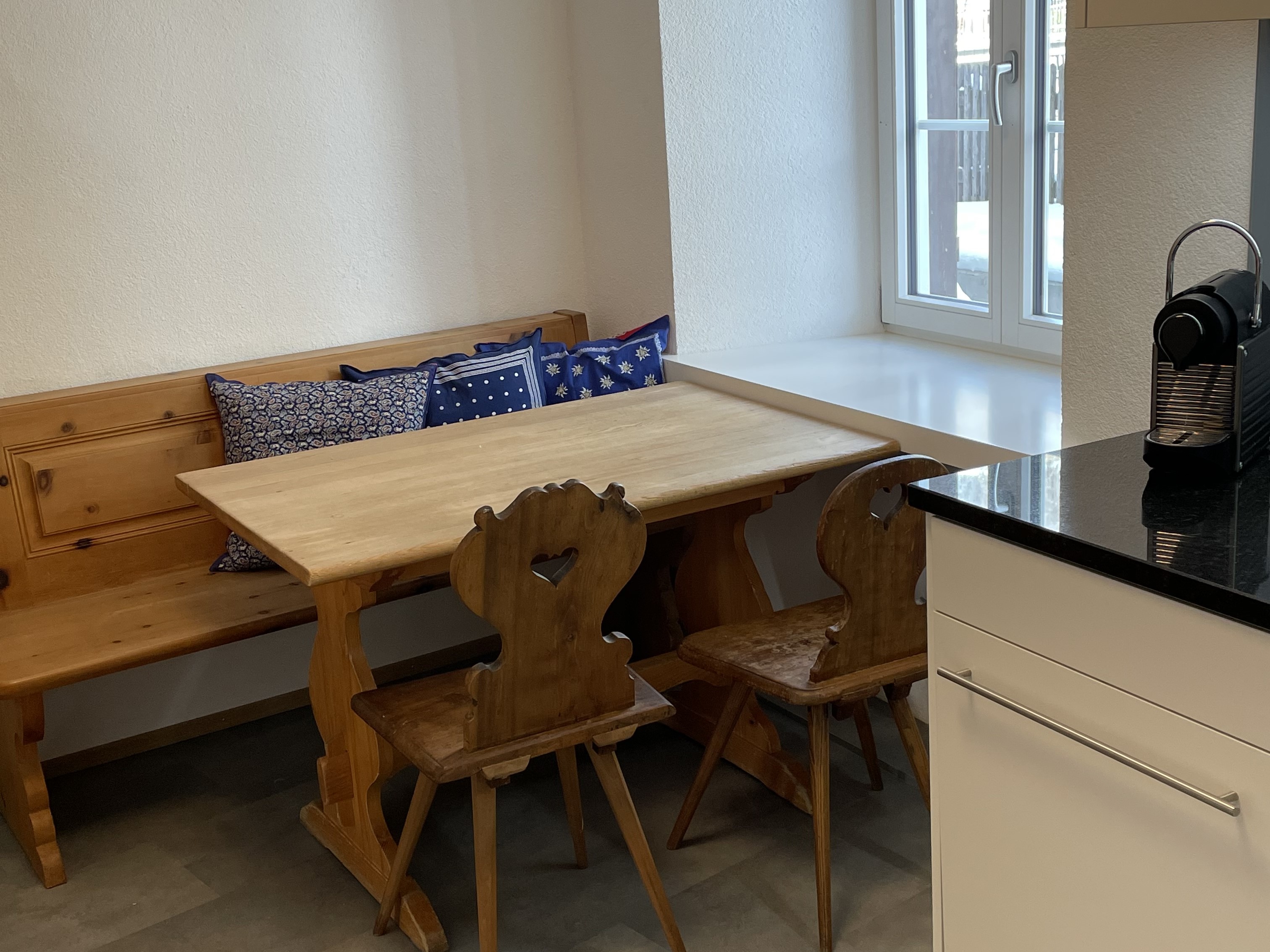 In der Wohnküche steht ein Esstisch mit Bank und Stühlen, es kann aber auch am grossen Tisch im Flur mit Eckbank gegessen werden.