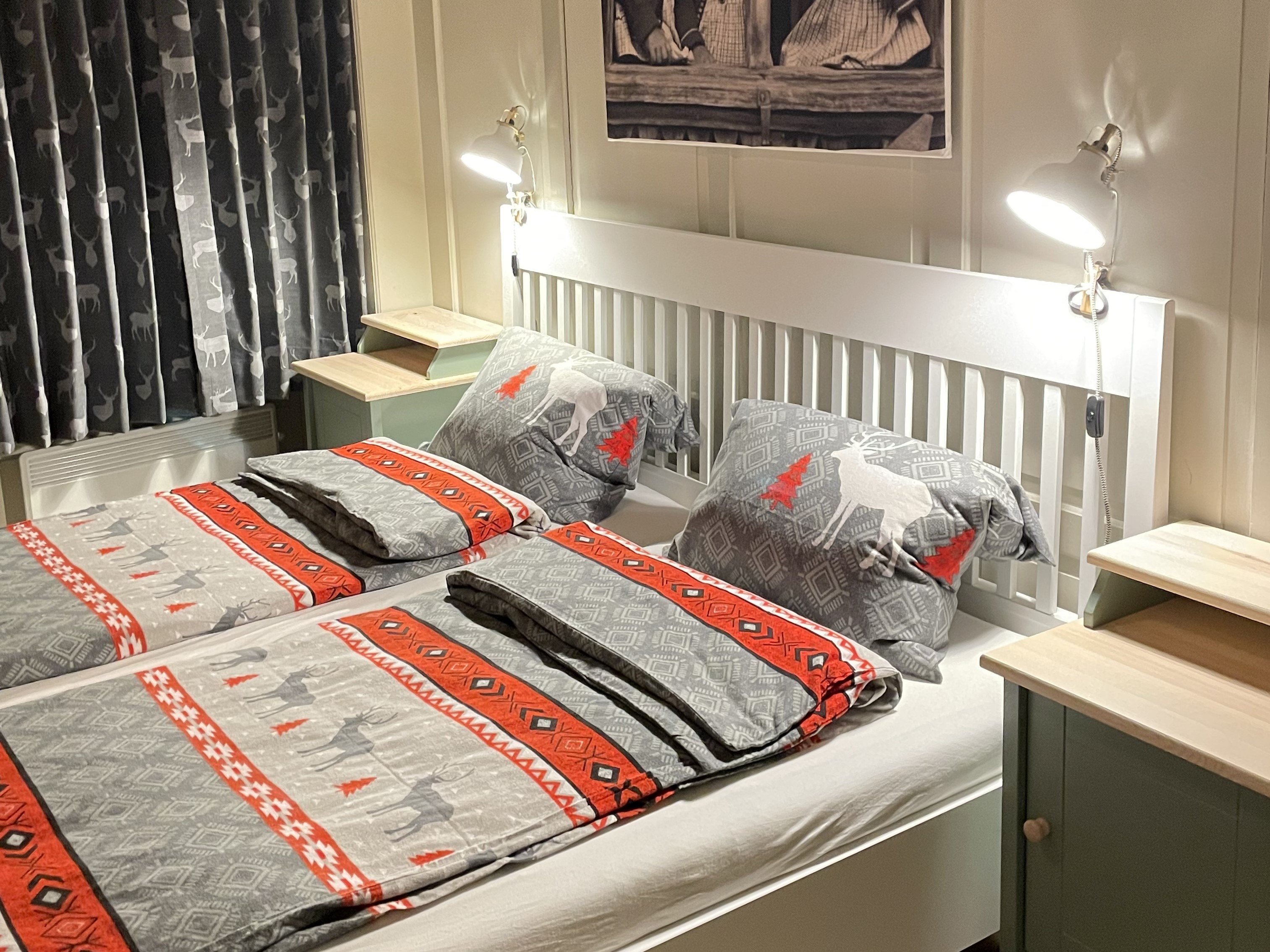 Ein Schlafzimmer ist für 2 Personen (1 Doppelbett) eingerichtet. Im 2. Schlafzimmer steht ein Kajütenbett und ein Doppelbett, es ist für 4 Personen geeignet.
