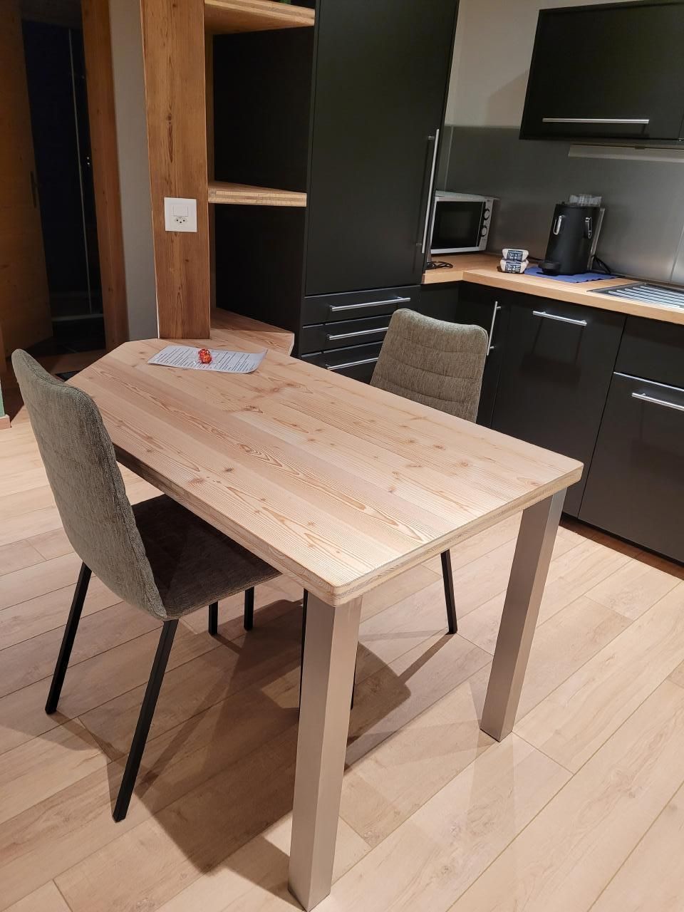 Das Innere der Wohnung bietet ein einladendes Wohnzimmer, ausgestattet mit einer Schlafcouch, die sich in ein Bett mit den Maßen 140x200 cm umwandeln lässt, ideal für entspannende Abende oder zusätzliche Übernachtungsgäste. Im Schlafzimmer sorgt die Rückwand aus Altholz, unterstrichen von einem integrierten Landschaftsbild mit LED-Beleuchtung, für romantische Stimmung. Zusätzlich bietet ein geräumiger Kleiderschrank ausreichend Platz für Ihre Garderobe und persönliche Gegenstände.