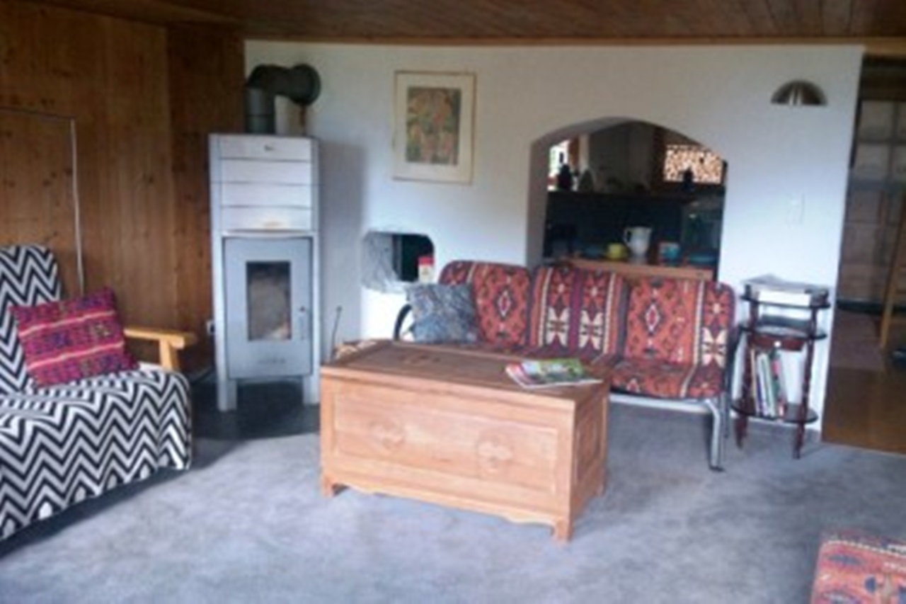 Das gemütliche Wohnzimmer ist mit einem Cheminéeofen, einem Sofa und Lesestühlen eingerichtet. Küche