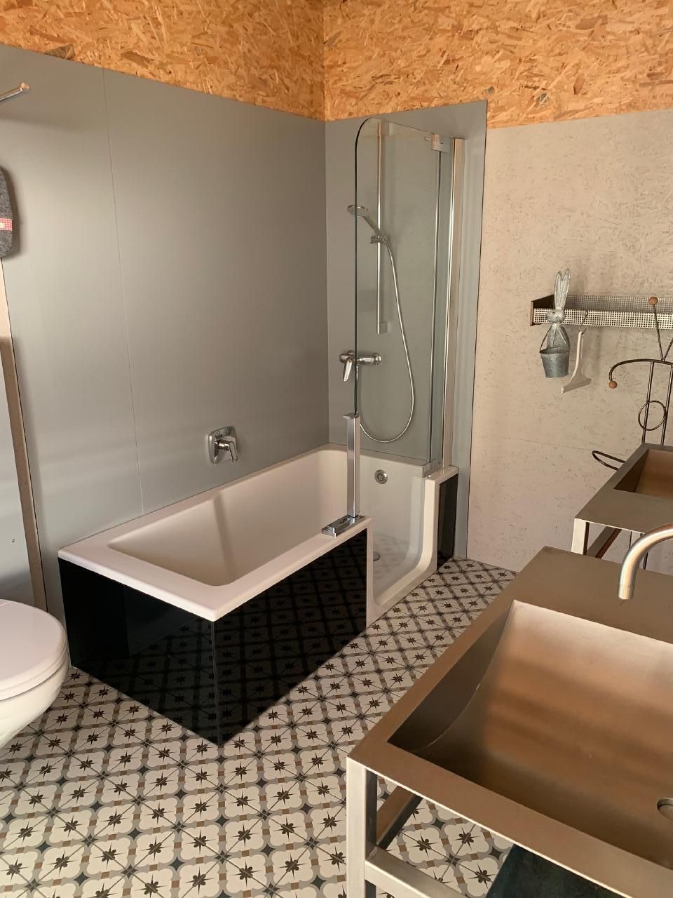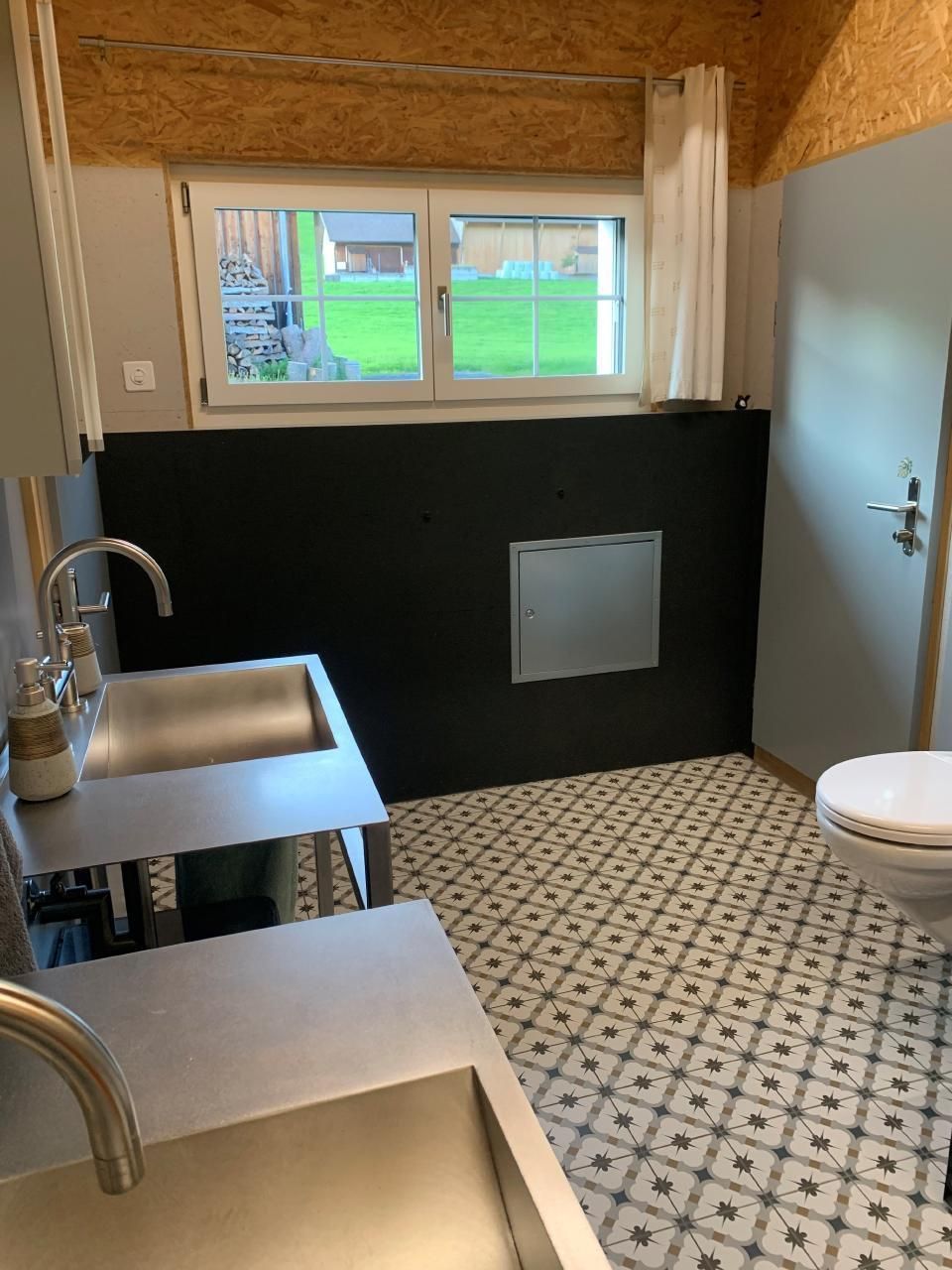 Das barrierefreie und treppenlose Studio (Türschwelle 3cm, Türbreiten 100cm) mit seiner grosszügigen modernen Küche und dem stylischen Badezimmer (Duschbadewanne mit seitlicher Einstiegstüre, Absatz 5.5cm) ist fussbodenbeheizt. Wir heizen mit Holz aus dem eigenen Wald und mit Sonnenenergie fürs Warmwasser. Auf Teppichböden haben wir bewusst verzichtet und auf LED Beleuchtung Wert gelegt. Unsere 4 Hektaren Wiesland rund um den Hof herum werden naturnah bewirtschaftet.