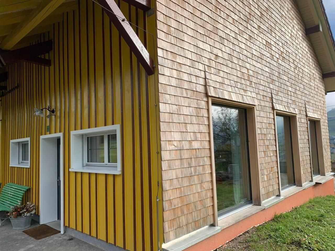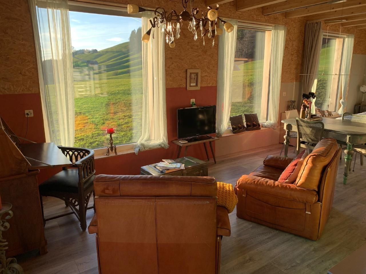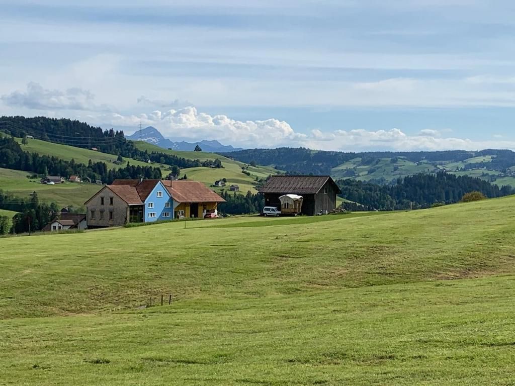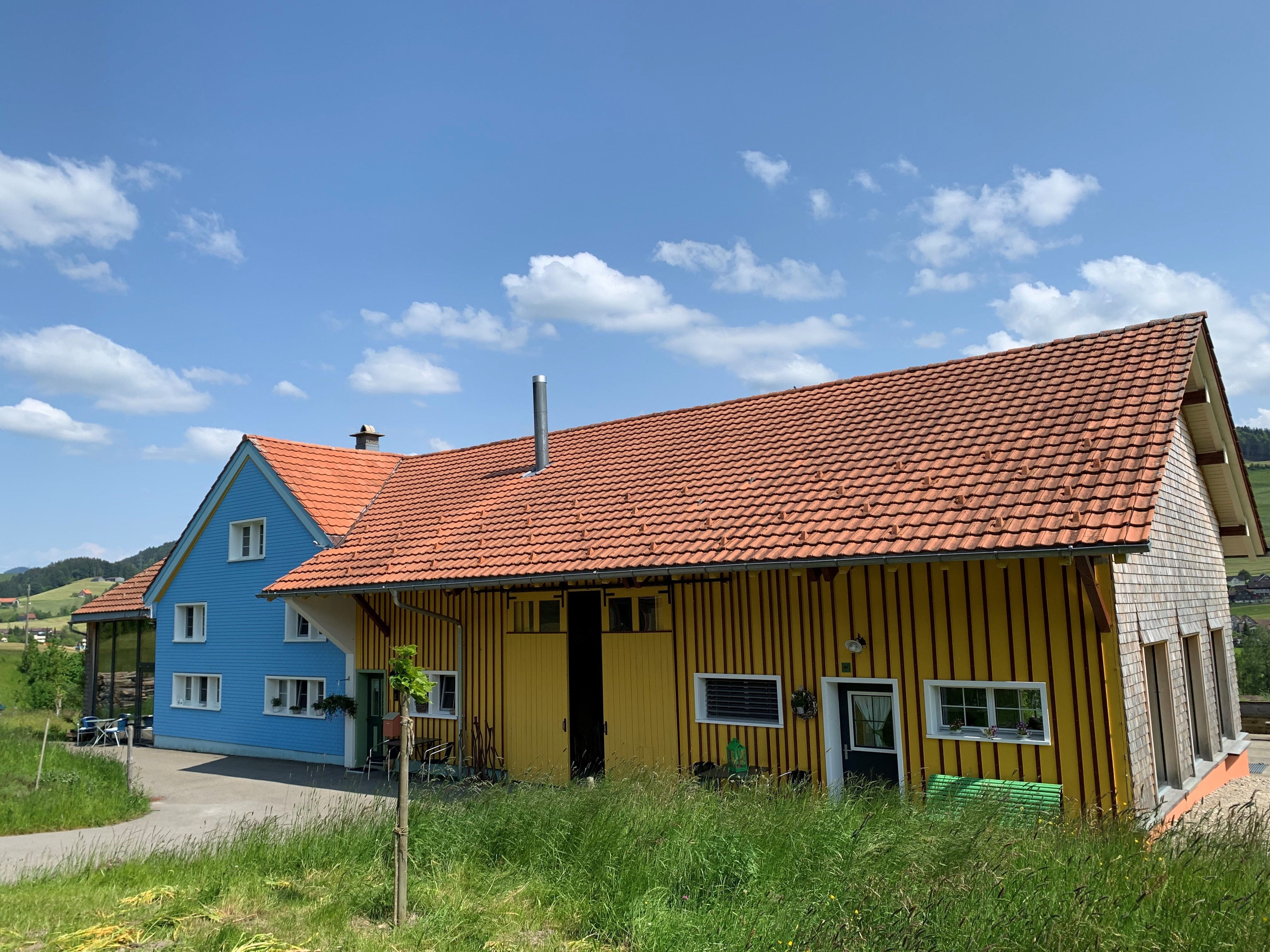 Das im ehemaligen Stall - als separater Hausteil mit eigenem Ausseneingang und Terrassenzugang - eingebaute grosszügige loftige Studio (2.90m Deckenhöhe) gewährt durch seine drei Panoramafenster einen weiten Blick auf die Landschaft (keine unmittelbaren Nachbarn) und nachts auf den Sternenhimmel. Unser Bauernhof ist in Gehdistanz vom Dorf an einer Ortsrandlage mit schöner Sicht auf das Dorf Schönengrund und die Umgebung. Auf der Rückseite mit Blick auf den Jakobsweg wähnen Sie sich auf einer Alp und befinden sich doch in Fussdistanz zur Bäckerei, Metzgerei, Lebensmittelladen und Landi. In unserem Wald mit Bach können Sie sich tagsüber auch zurückziehen. Sind Sie auf dem Jakobsweg unterwegs, erreichen Sie uns zu Fuss in 15 Minuten. Falls Sie mit dem öV anreisen, holen wir Sie gerne an einer der Haltestellen ab.