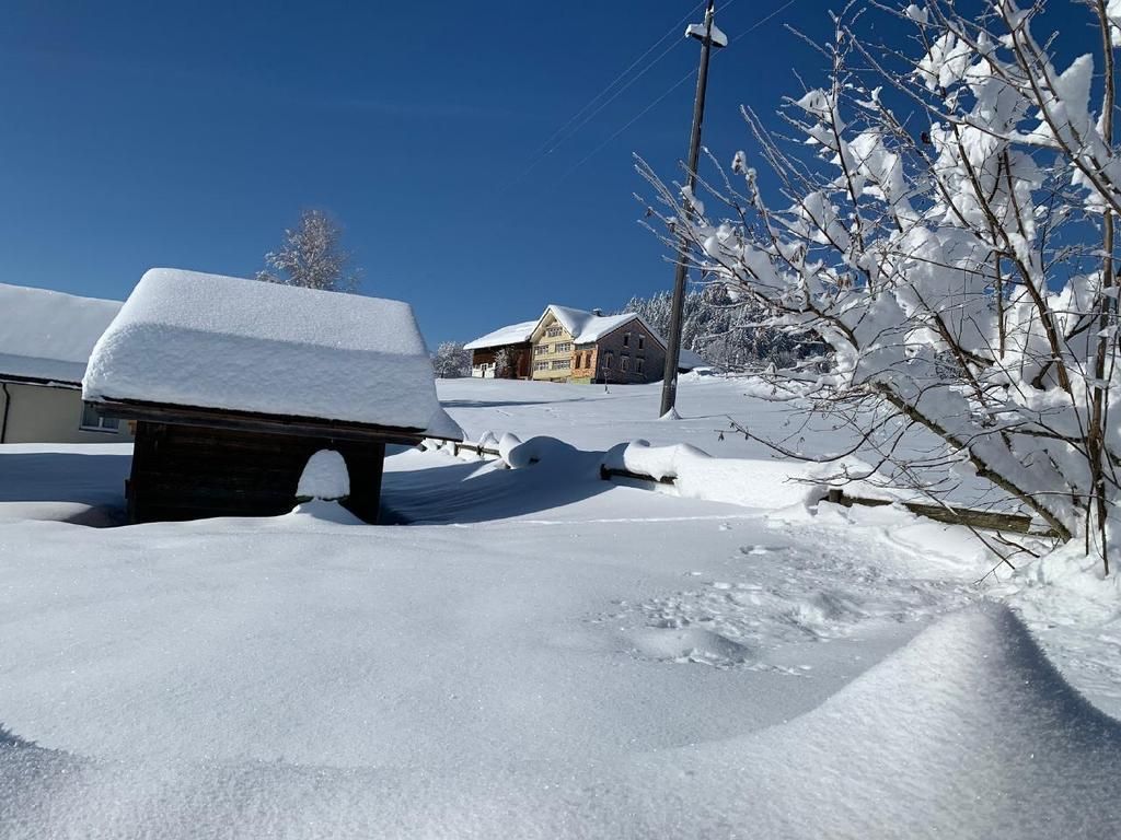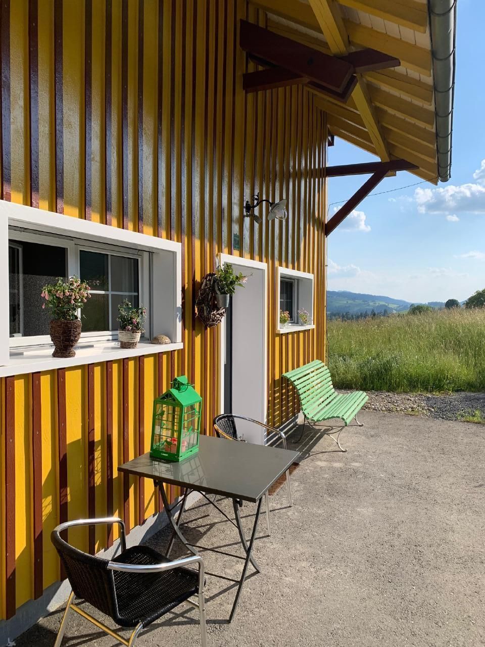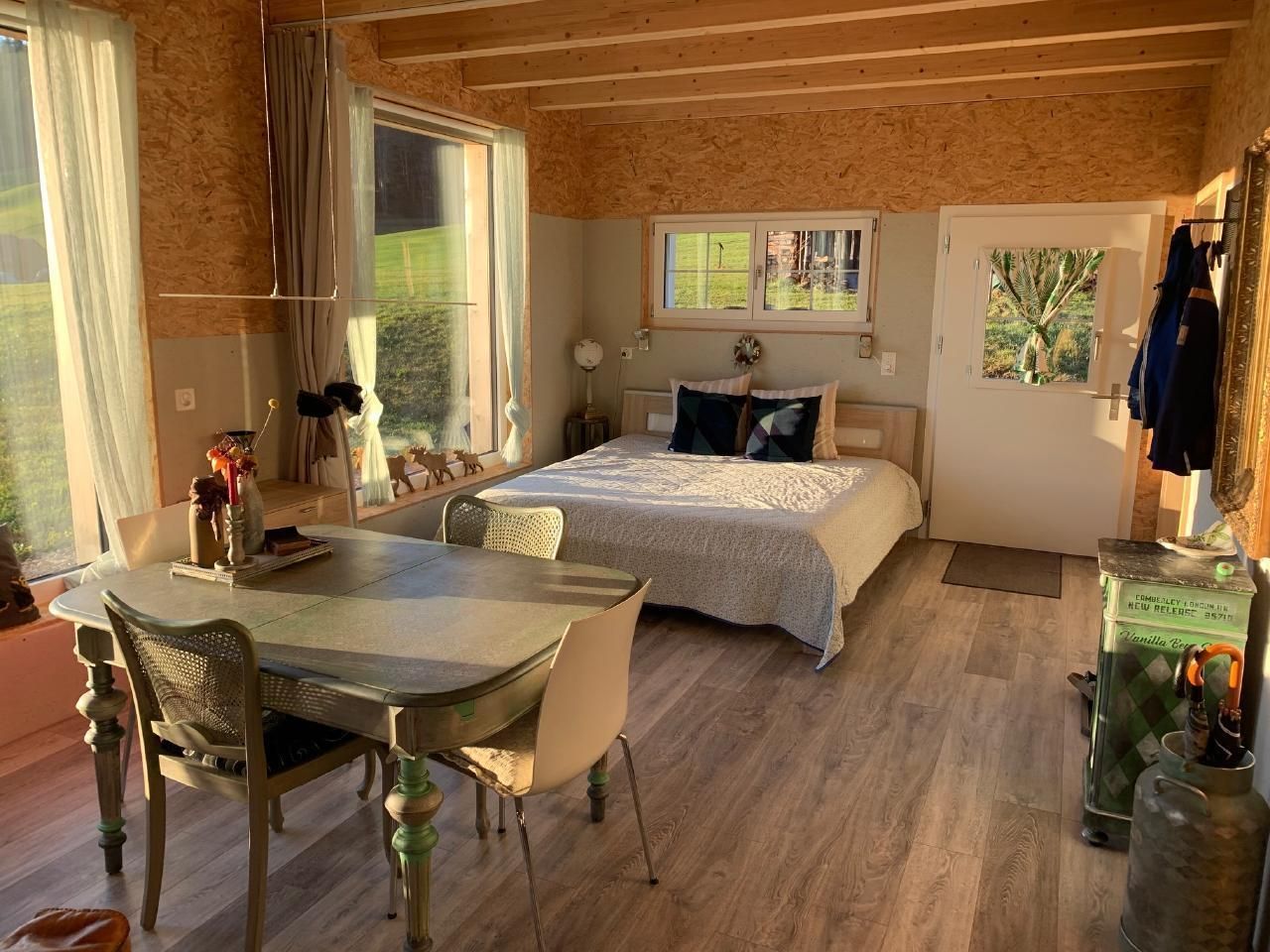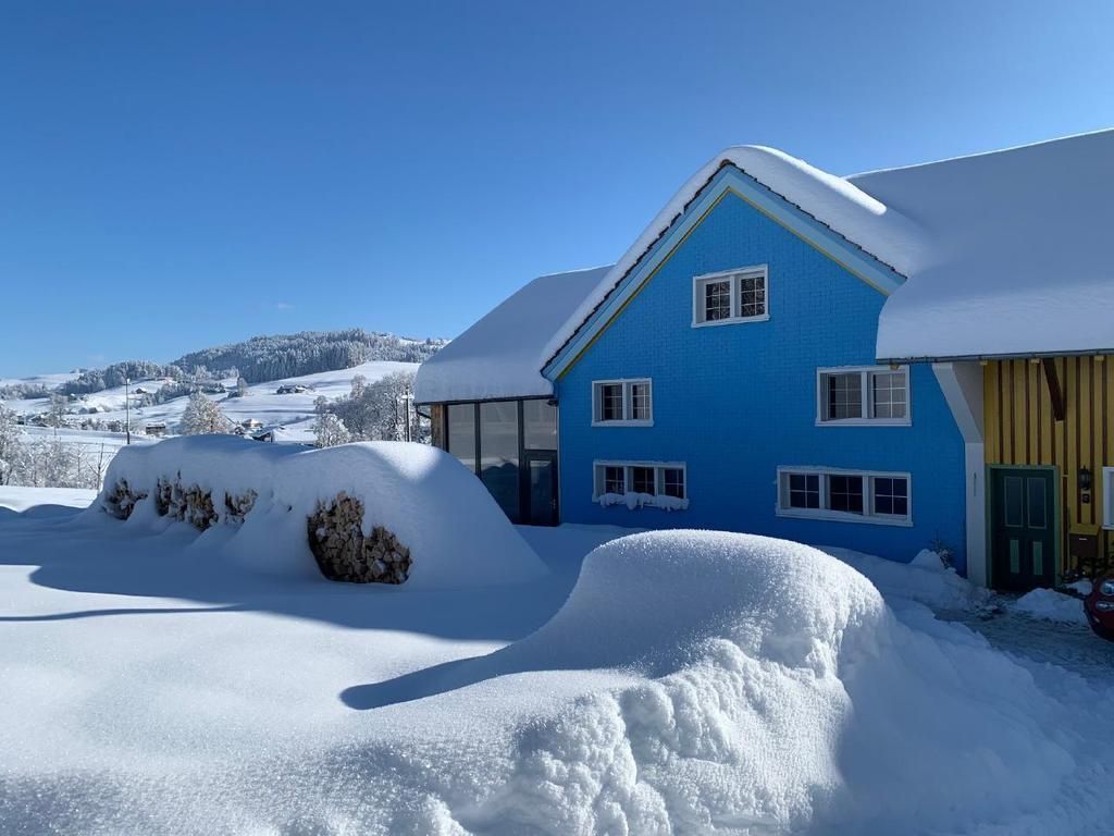 Das im ehemaligen Stall - als separater Hausteil mit eigenem Ausseneingang und Terrassenzugang - eingebaute grosszügige loftige Studio (2.90m Deckenhöhe) gewährt durch seine drei Panoramafenster einen weiten Blick auf die Landschaft (keine unmittelbaren Nachbarn) und nachts auf den Sternenhimmel. Unser Bauernhof ist in Gehdistanz vom Dorf an einer Ortsrandlage mit schöner Sicht auf das Dorf Schönengrund und die Umgebung. Auf der Rückseite mit Blick auf den Jakobsweg wähnen Sie sich auf einer Alp und befinden sich doch in Fussdistanz zur Bäckerei, Metzgerei, Lebensmittelladen und Landi. In unserem Wald mit Bach können Sie sich tagsüber auch zurückziehen. Sind Sie auf dem Jakobsweg unterwegs, erreichen Sie uns zu Fuss in 15 Minuten. Falls Sie mit dem öV anreisen, holen wir Sie gerne an einer der Haltestellen ab.