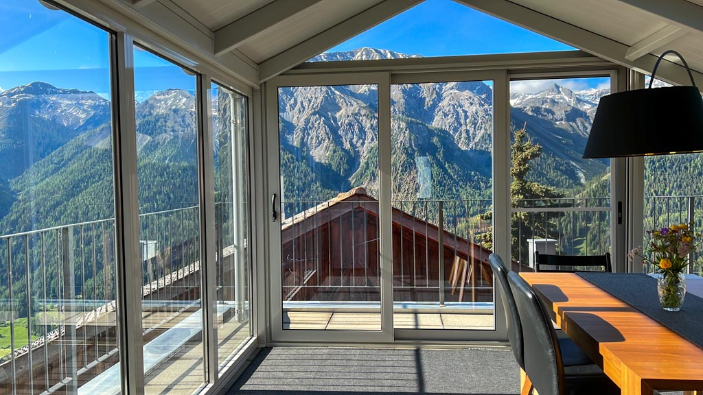 Craistas ist umgeben von einer grandiosen Bergkulisse mit der Ortler Gruppe und dem Cevedale. Von der Terrasse oder aus dem Wintergarten haben Sie einen wunderbaren Panoramablick.