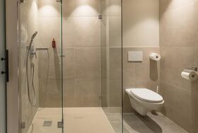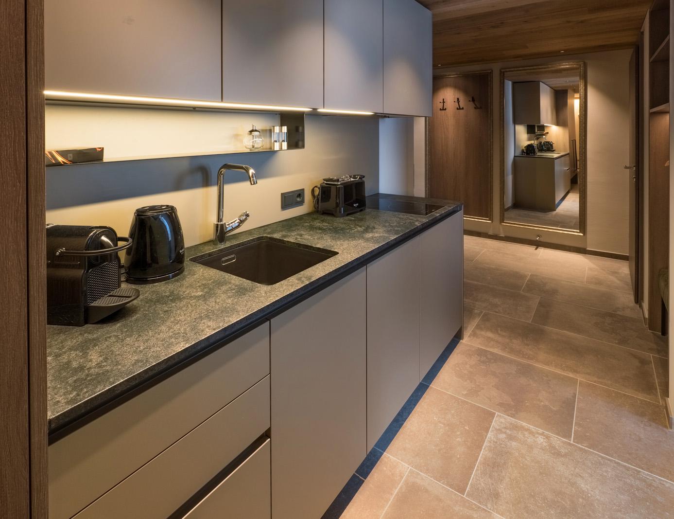 Küchenzeile mit 2 Induktionskochfeldern, Kochutensilien, Standard-Gewürzregal, Mikrowelle, Geschirrspüler, Kühlschrank mit Tiefkühlfach, Kaffeemaschine (Kapsel) Wasserkocher, Geschirr, Besteck, Gläser