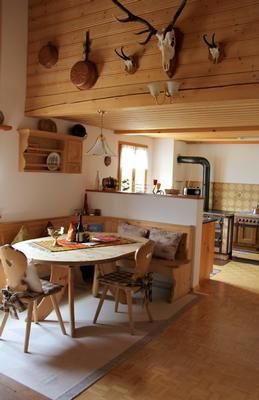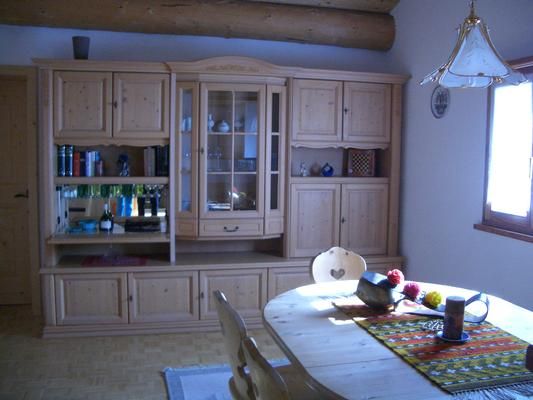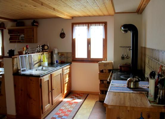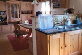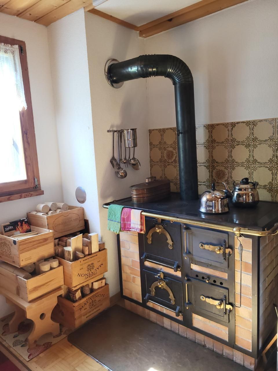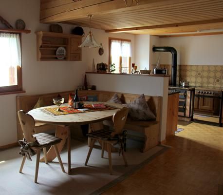Im Inneren der Wohnung gibt es eine offene Küche, ausgestattet mit einem Holzofen und einem zusätzlichen Gasherd (ohne Backofen), ideal für kulinarische Experimente. Ein großer Esstisch mit Eckbank, zusammen mit einer komfortablen Wohnwand, bildet das Herz der Wohnung. Für Ihre Bequemlichkeit steht ein kleiner Abstellraum mit Kühlschrank, ausreichend Geschirr, Gläsern sowie Töpfen und Pfannen bereit. Genügend Holz für den Ofen sorgt für eine gemütliche Atmosphäre an kühleren Abenden. Das Schlafangebot umfasst ein Doppelbettzimmer, ein Einzelzimmer und ein kleines zusätzliches Einzelzimmer, erreichbar über eine offene Treppe.