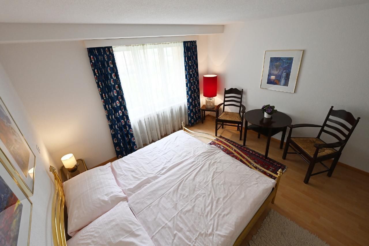 Appartement Alpenblick, 2-Zimmerwohnung, Grundfläche zirka 80 m2, mit Terrasse, an zentraler, sonniger Lage gegen Süd-West mit schöner Sicht auf See und Berge,etwa 100 Meter vom See entfernt, klassifiziert mit 4 Sternen. Die Wohnung verfügt über ein Schlafzimmer mit Doppelbett und Kleiderschrank, TV. Im Wohn-Esszimmer finden Sie einen Esstisch mit 4 Stühlen, Polstermöbel, Telefon, Farb-Kabel-TV. vor dem Wohnzimmer möblierter Terrasse. Auf Wunsch 1 oder 2 Betten im hinteren Teil des Wohnzimmers(Mehrpreis für Belegung durch mehr als 2 Personen, plus Fr. 10.- je zusätzliche Person pro Nacht) . Elektrische Küche mit 4-Plattenkochherd, Kühlschrank mit Tiefkühlabteil, Geschirrspüler, Kaffeemaschine, alles komplett eingerichtet. Badzimmer mit WC, Lavabo, Badewanne und Waschmaschine mit Tumbler. Restaurant und Hallenbad finden Sie im rückwärtigen Haus, Sauna, Biosauna, Solarium und Wärmekabine können mitbenutzt werden. Garage für Gäste mit einem Motorfahrzeug obligatorisch.