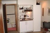 Das Appartement bietet einen effizient organisierten Wohnbereich, der mit zwei komfortablen Betten, darunter ein praktisches Schrankbett, ausgestattet ist. Die kleine Küchennische enthält einen 2-Plattenkochherd, Kühlschrank sowie eine Kaffeemaschine und ist mit allem Notwendigen ausgestattet, um einfache Mahlzeiten zuzubereiten. Eine separate Dusche mit WC rundet das Innenangebot ab und garantiert einen angenehmen Aufenthalt.