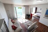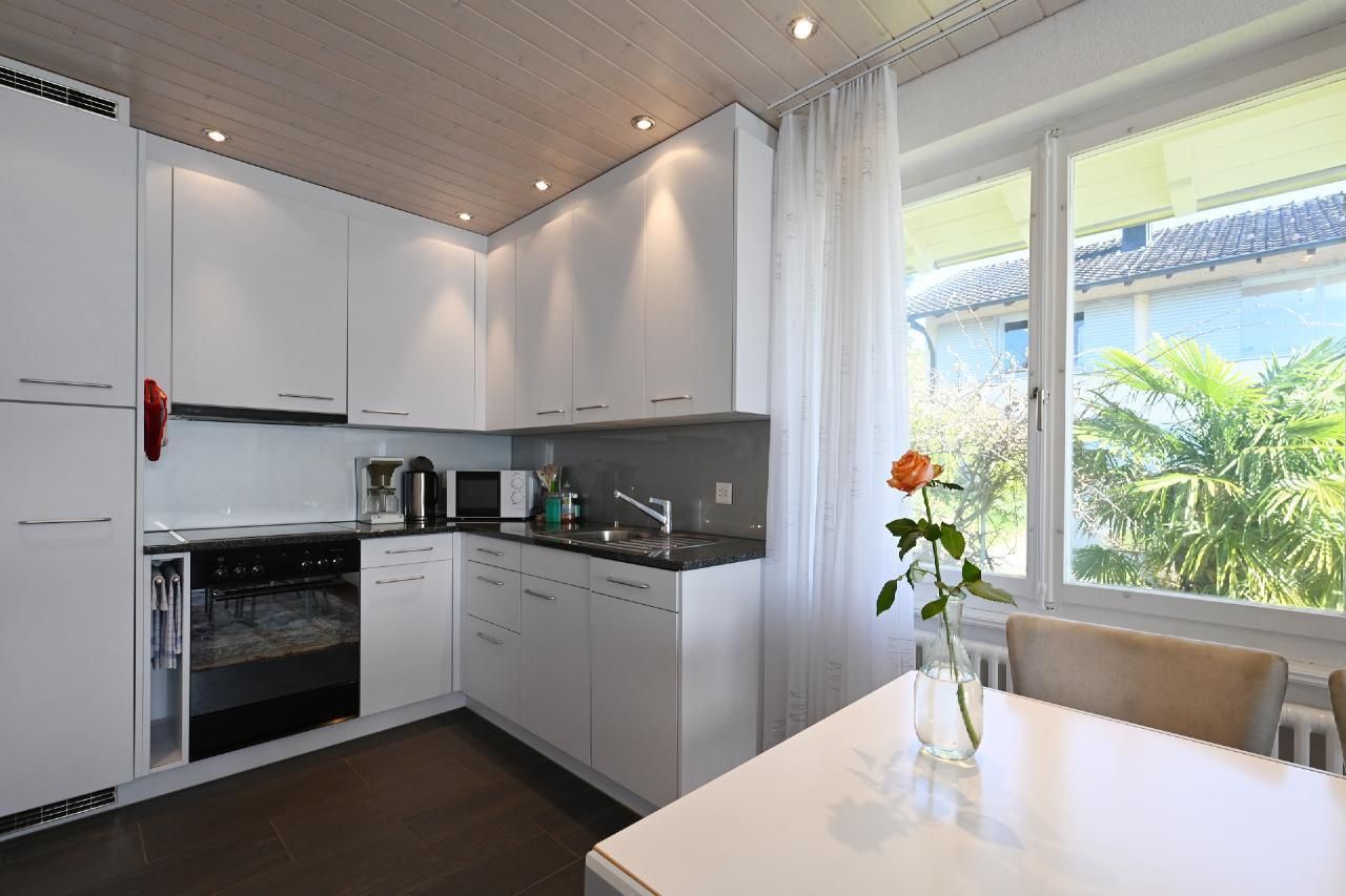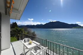 Haus Stirnemann ist durch die Zubringerstrasse vom See getrennt, an ruhiger Lage. 2-Zimmer-Nichtraucher-Ferienwohnung, Grundfläche zirka 66 m2 auf der zweiten Etage mit prächtiger Panoramasicht auf See und Berge. Die Wohnung ist mit 4 Sternen klassifiziert. Die Wohnung umfasst 1 Schlafzimmer mit einem Bett mit 2 Matrazen, grosser Einbauschrank. Wohnzimmer mit Esstisch und 4 Stühlen, Polstermöbel, Radio, Farb-Kabel-TV und Internet. Vor dem Wohnzimmer,möblierter Balkon. Eine offene, elektrische Küche mit 4-Platten Ceran-Kochfeld, Backofen,Kühlschrank mit Tiefkühlabteil, Geschirrspüler, Kaffee- filtermaschine, alles komplett eingerichtet.Dusche-WC mit Waschmaschine. Ein privater Parkplatz, oder Garagenplatz in Einstellhmalle ist für unsere Gäste reserviert Unseren Gästen steht die Liegewiese am See zur Mitbenutzung zur Verfügung.