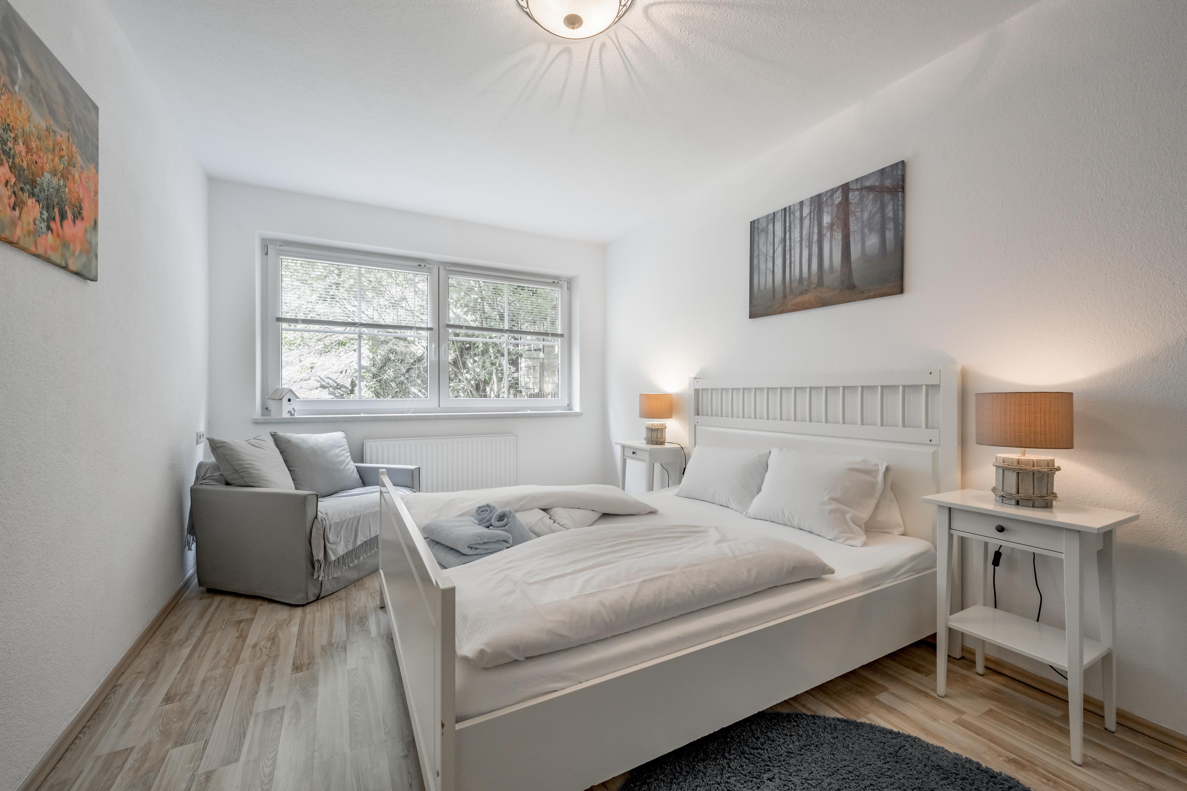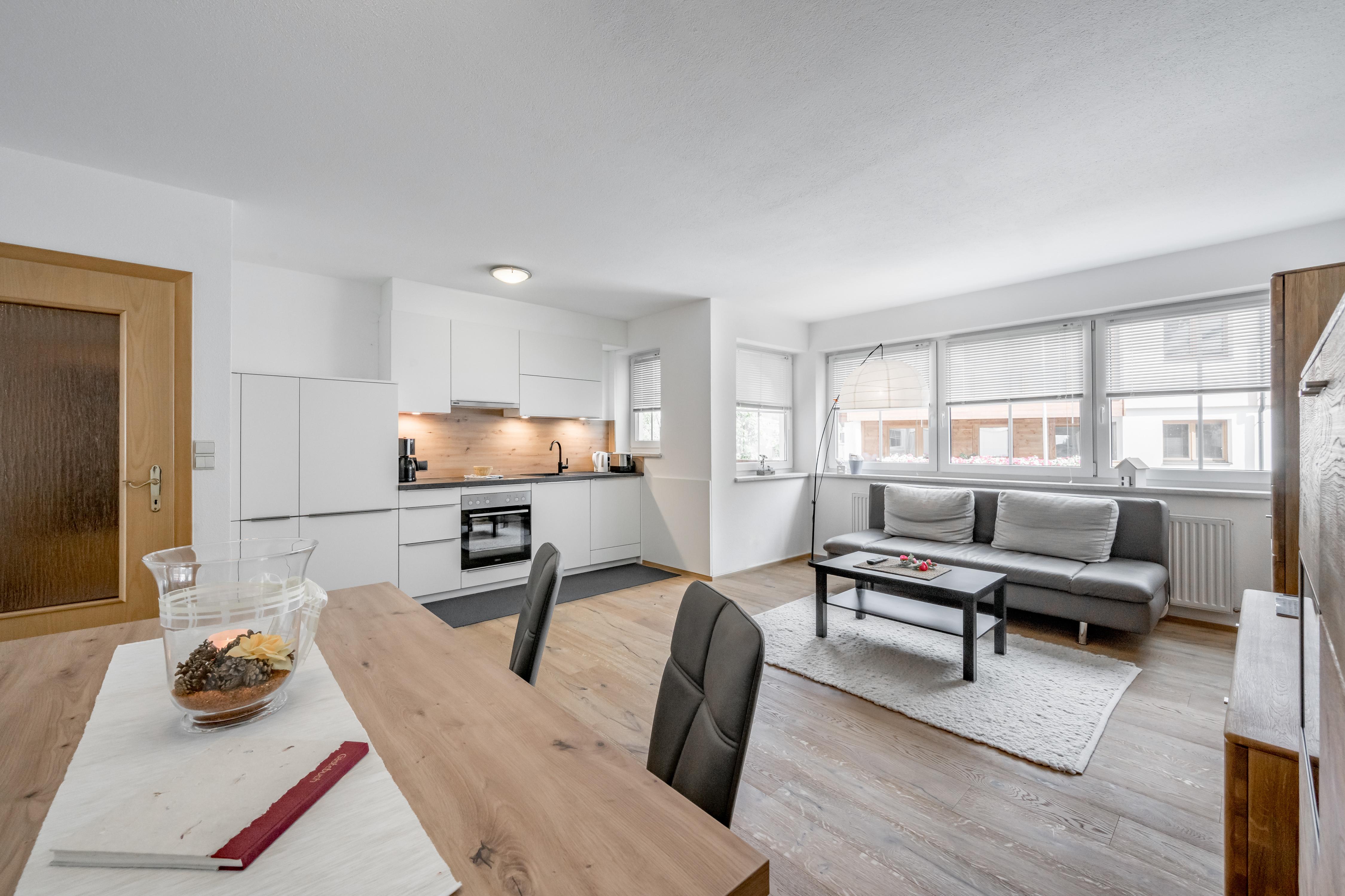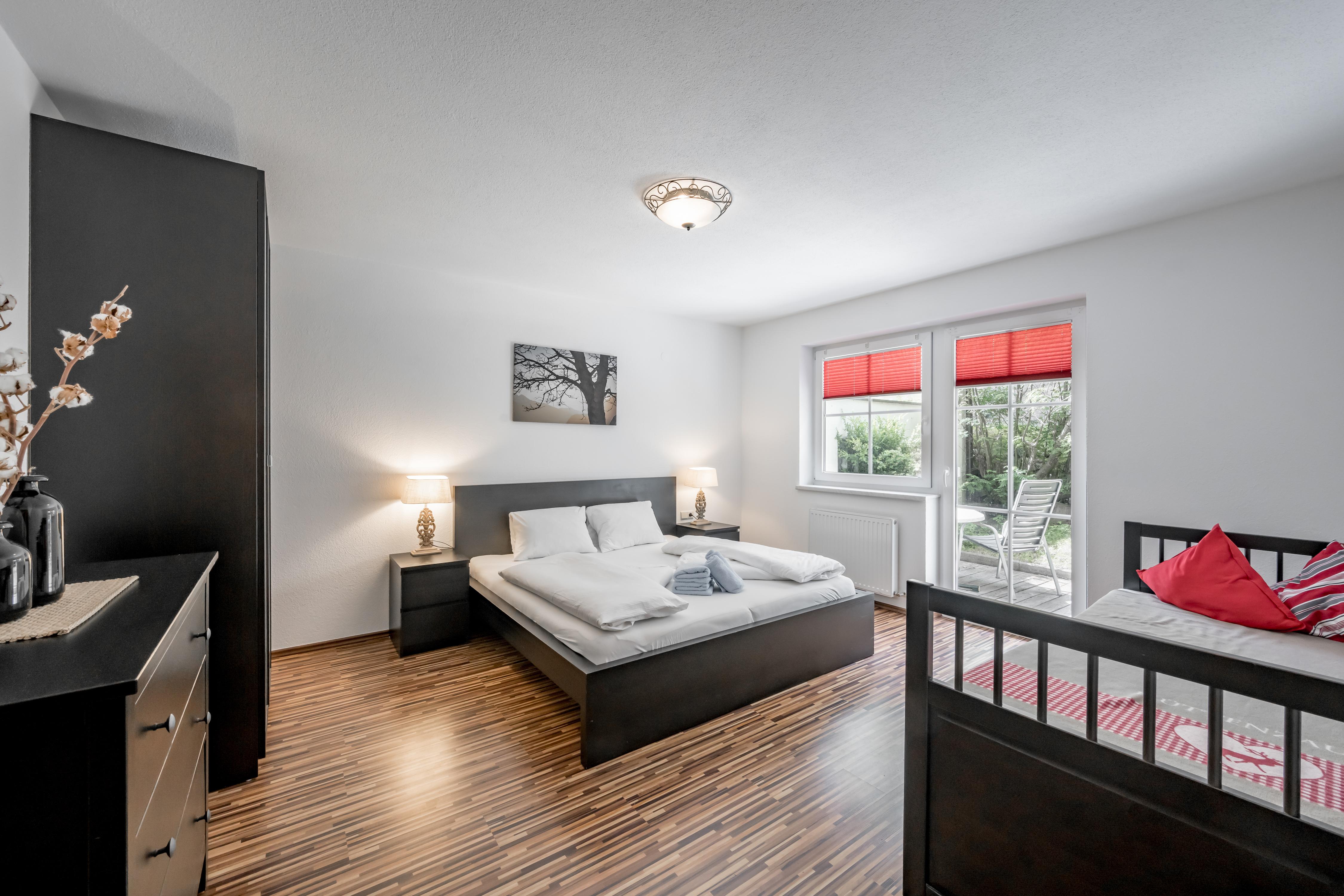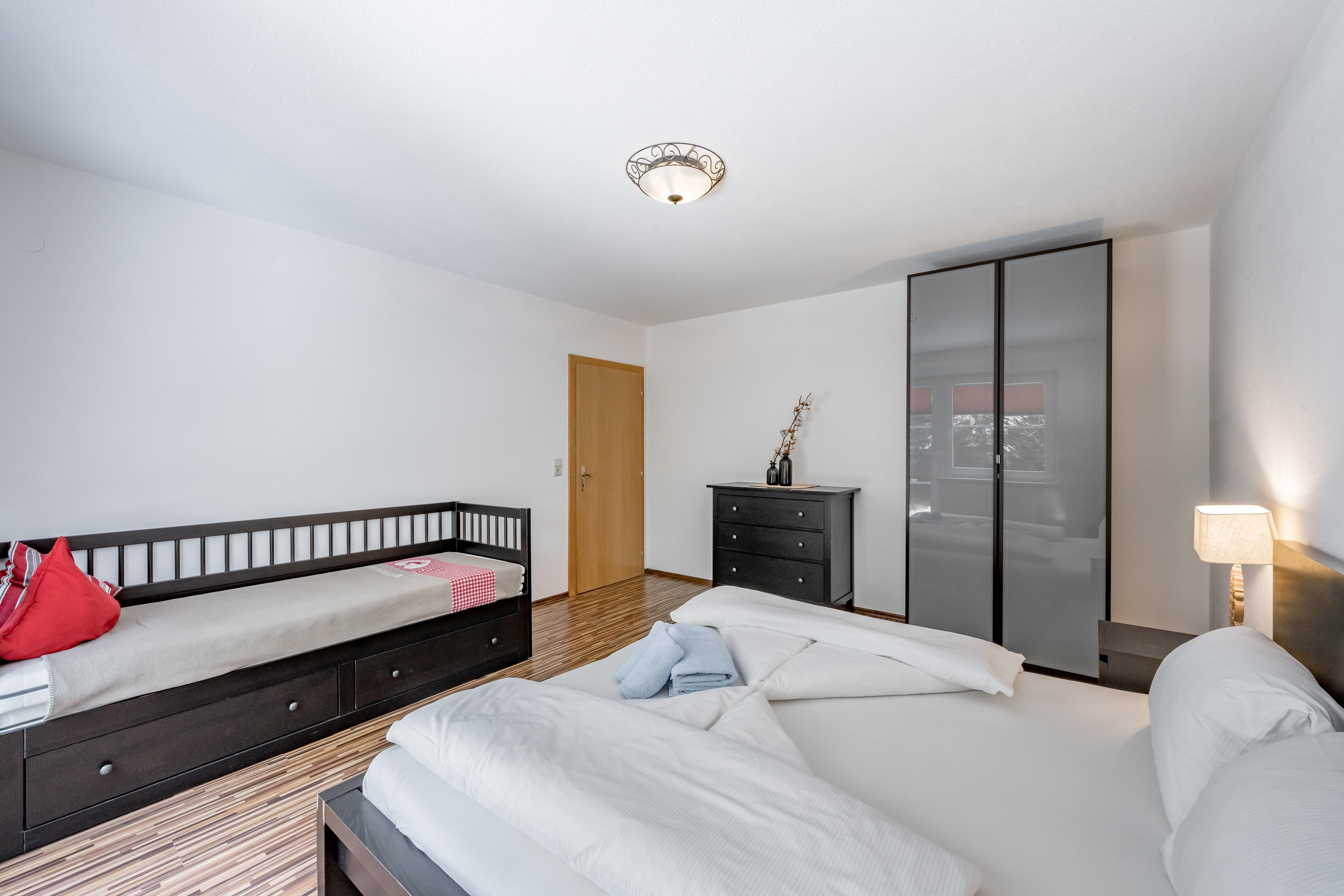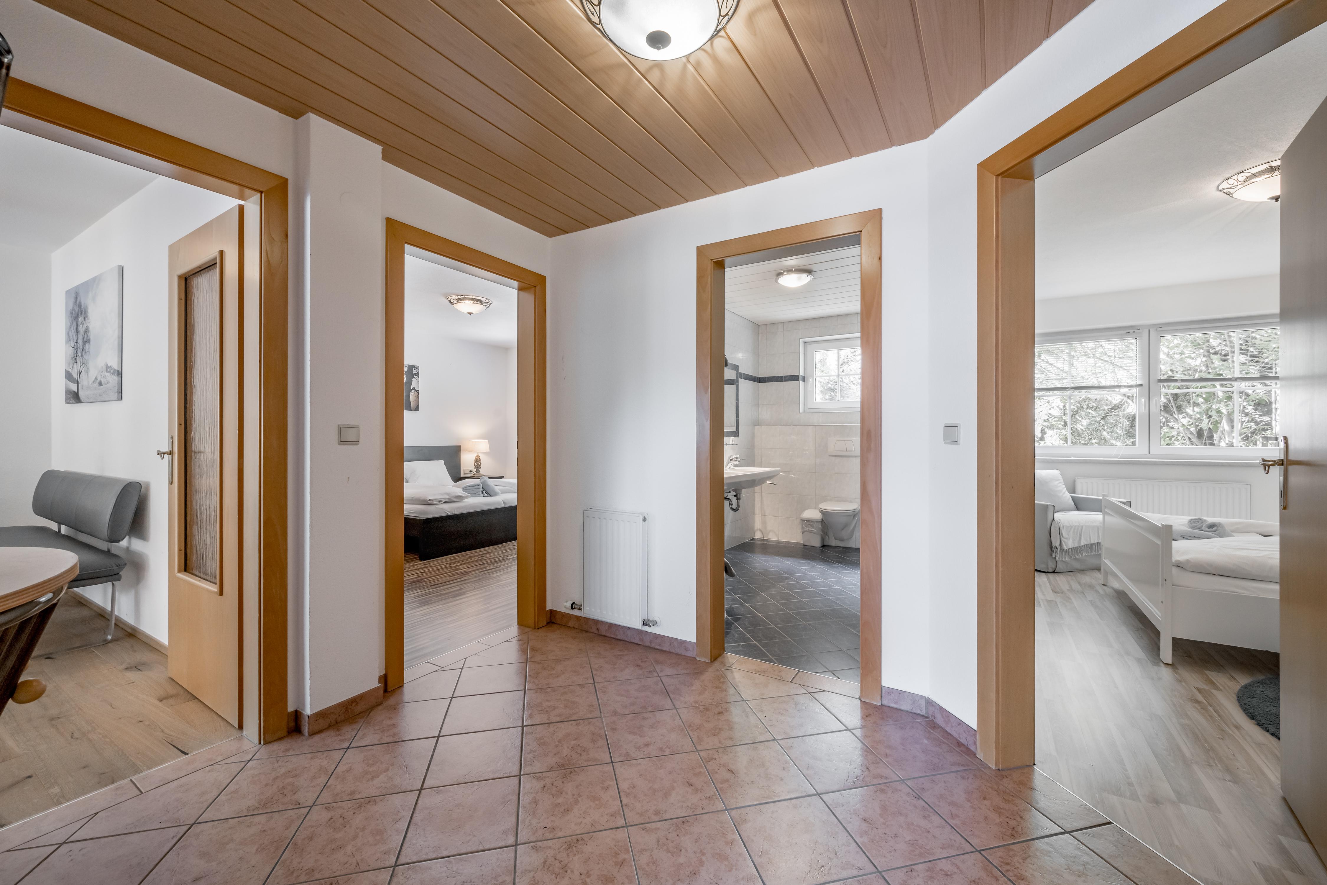 Platz zum Wohlführen: Große 3-Zimmer-Wohnung (ca. 83 m²), Vorraum mit Garderobe, 2 große Doppelzimmer, Fernseher mit Kabel-TV, 1 Wohn-Schlafraum mit Doppelcouchbett und Kabel-TV, Essecke, Küche (4-Platten-Cerankochfeld, Geschirrspüler, Backofen, Mikrowelle, Kühl- und Gefrierschrank, Kaffeemaschine), großzügiges Badezimmer mit Badewanne und Dusche/WC, 1 WC seperat.