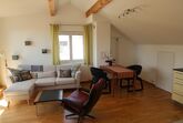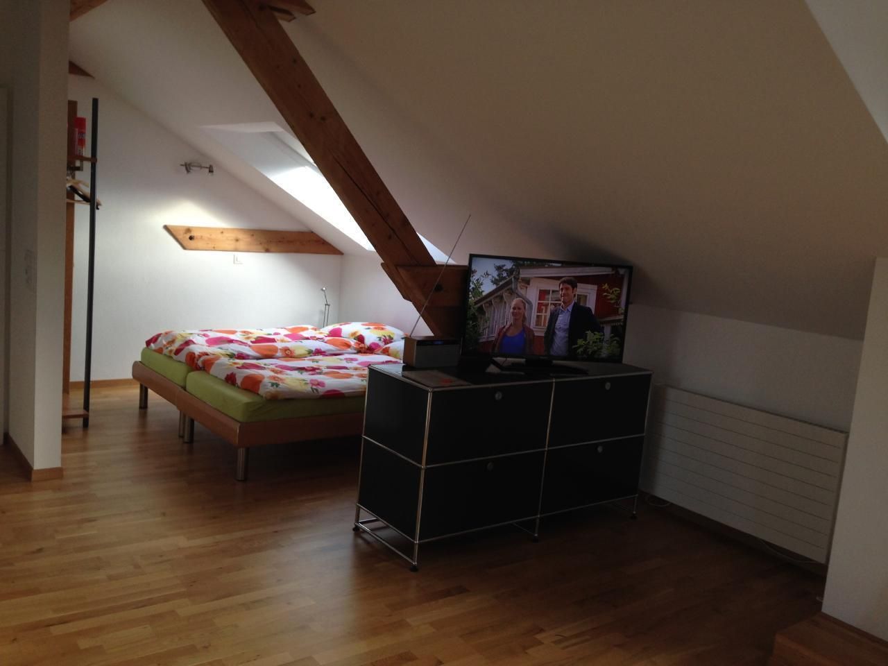 Sonstige Wohnzimmerausstattung (Wohnzimmer1): Gemütlicher Wohnbereich mit Sofa und Tisch. Ganze Wohnung mit Parkett. TV vorhanden. Internet (w-lan) kostenlos verfügbar. Zugang zum privaten Dachbalkon mit Berg- und teils Seesicht sowie mit Sicht auf die historische Stadtmauer Luzerns.