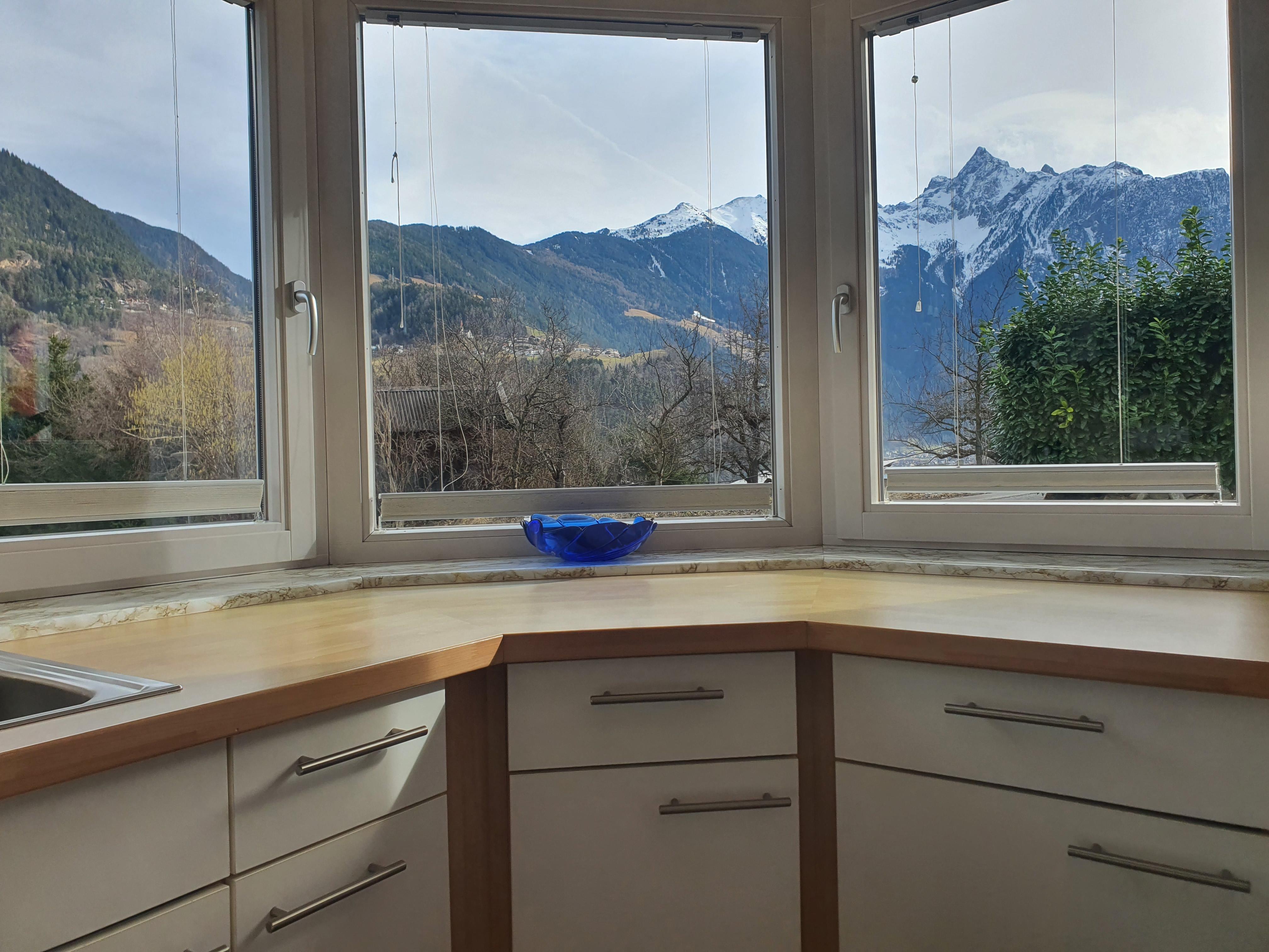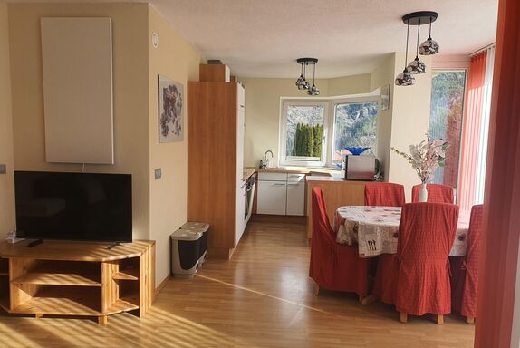 Das Appartement mit ca. 65 m² und eigenem Eingang befindet sich im Parterre und besteht aus: 2 getrennten Schlafzimmern, 1 großen Wohn-Essbereich mit komplett ausgestatteter Wohnküche (Geschirrspülmaschine, Mikrowelle, Kaffeemaschine, Waschmaschine uvm.); möblierte Terrasse; die großen Terrassentüren sowie der Esserker gestatten einen herrlichen Panoramablick auf die umliegende Bergwelt; eine fünfte Person kann auf Anfrage dazugebucht werden