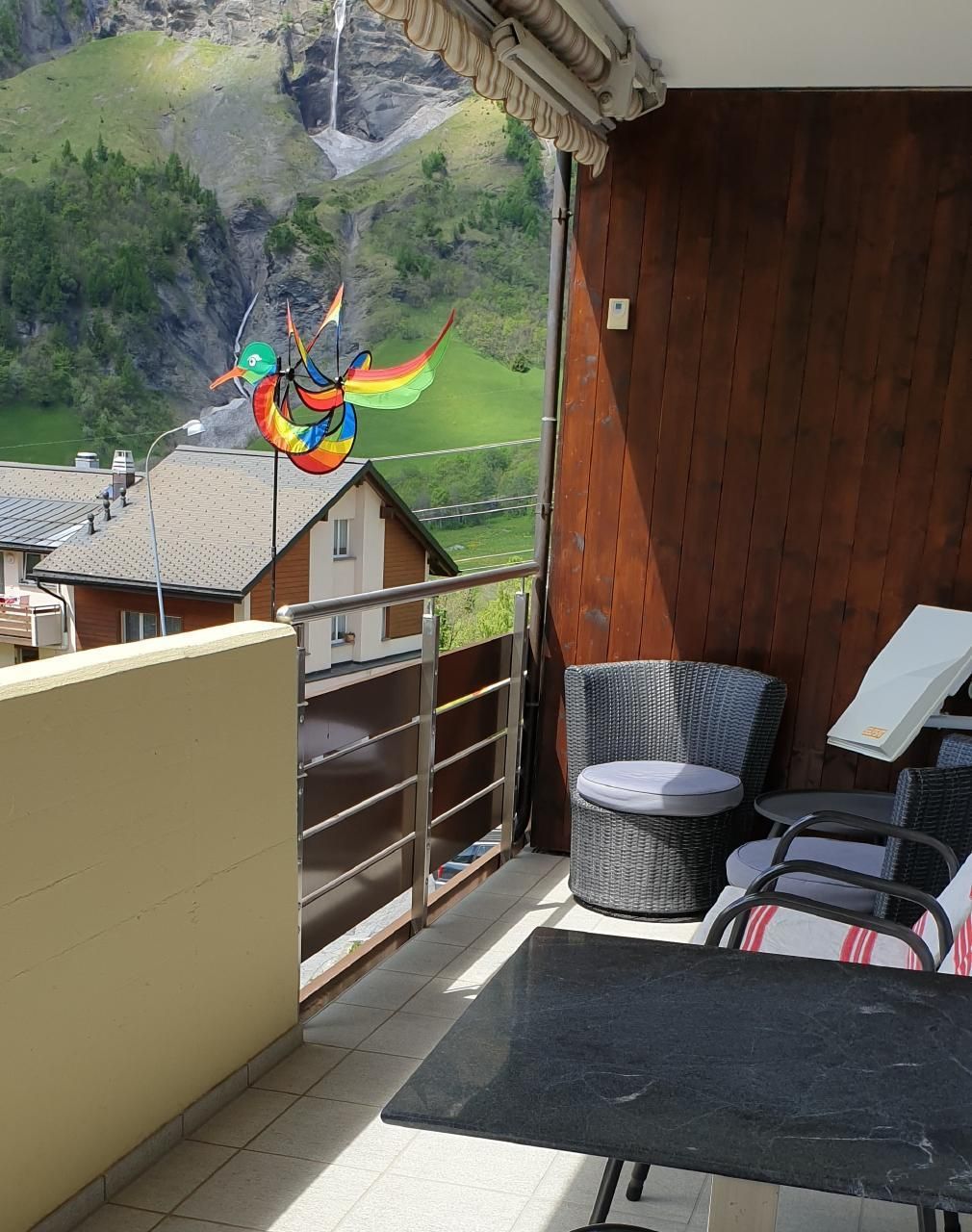 Die Wohnung öffnet sich auch nach außen hin: Ein Balkon mit traumhafter Aussicht auf Leukerbad lädt zum Verweilen ein. Mit insgesamt sieben Betten, einem zustellbaren Kinderbett und einem Hochstuhl auf Anfrage bietet diese Unterkunft genügend Platz für die ganze Familie. Der Außenbereich wird durch eine nicht direkt verbundene Einstellhalle ergänzt, die während der Sanierungszeit des Parkhauses vom 22. April bis 4. Juli 2025 nur eingeschränkt zur Verfügung steht.
