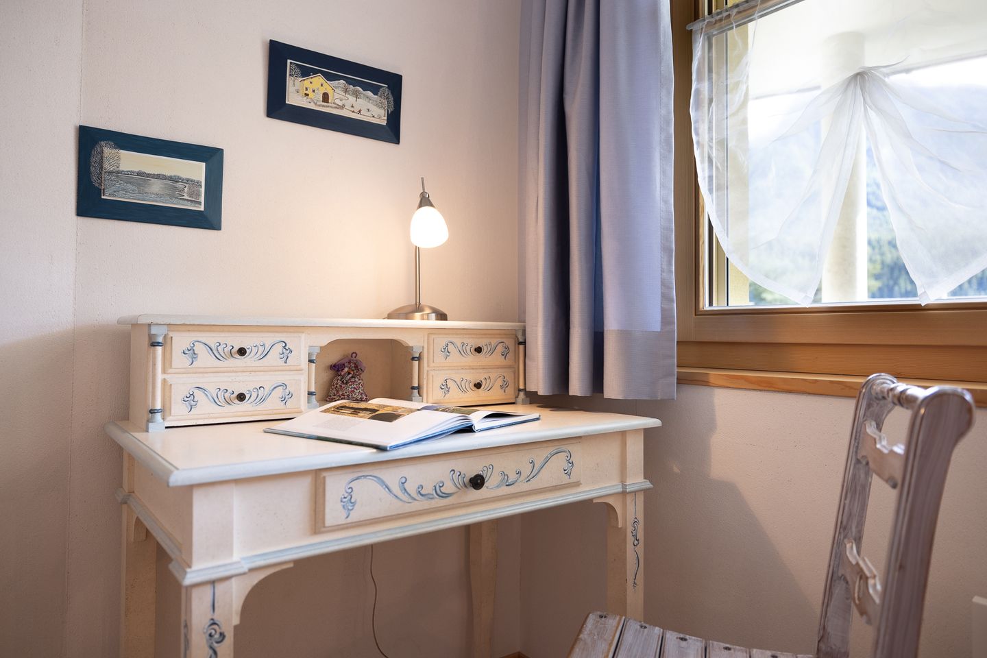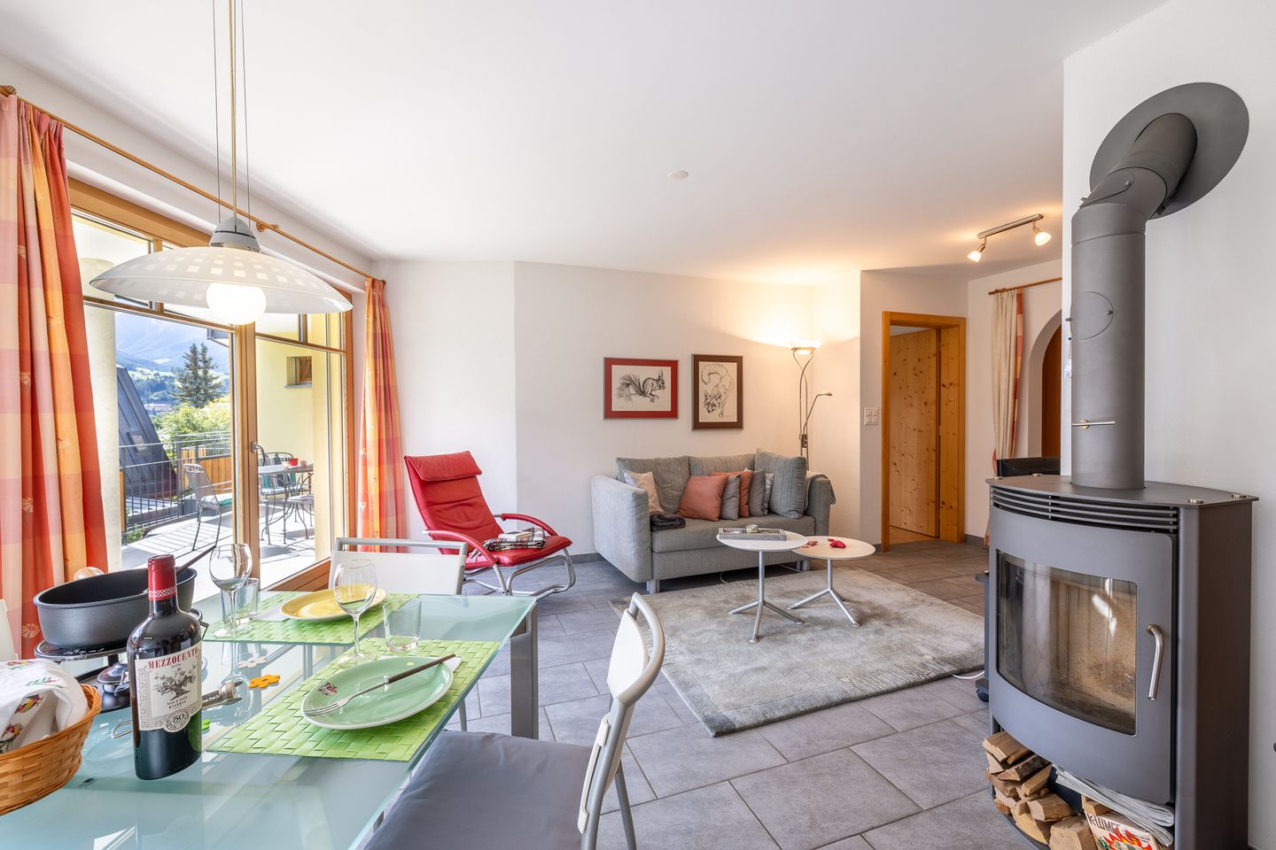 Die Ferienwohnung Trü-Sura Nr. 7 verfügt über eine helle Wohnstube mit benutzbarem Schwedenofen und Ausgang zum grossen Südbalkon (14m2) mit Panoramablick. Grosszügige Küche mit Geschirrspülmaschine, Doppelschlafzimmer, Dusche/WC/Lavabo. Nespresso-Kaffeemaschine, Flat Screen-TV mit SAT-Empfang, JBL-Tuner (DAB-Radio und Bluetooth-Funktion zum Abspielen von Musik ab dem Smartphone), Gratis-WLAN u.v.m.