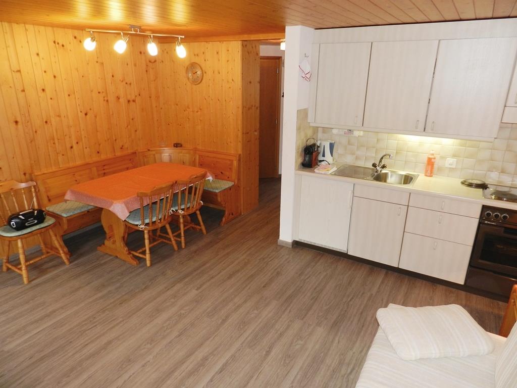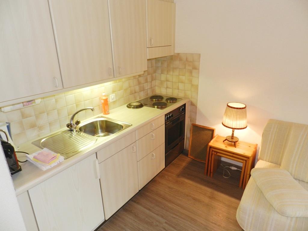Wohnzimmer mit Essecke, Ausziehsofa (2x80x200cm), TV/Radio/CD und offener Küche (u.a. ausgestattet mit Keramikherd, Backofen, Kühlschrank mit Gefrierfach und Kapsel-Kaffeemaschine (Nespresso) sowie Fondue-Set,). 1 Schlafzimmer mit 1 Doppelbett (2x80x200cm) und Kleiderschrank. 1 Badezimmer mit Badewanne und WC.